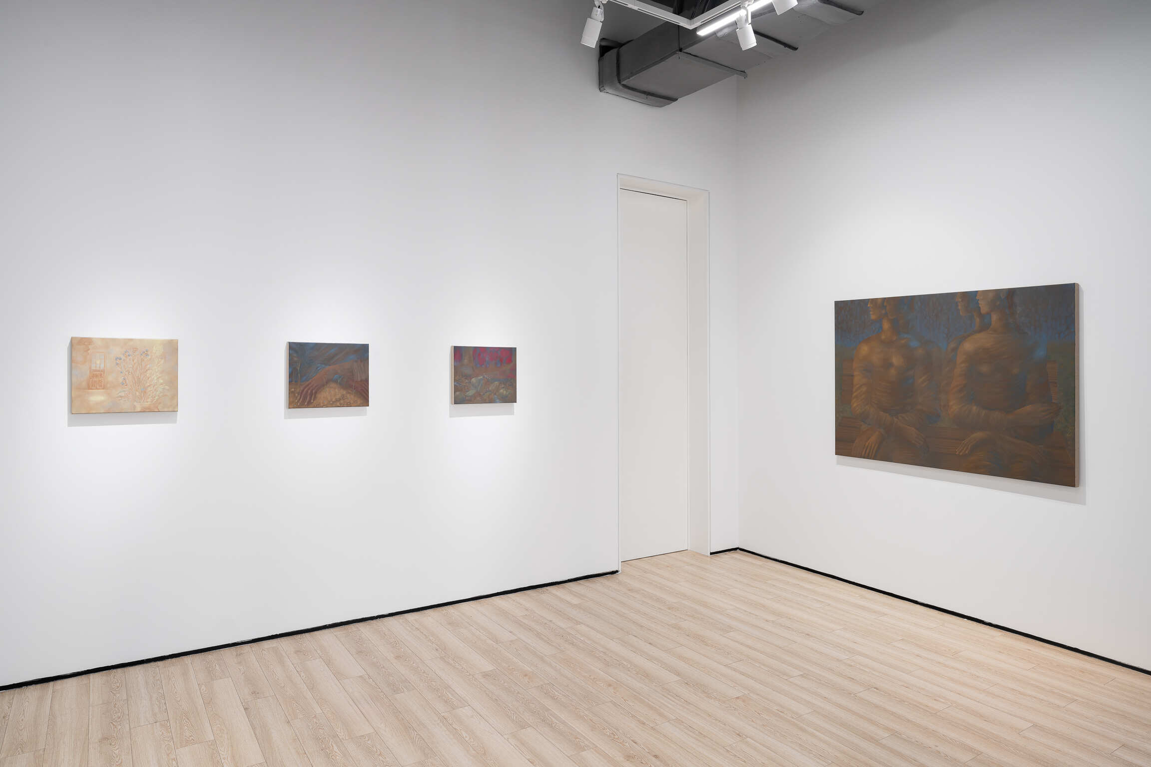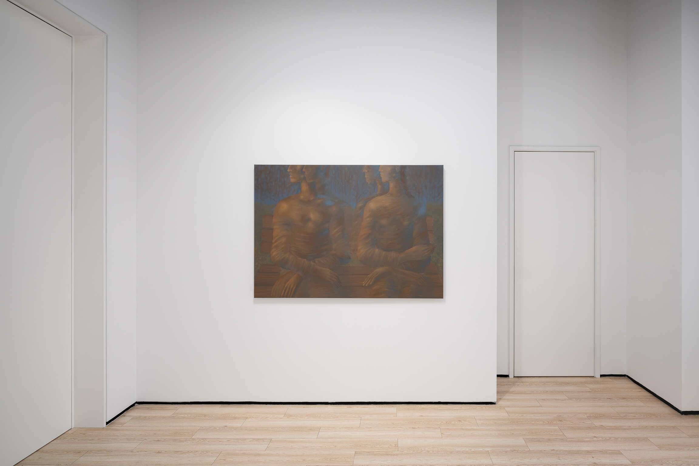 Is it nightfall that gives us the feeling of moving from one painting into another? In Fabien Adèle’s paintings, we sometimes find positions of hands that seem Mannerist and faces in profile as if cut off before speaking. A sense of expectation is created. The artist often produces several versions of the same composition, so that he can adapt to what happens on the canvas, letting his intuition take on different tones. With Deux Figures sur un Banc I and II (“Two Figures on a Bench”) the scene can be tinged with twilight in a russet blue that recalls Leonor Fini, or it can take on a pale yellow dawn with shades of gray in the style of Puvis de Chavanne. The artist is unafraid of doubles, seeing them as a chance for passages, transitions. A shadow becomes flesh, a body becomes a silhouette, in a process of inversion. The artist does not work in series but in echoes, repeating motifs in different versions with particular palettes inscribing phases of earthy ocher or ethereal sand. There are no oppositions between large works and small ones, or between one subject and another, but continuity. Through fragmentation, some motifs acquire an independence that makes them almost into symbols, like the hand surrounded with young shoots in Entre Deux Grains de Sable (“Between Two Grains of Sand”) or the foot that almost crushes fruit lying on the ground in Dernière Nuit. Other subjects, by association, evoke a rebus or even a mystery, like the couples on benches, who seem to hold themselves in an indeterminate dreamlike state.