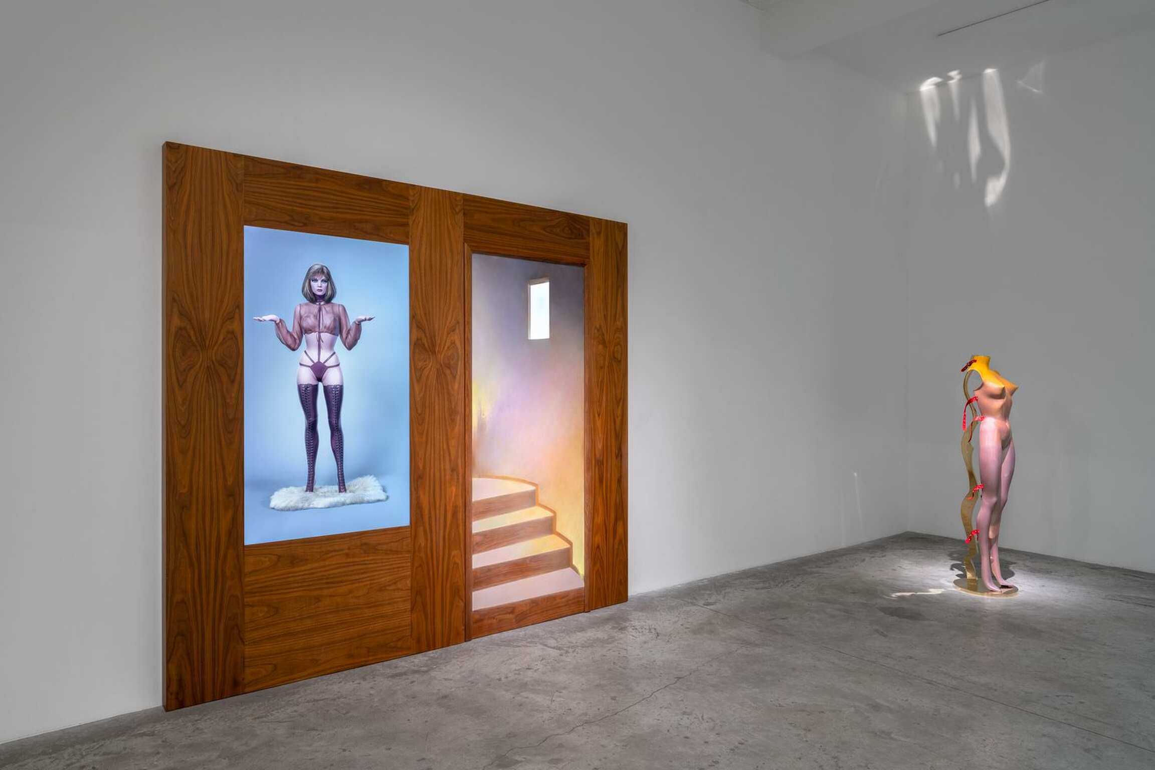 L'éventail des inventions de Jones, de l'abstraction épurée à l'hyperréalisme, s'est longtemps incarné de manière particulièrement puissante dans les pôles de sa sculpture. Ses célèbres femmes-meubles de 1969 – des figures féminines grandeur nature, ressemblant à des mannequins, qui s'utilisent, de manière provocante, comme une chaise, un porte-chapeau ou encore une table – sont tout aussi saisissantes aujourd'hui qu'à l'époque où elles ont été créées. Dans le panneau de gauche de In Camera (2020), cette même figure debout, conçue aujourd'hui comme une animation vidéo, semble avoir pris vie comme une créature robotique plus troublante dans sa gamme de mouvements que les zombies qui peuplent le livre de science-fiction satirique Les Femmes de Stepford d'Ira Levin (1972). Le panneau de droite représente l'escalier menant à la salle de consultation utilisée par Sigmund Freud dans la maison où il a résidé pendant 47 ans, Berggasse 19, à Vienne, sa ville natale, ouverte au public depuis 1971 sous le nom de Musée Sigmund Freud. Ce passage étroit, par lequel les patients pouvaient entrer discrètement pour aller dévoiler leurs pensées et leurs fantasmes les plus secrets, a été peint à partir d'une photo prise par Jones lui-même. Cet espace privé et sobre nous invite vers l'étrange apparition qui nous attend sur le palier, comme la matérialisation d'un rêve tour à tour séduisant et dérangeant. Un artiste surréaliste s'est-il jamais approché aussi près de l'expression du concept d'étrangeté de Freud ? En nous attirant dans le vide, en nous confrontant aux complexités de nos propres vies imaginaires infiniment variées, Jones nous laisse délicieusement en suspend, comme toujours, entre la réalité tangible et immédiate de l'existence matérielle et le spectacle évanescent et inexplicable ancré dans l'imagination humaine.