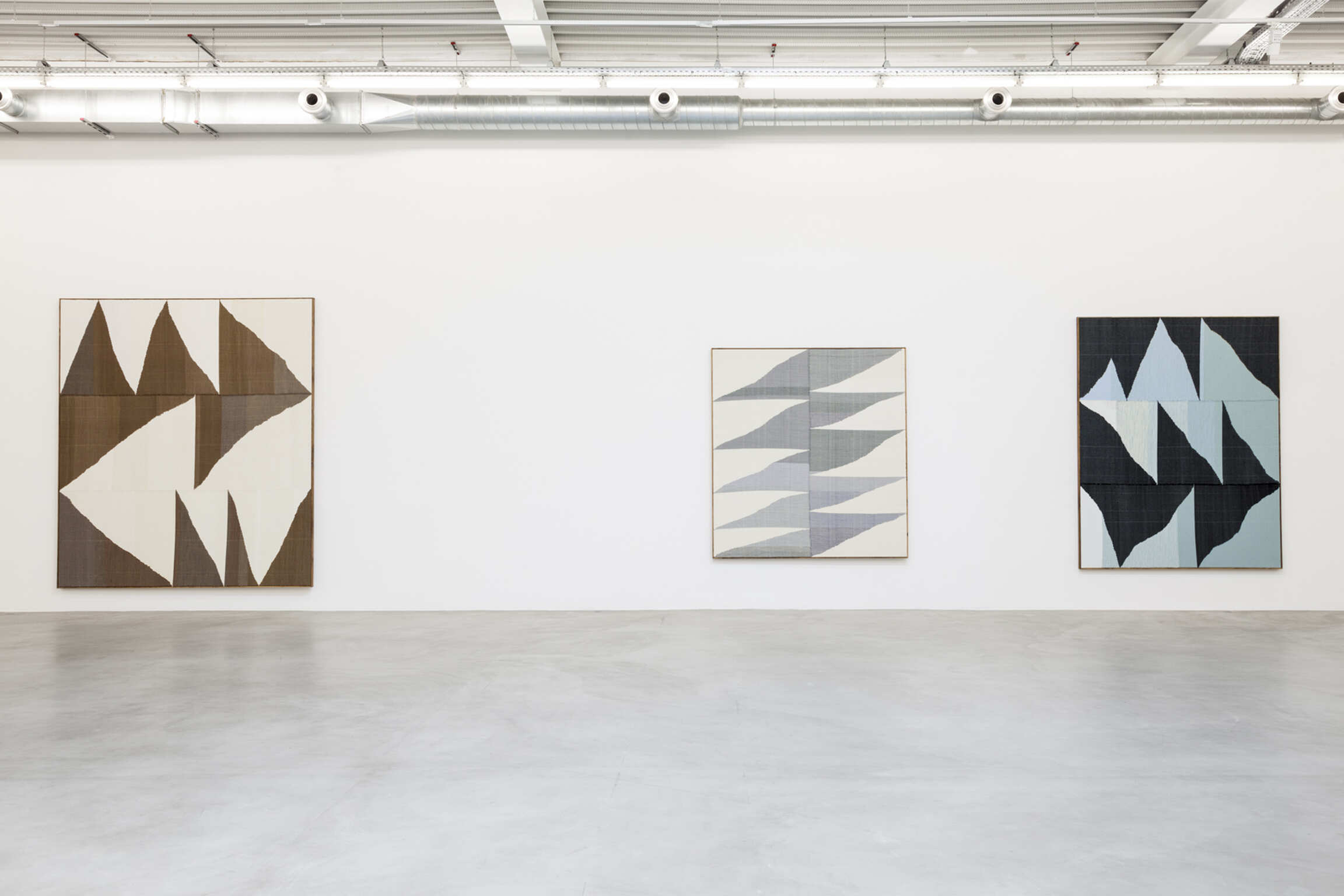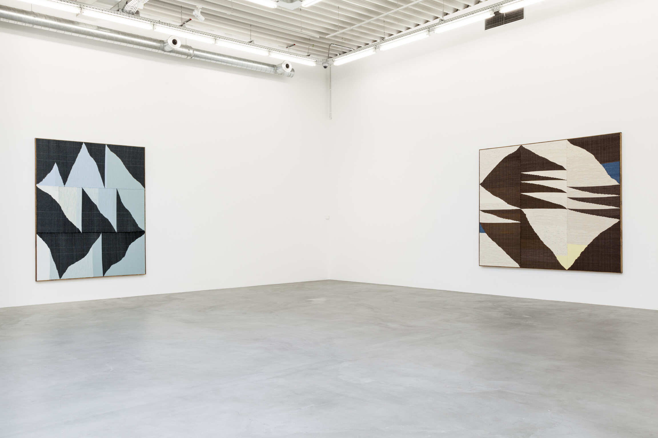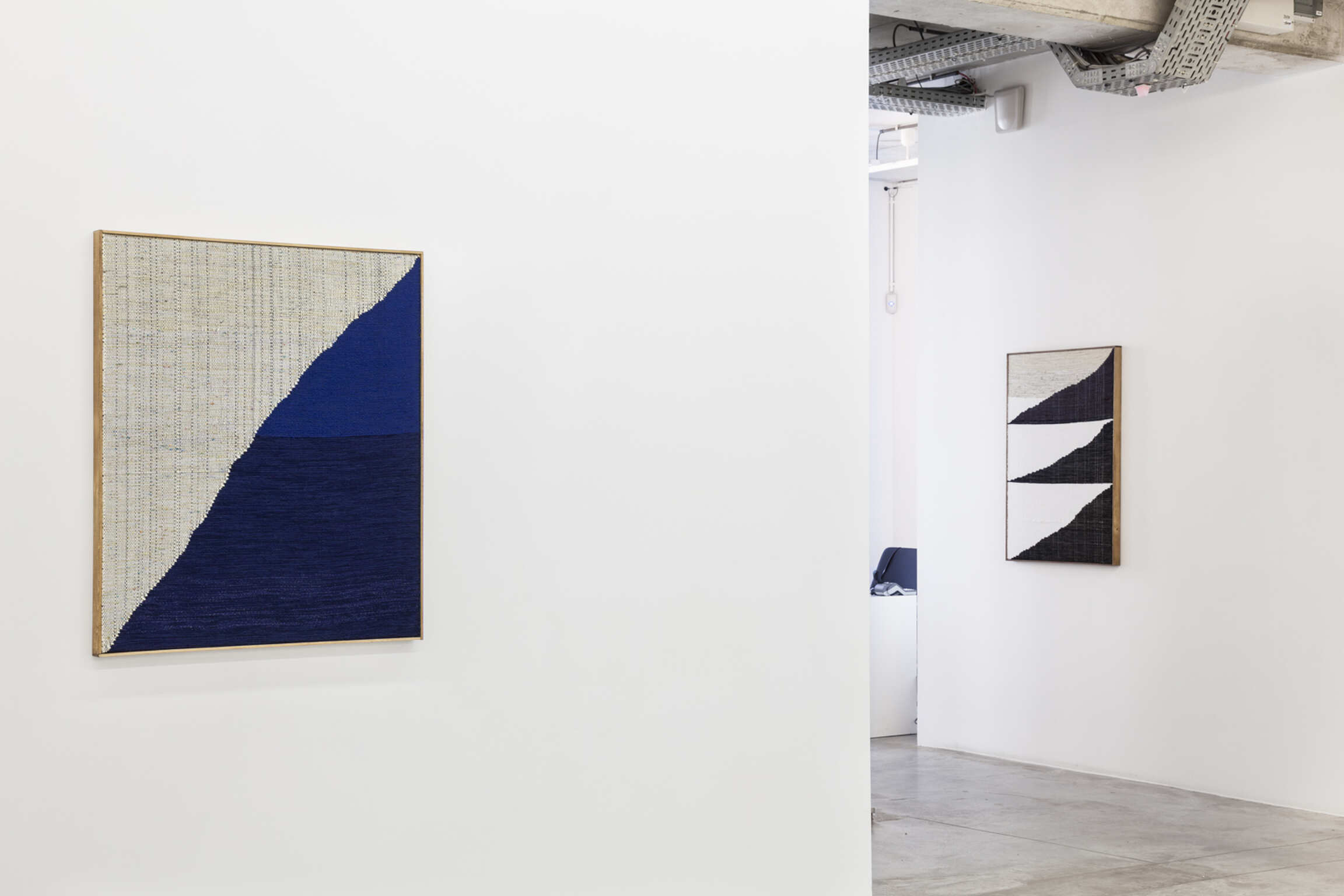 The punk rock movement and Wadden’s form of anti-consumerist creativity share rejection for immediate, cheap and disposable commodity culture. An often overlooked aspect of the punk aesthetic was a visual emphasis on reusing discarded goods and prolonging the life span of ephemeral material. Wadden weaves tactically rough geometric abstract tapestries constructed from second-hand synthetic and natural textiles. He sources his material from today’s cyber and real world last stop shops, such as eBay, Craigslist and thrift-stores.[…]