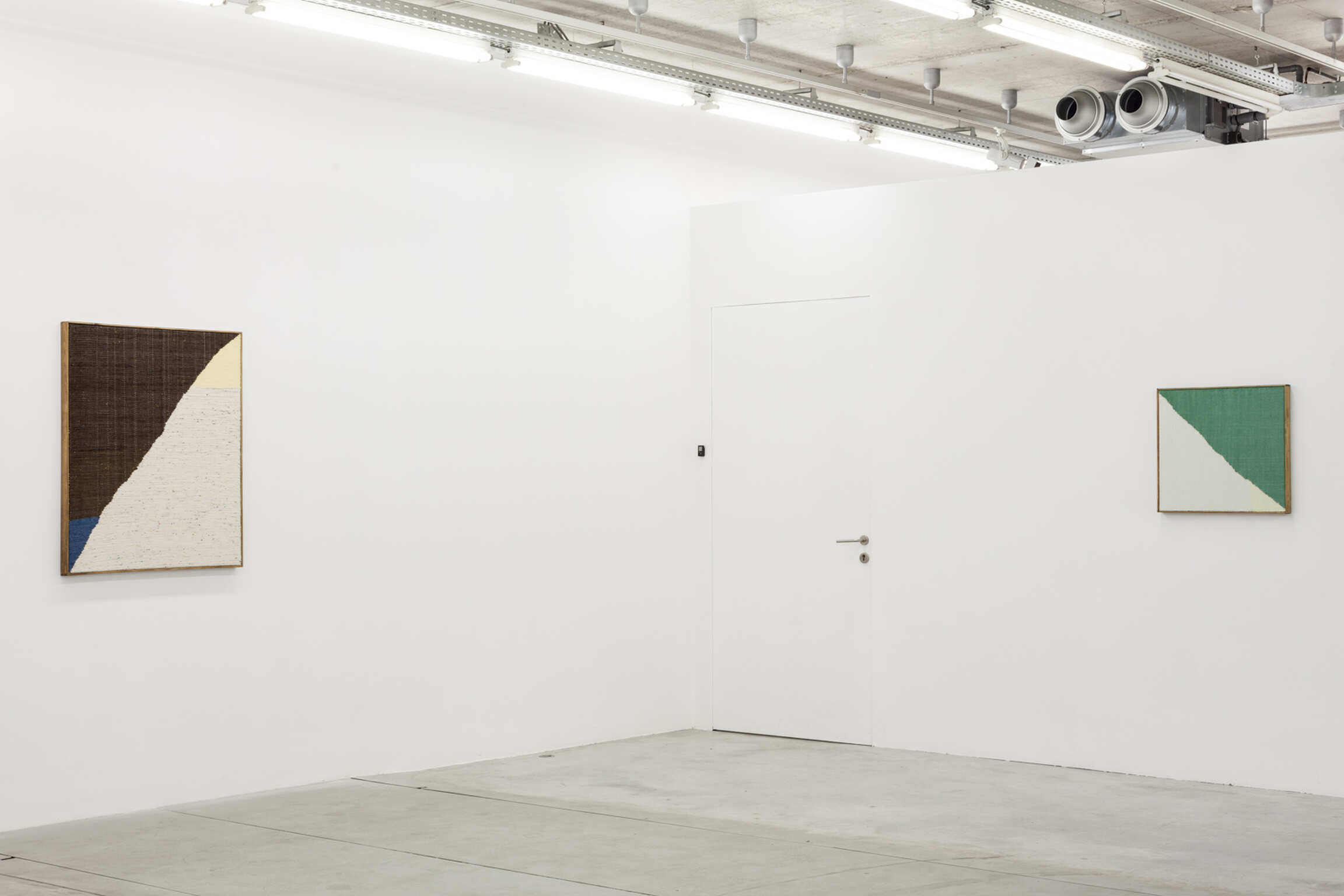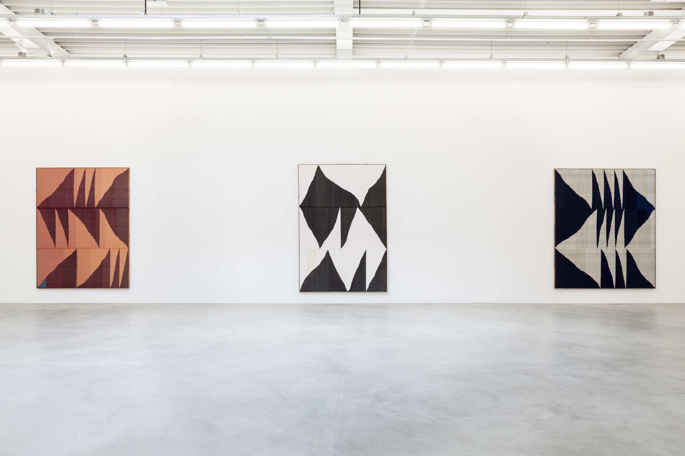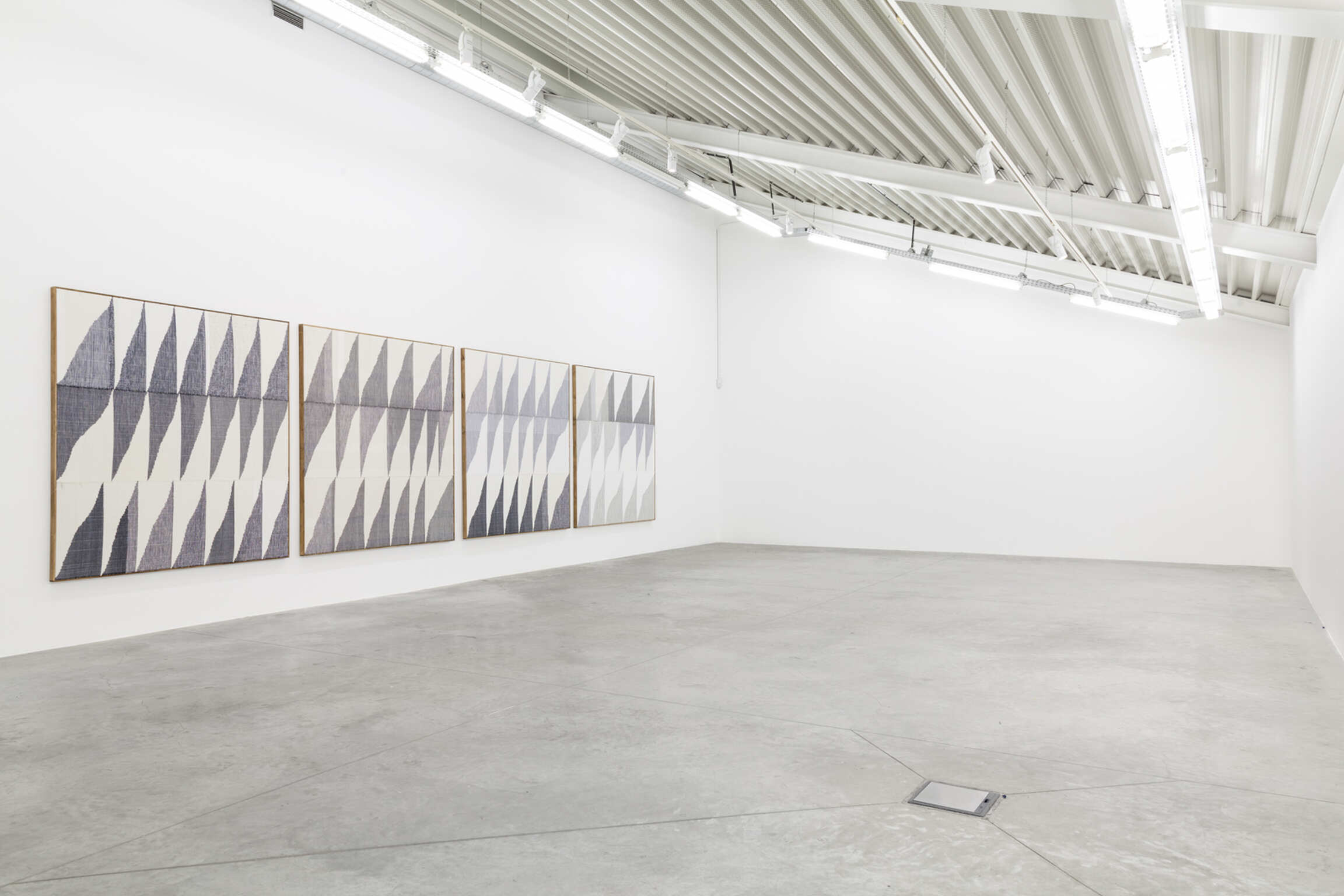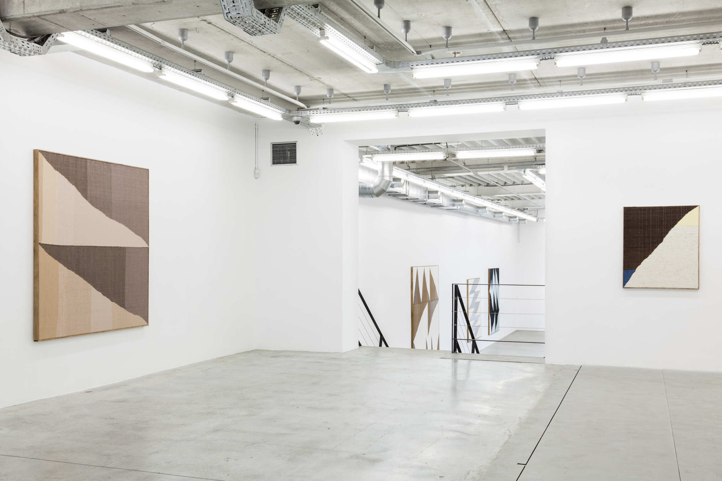 The punk rock movement and Wadden’s form of anti-consumerist creativity share rejection for immediate, cheap and disposable commodity culture. An often overlooked aspect of the punk aesthetic was a visual emphasis on reusing discarded goods and prolonging the life span of ephemeral material. Wadden weaves tactically rough geometric abstract tapestries constructed from second-hand synthetic and natural textiles. He sources his material from today’s cyber and real world last stop shops, such as eBay, Craigslist and thrift-stores.[…]