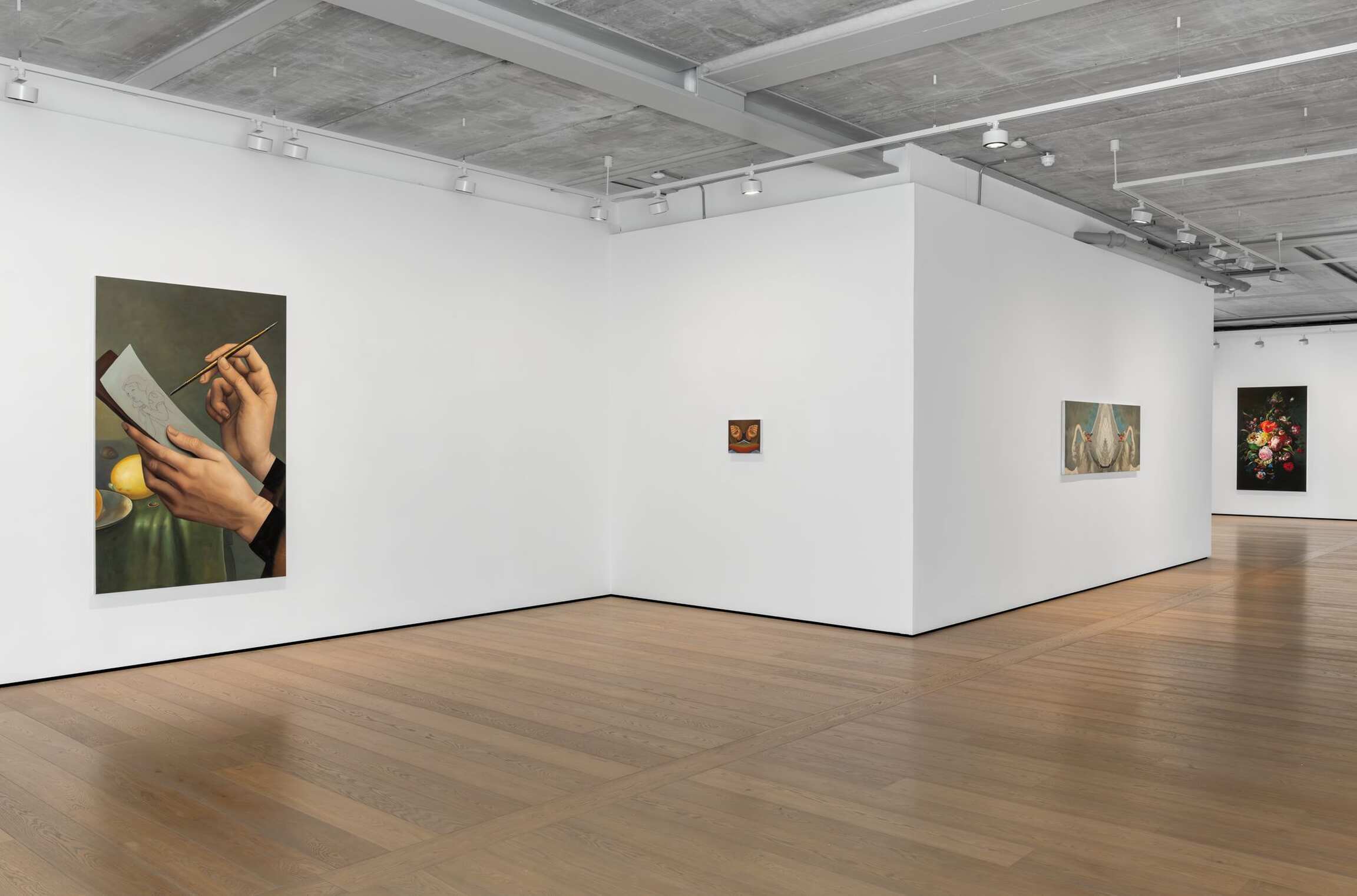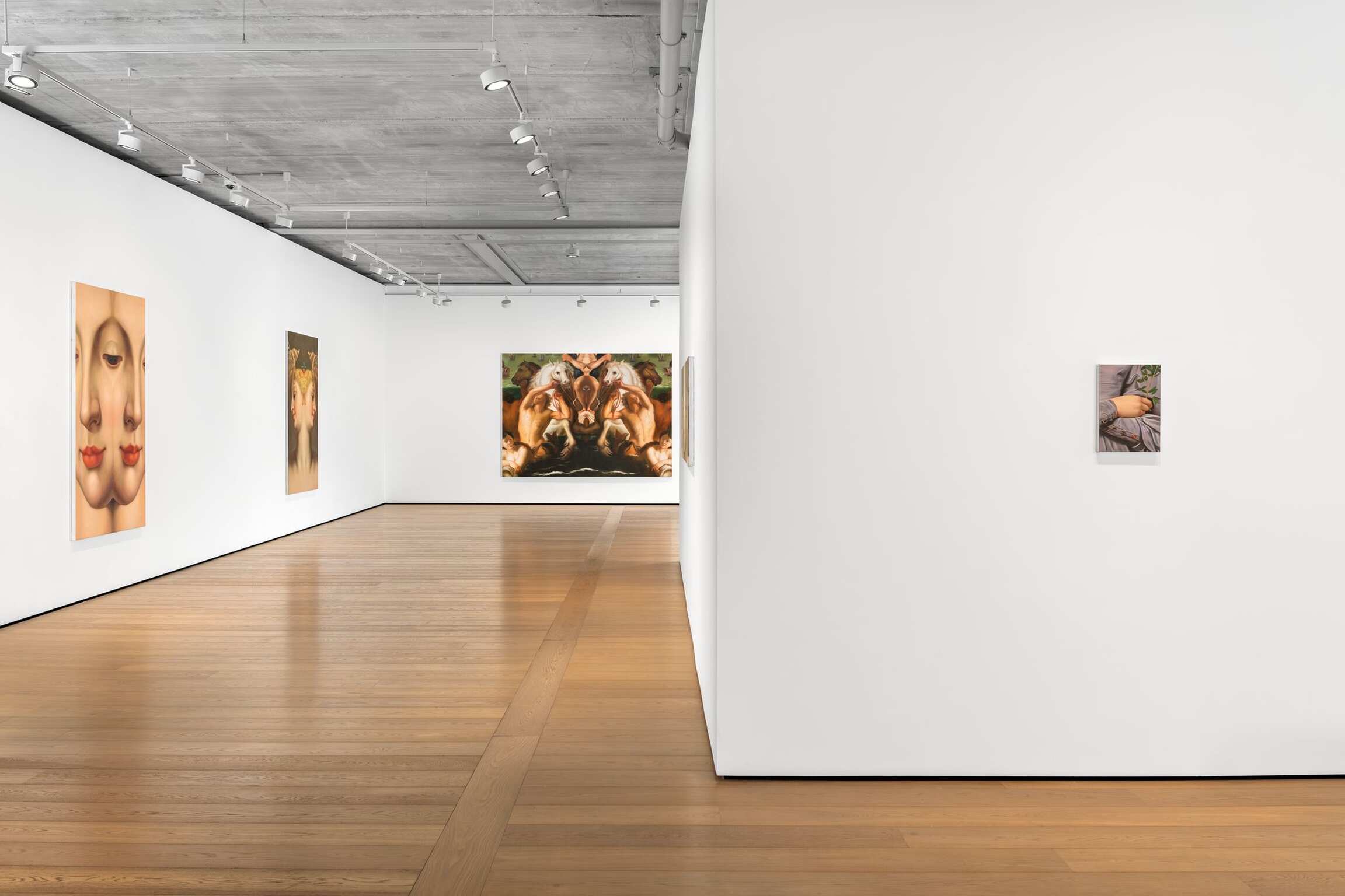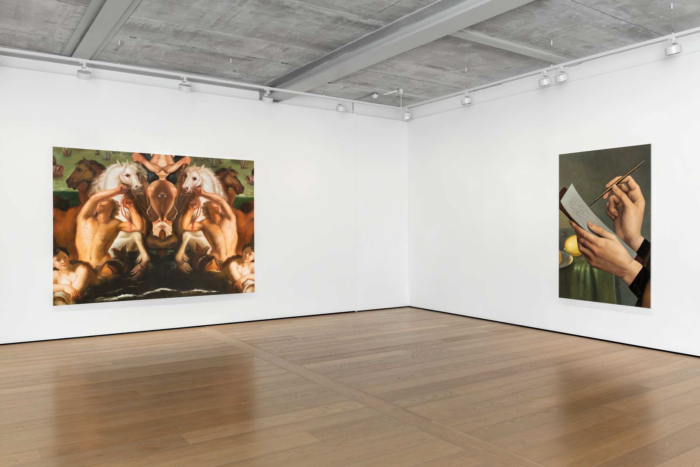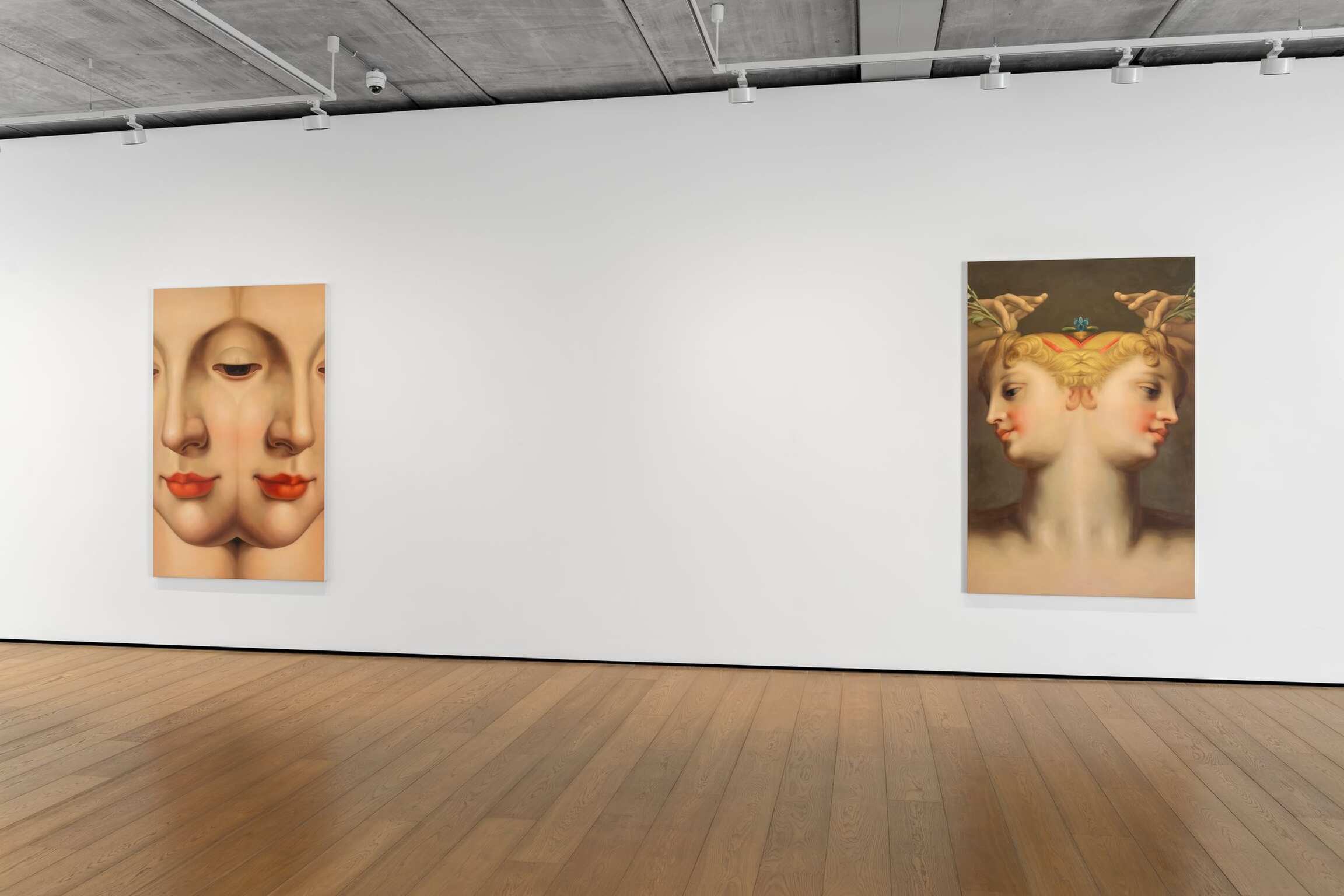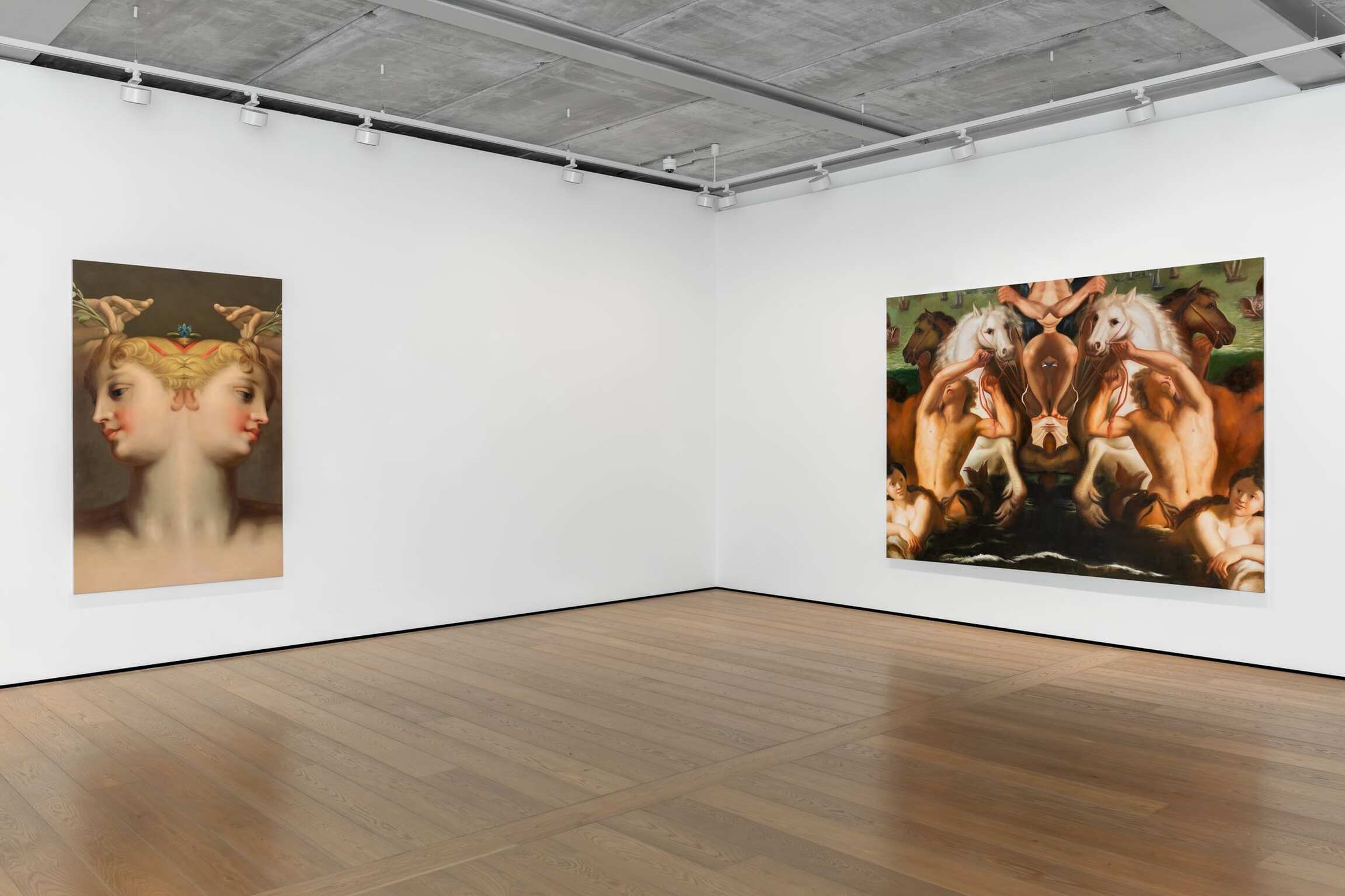 Mirrors can be portals to other realms. In Irish folk tradition, reflective surfaces are covered at a wake for fear that the soul of the deceased might otherwise slip through. In ‘Snow White,’ it is before her own reflection in a glass chalice that the queen transforms into a witch. Such surfaces have long appeared in mythology and throughout art history as points of revelation and metamorphosis. In Never Odd or Even, Ted Pim’s paintings map out the anatomy of transformation using mirror image as a central motif. At the heart of the exhibition is the idea that transformation is not something that requires new material, but instead is an altering of what we already have. To this end, Pim segments and repurposes Old Masters paintings. Some are abstracted via a duplication that sees identical forms mirrored as they merge or collide on either side of a central axis. These images are formed from fragments of Renaissance and Baroque paintings paired with imagery from fashion magazines and Irish mythology. Their symme-try echoes the cyclical structure of existence, hinting at an underlying message of the exhibition that as much as we transform history, always repeats.