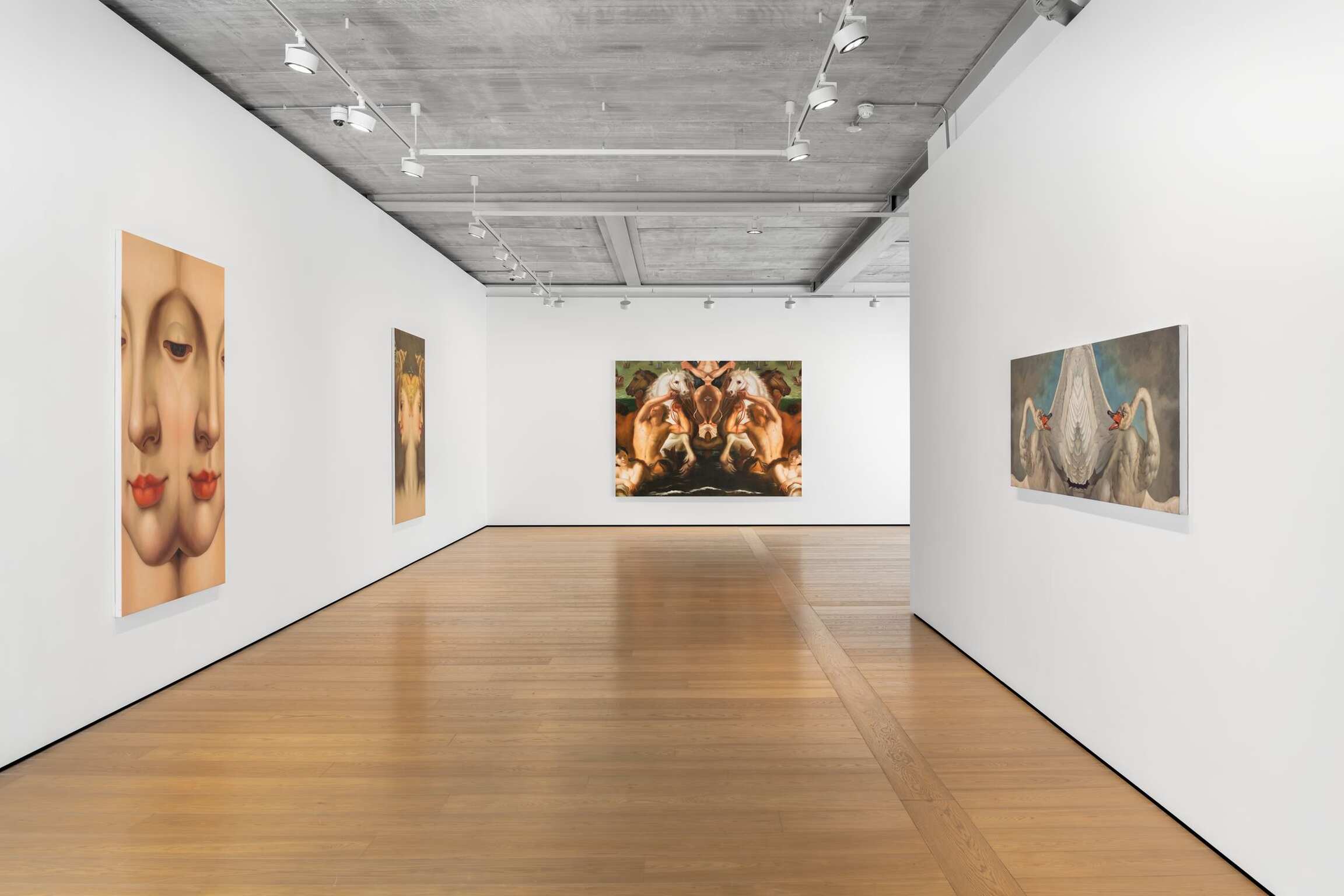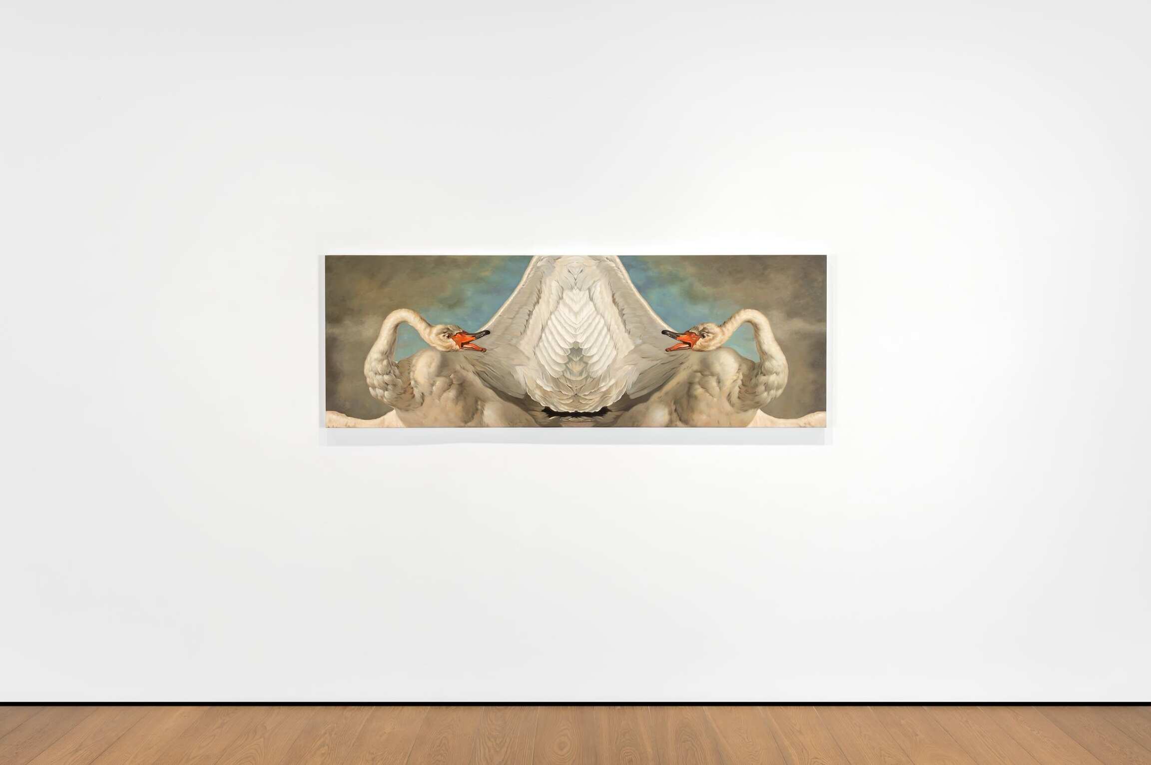 These paintings can be read as documenting a splitting of the self, the moment of transformation where both our past and present states coexist. In these snapshots of an in-between realm, kaleidoscopic arches appear that join the two sides of a mirror. A woman’s face, dou-bled and inverted, gives birth to architectural form as the contours of her brows meet and curve into archways. In another, the wings of twin swans collect into a feathered crest, their necks crooking back to meet the other’s horrified gaze. Here, as history repeats, it looks upon its own image with dismay. Swans appear as a reference to the Irish myth ‘The Children of Lir,’ in which four children are transformed into the creatures, able to take on human forms only under the moonlight. References to this myth appear throughout the exhibition as swan-like figures extend into or out of swan-hood. The direction is unclear. The forms in these paintings appear at once pulled into and expelled from the central reflective axis. This ambiguity of movement leaves Pim’s images endlessly oscillating between expansion and contrac-tion such that the walls of the gallery appear to breathe with life. In other works we find Renaissance figures tucked under fauna, vis-ible by the light of a full moon, a reference to the Irish tradition of calling forth transformation with a new moon cycle. As Pim layers imagery from the covers of high-fashion magazines and opulent masterpieces, his works inevitably develop a familiar beauty.