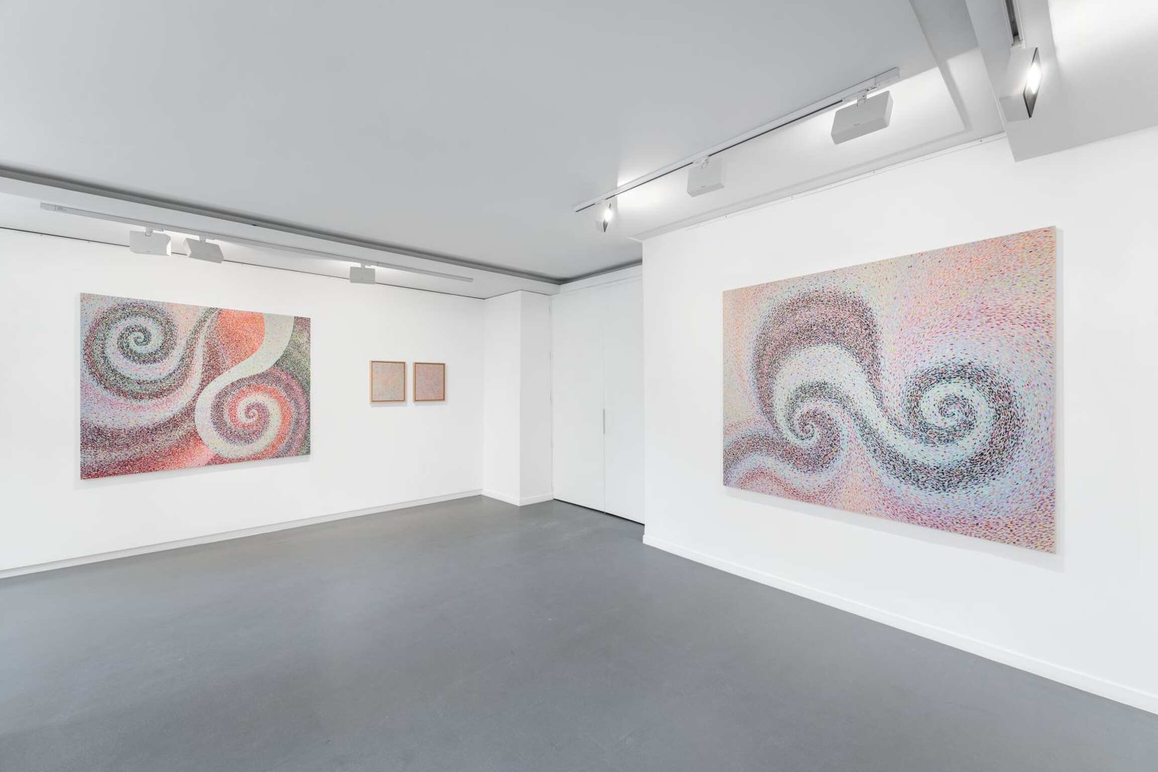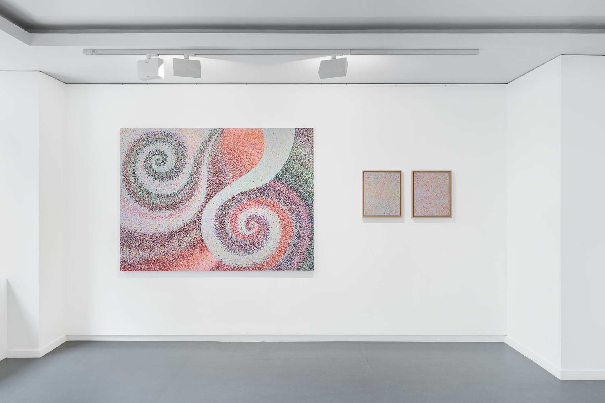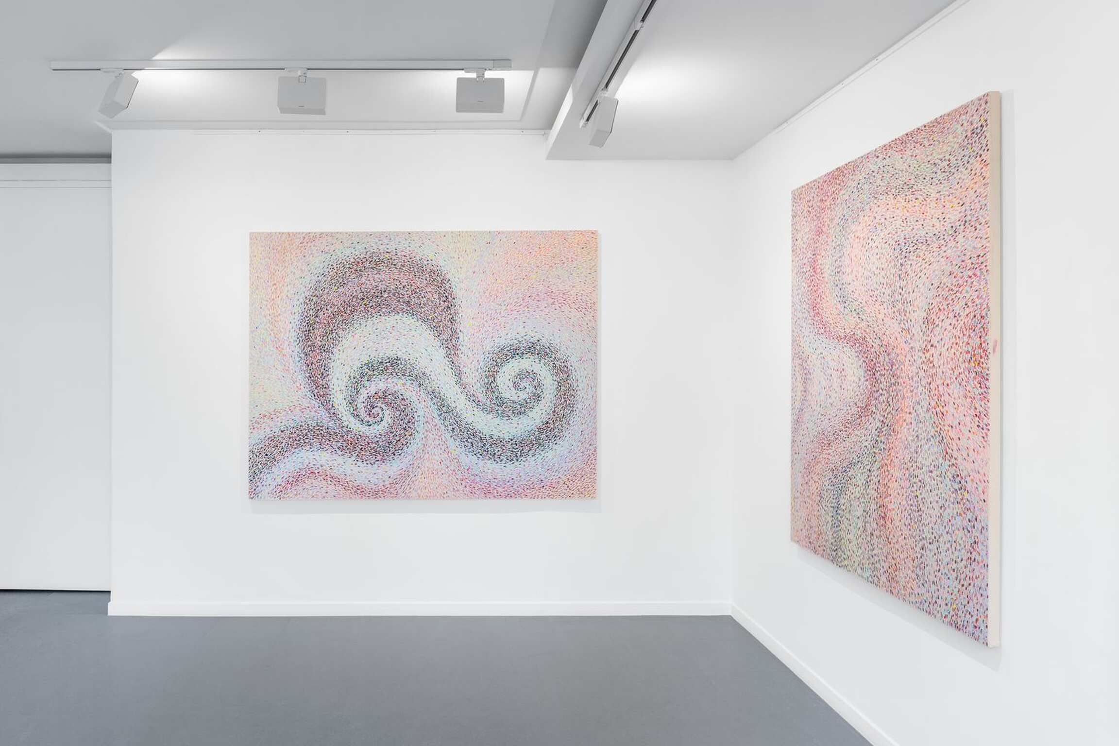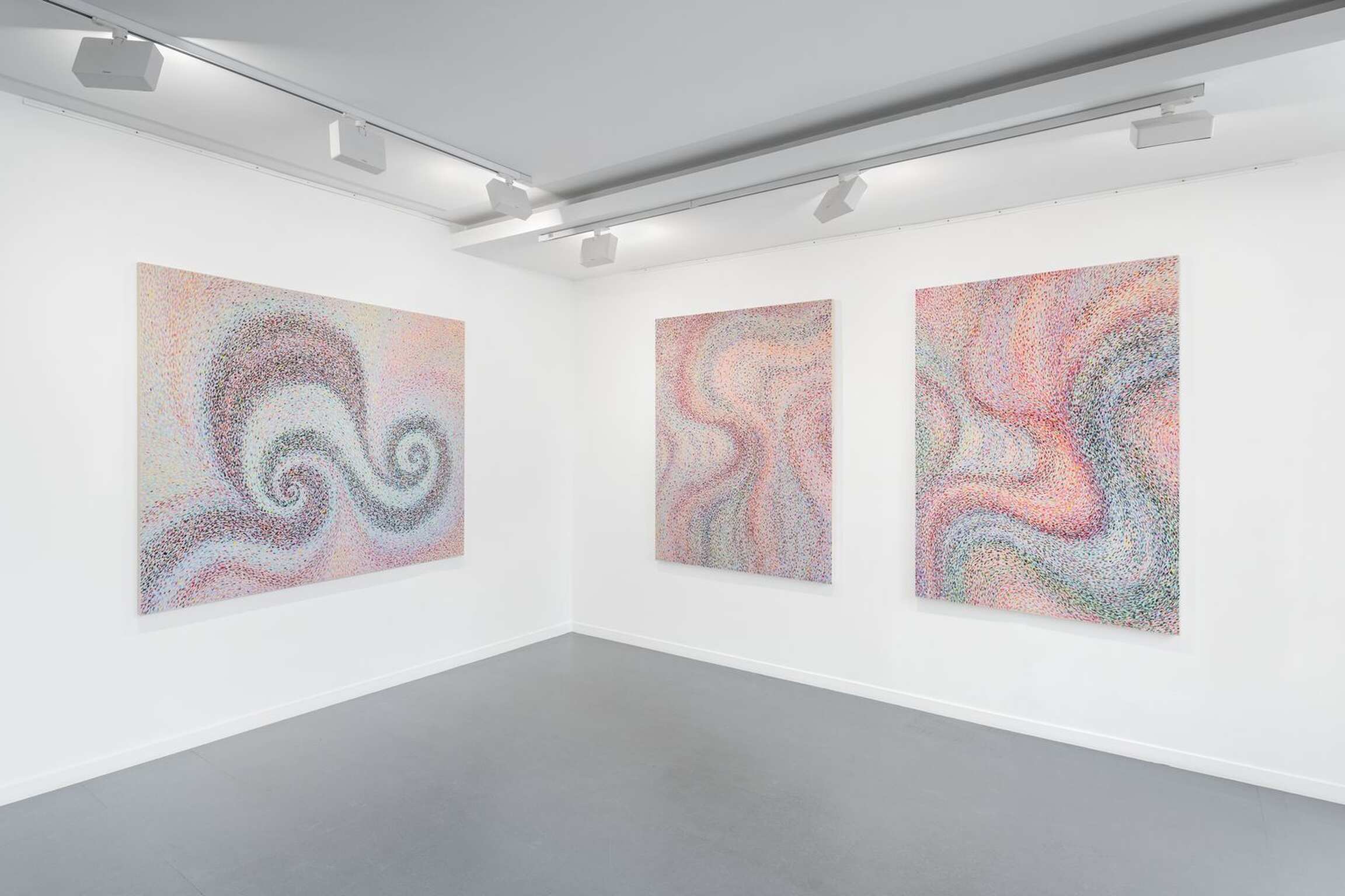 Channeling painters like Georges Seurat and Paul Signac, O’Neil composes her compositions—typically swirls, curls and waves of intense and varied colors—out of individual daubs of paint. Placing different colors next to each other on the canvas (rather than mixing them on a palette), O’Neil creates hazy volumes that seem to pulsate as we fix on them. Up close, these abstractions, which she bases on natural forms ranging from the tiny spirals inside seashells to massive murmurations of birds, break down into individual marks, like a digital photograph disintegrating into pixels. A constant push and pull between micro and macro perspectives in O’Neil’s work keeps the viewer’s eye coming back to the surfaces of her canvas—as do seemingly errant touches of color that “pop,” instead of blending with the surrounding hues. Unexpected dashes of hot pink or chartreuse, for example, disrupt the illusion of distance or volume. The effect recalls similarly surprising painterly flourishes found in landscapes by Claude Monet, Vincent van Gogh or even Joan Mitchell. Similar to the blazing, almost neon orange sun in Monet’s famous Impression Sunrise, 1872, certain aspects of O’Neil’s compositions seem intended to emphasize the materiality of paint itself.