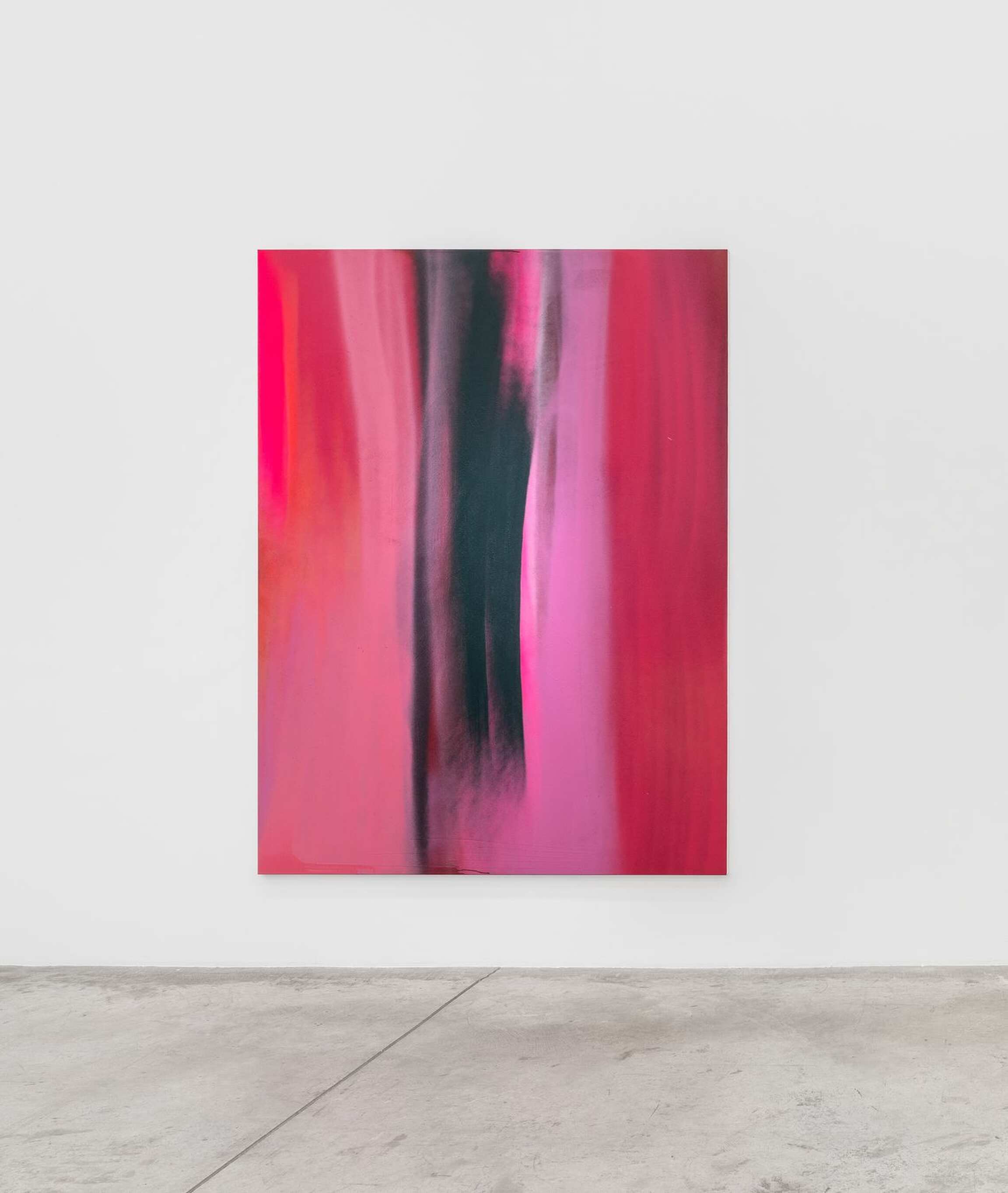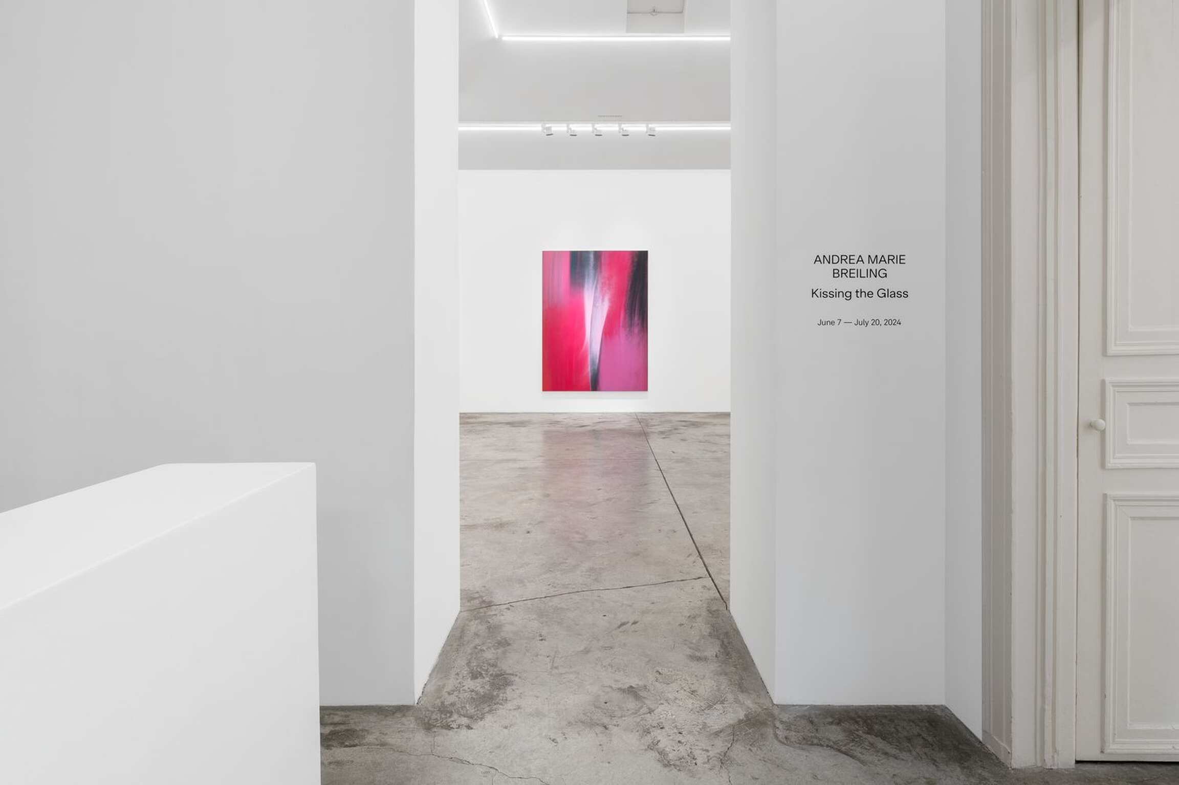 During a studio visit in Mallorca while she was making this body of work, Breiling revealed that the original title for her show was Cerca de Ti - a Mallorcan phrase meaning “Near You.” Even at that early stage of making the work, she was inspired by Paris and what the city represents to her. In her words, “Paris has a romantic and timeless feminine presence that wraps itself around us each and every time we visit. I want this work to capture the essence of what it’s like to be immersed in Paris - it’s this blend of high fashion and old streets, beautiful people surrounded by stunning architecture, museums with parks and flower-adorned cafes on every corner…” Midway though painting a work that resembled a burgundy and pink field as viewed through a foggy window, Breiling’s friend and fellow artist-in-residency, Blair Saxon-Hill, arrived at Breiling’s studio and, wanting to say hello but not interrupt Andrea’s process, quietly slid a note under the studio’s glass door. Written with a flourish in bright red marker, the well-wishing note was signed “Kissing the Glass,” an apt and poetic phrase that Breiling quickly adopted as the show’s new title, as it perfectly ties together her work’s powerful femininity and the romantic essence of Paris which inspired it all. “Much like a bow,” Breiling says, “…a very pink and powerful feminine Parisian bow!”