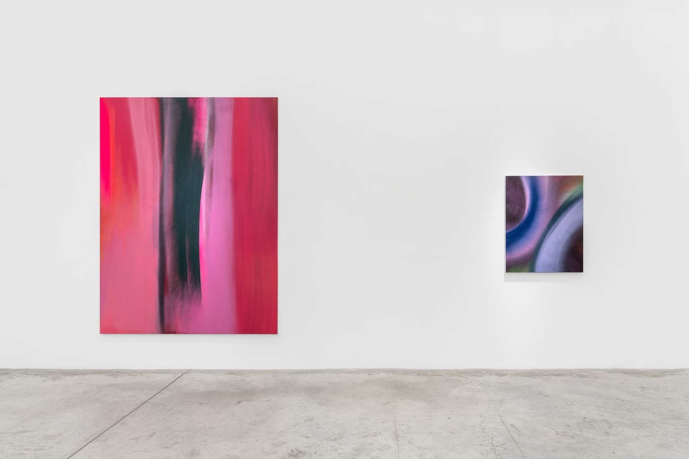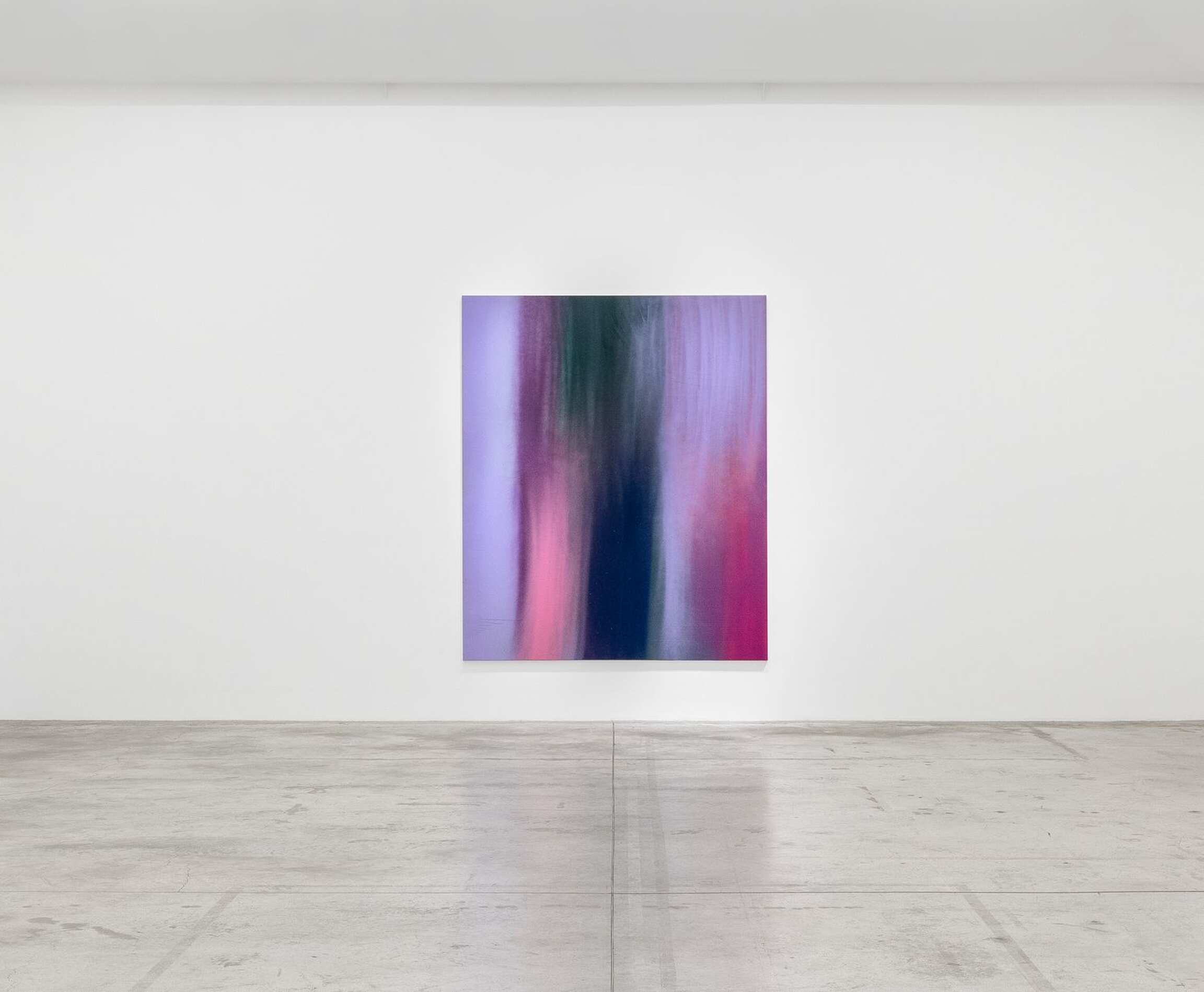 In Breiling’s previous work, she relied upon a wide spectrum of spray paint caps and nozzles - fat, narrow, chunky - to generate unique textures, depth, and surface effects in her work, and she utilized energetic layering of colors to produce her signature atmospheric, complex, and dynamic compositions. However, we now see Breiling dialing back her frenetic gesturing, and instead practicing a more confident and measured approach to applying color, resulting in works which are much more - in Greenbergian terms - focused on the paint itself and the surface; that is, they offer far less dimensionality and appear significantly more flat. We see very clearly here in these new works that Breiling has made a major shift in her practice to stake her claim in color field abstraction.