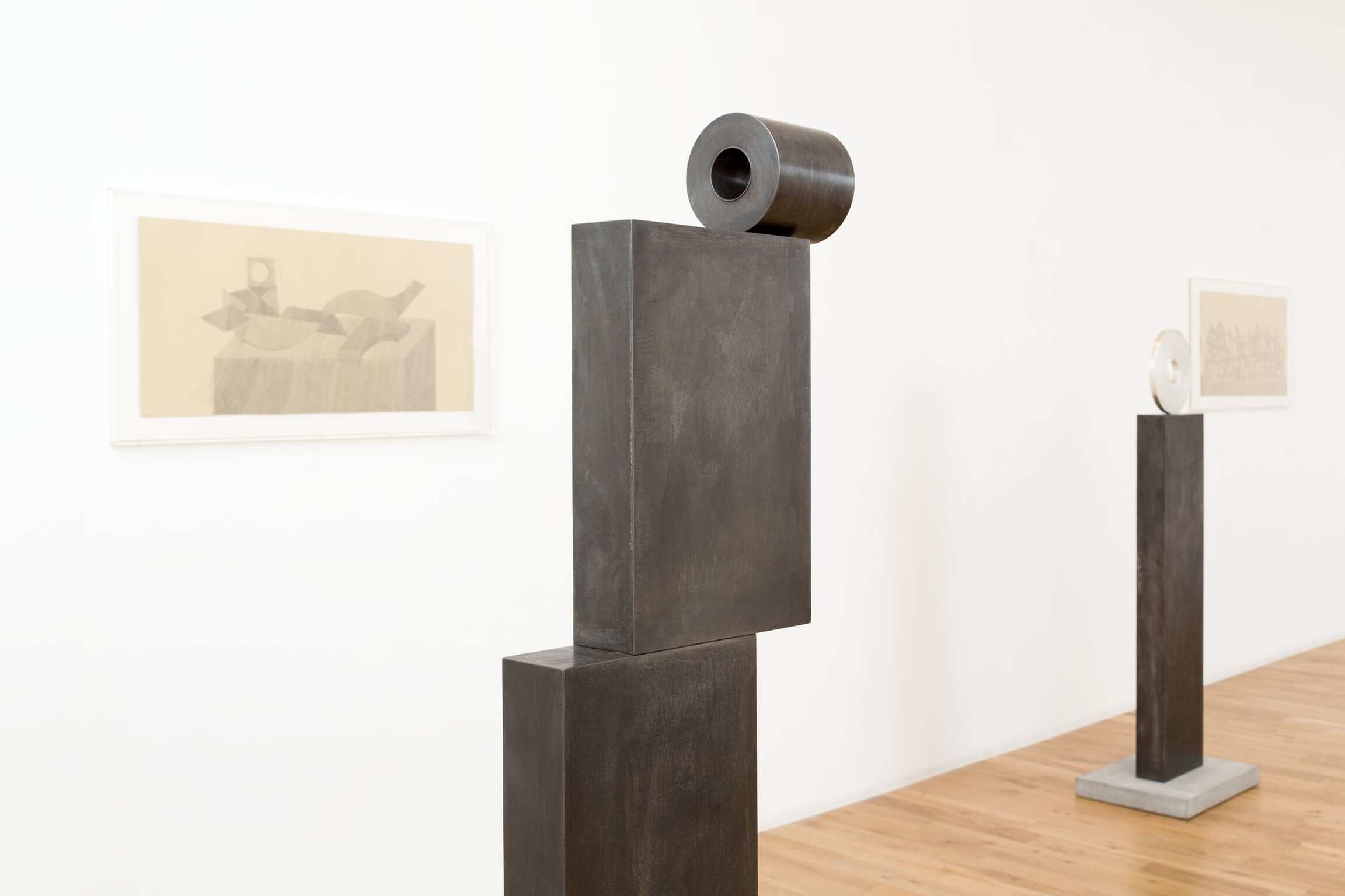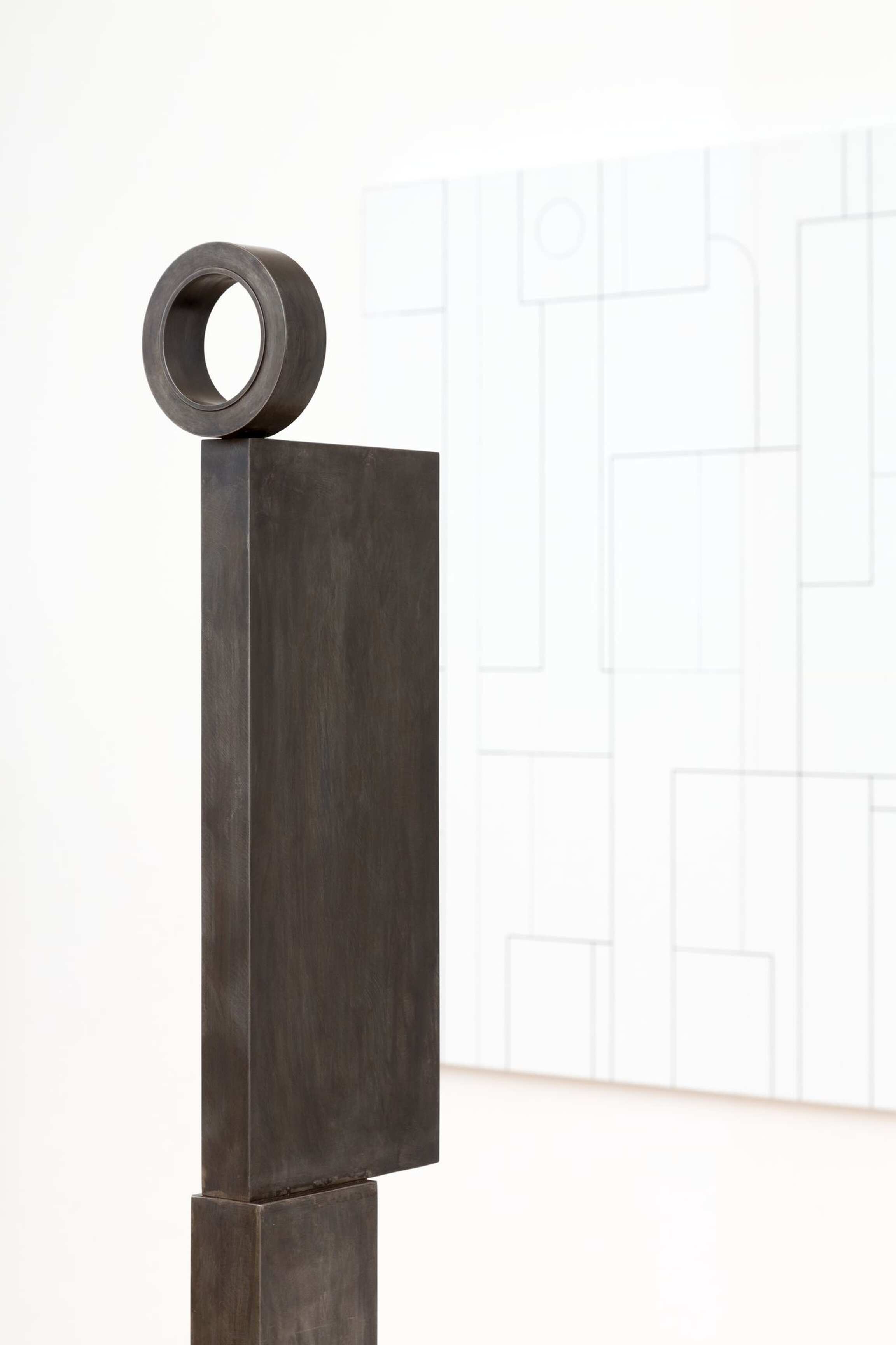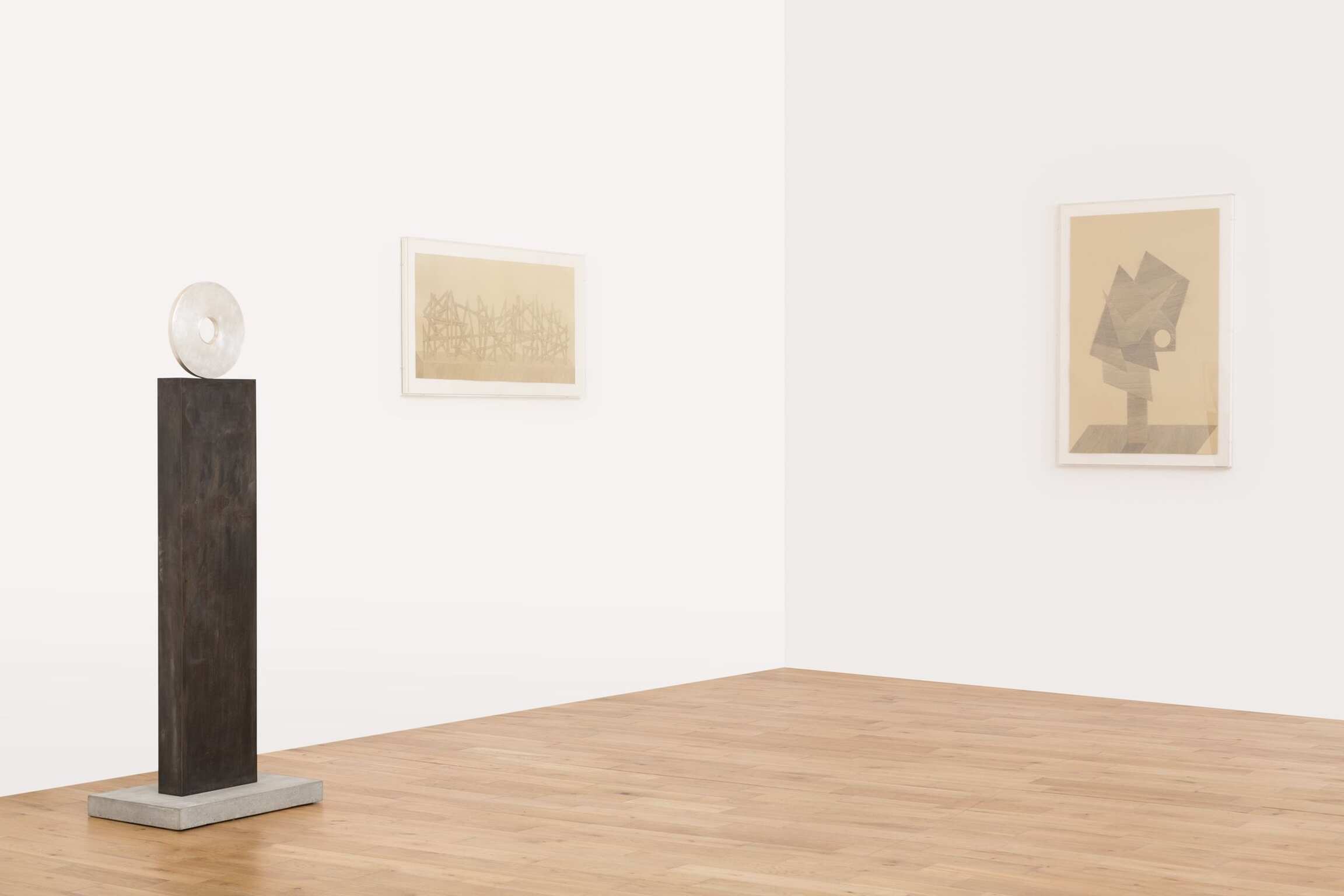 Or let’s say that the conditions of the modern are there, inevitably (no grids without memories), but as a kind of ambience, mingling with and coloured by other atmospheric conditions, and operant as forces swirling in your peripheral vision during the looking. Suggestions recur: of the moon, and moonlight, in circular sculptural forms that are silvered—like the silver painterly grids—and given titles like Moon-Face, 2015. Femininity and the moon are aeons-old if obliquely and mythologically connected, and there are also abstractions of women here. One drawing refracts a woman in tears. Elsewhere, if women have historically and lamentably been objectified by the male gaze in art, in Peri’s sculptures they gaze back, hieratic, frontal, assured, while also suggesting themselves as surrogate viewers—of the paintings and drawings, of you. The hierarchical idea, inherent in the reception of artworks, that the viewer looks, browses at will, and goes unchallenged, is here upended.