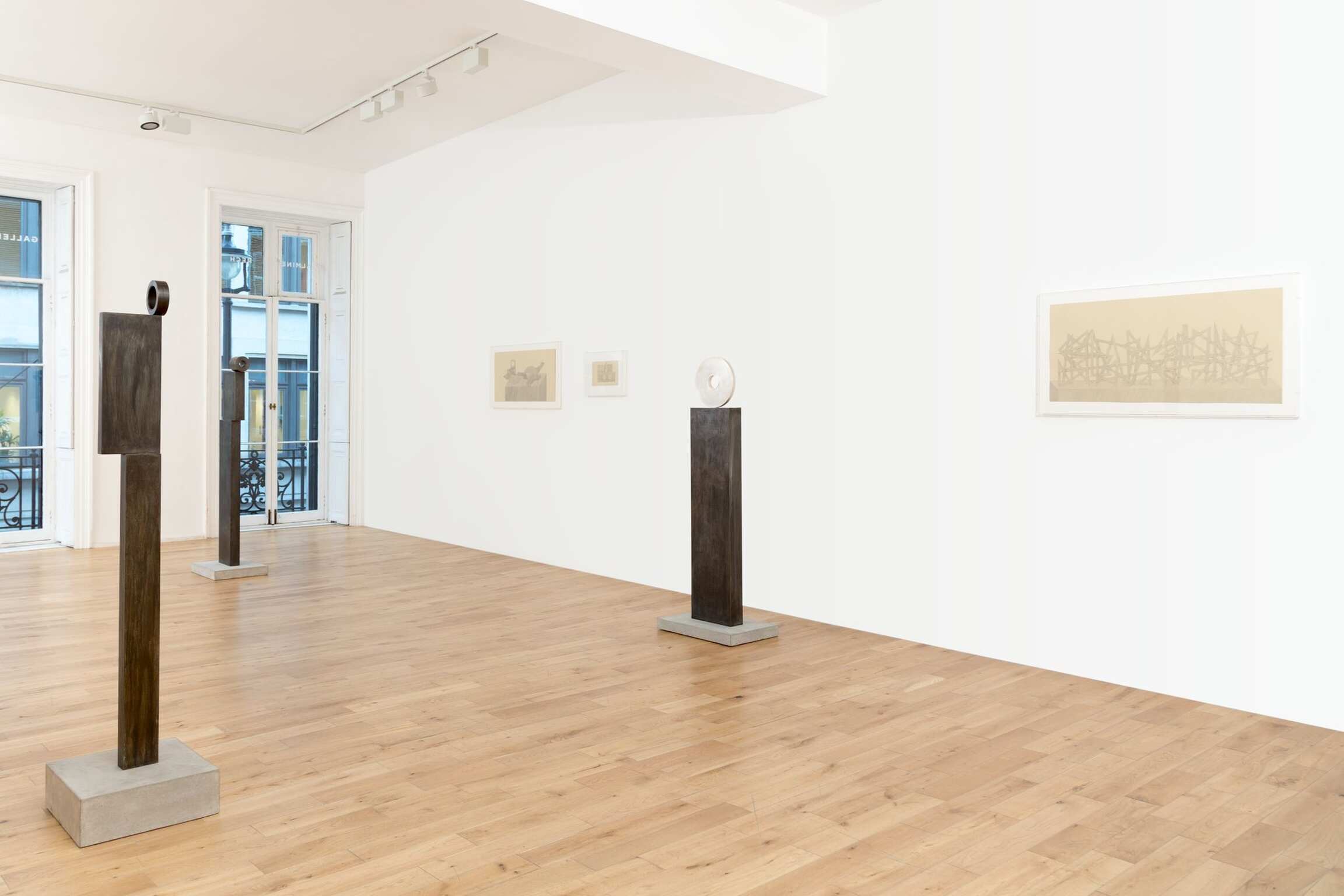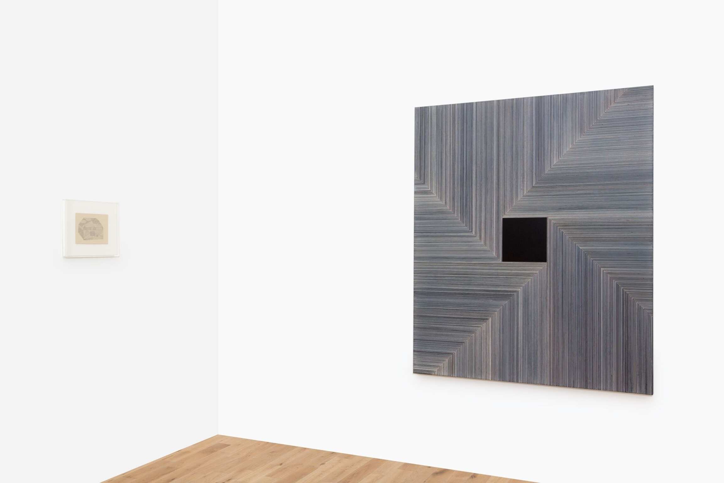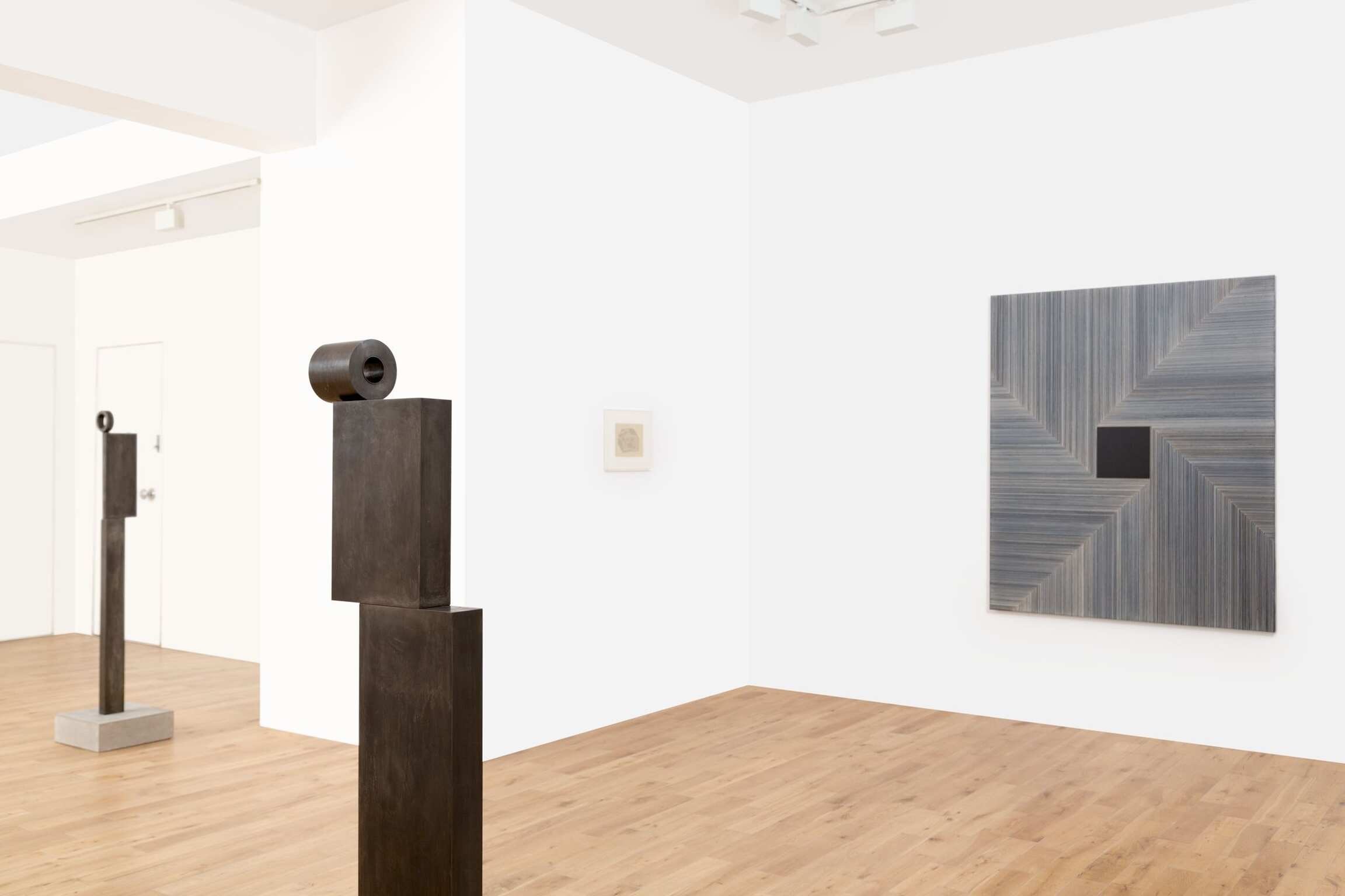 Or let’s say that the conditions of the modern are there, inevitably (no grids without memories), but as a kind of ambience, mingling with and coloured by other atmospheric conditions, and operant as forces swirling in your peripheral vision during the looking. Suggestions recur: of the moon, and moonlight, in circular sculptural forms that are silvered—like the silver painterly grids—and given titles like Moon-Face, 2015. Femininity and the moon are aeons-old if obliquely and mythologically connected, and there are also abstractions of women here. One drawing refracts a woman in tears. Elsewhere, if women have historically and lamentably been objectified by the male gaze in art, in Peri’s sculptures they gaze back, hieratic, frontal, assured, while also suggesting themselves as surrogate viewers—of the paintings and drawings, of you. The hierarchical idea, inherent in the reception of artworks, that the viewer looks, browses at will, and goes unchallenged, is here upended.