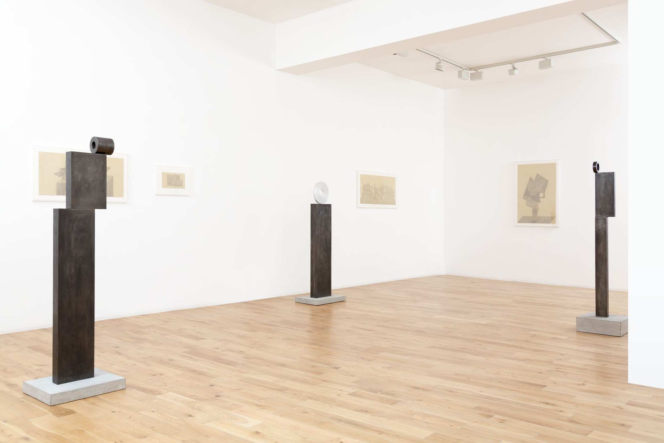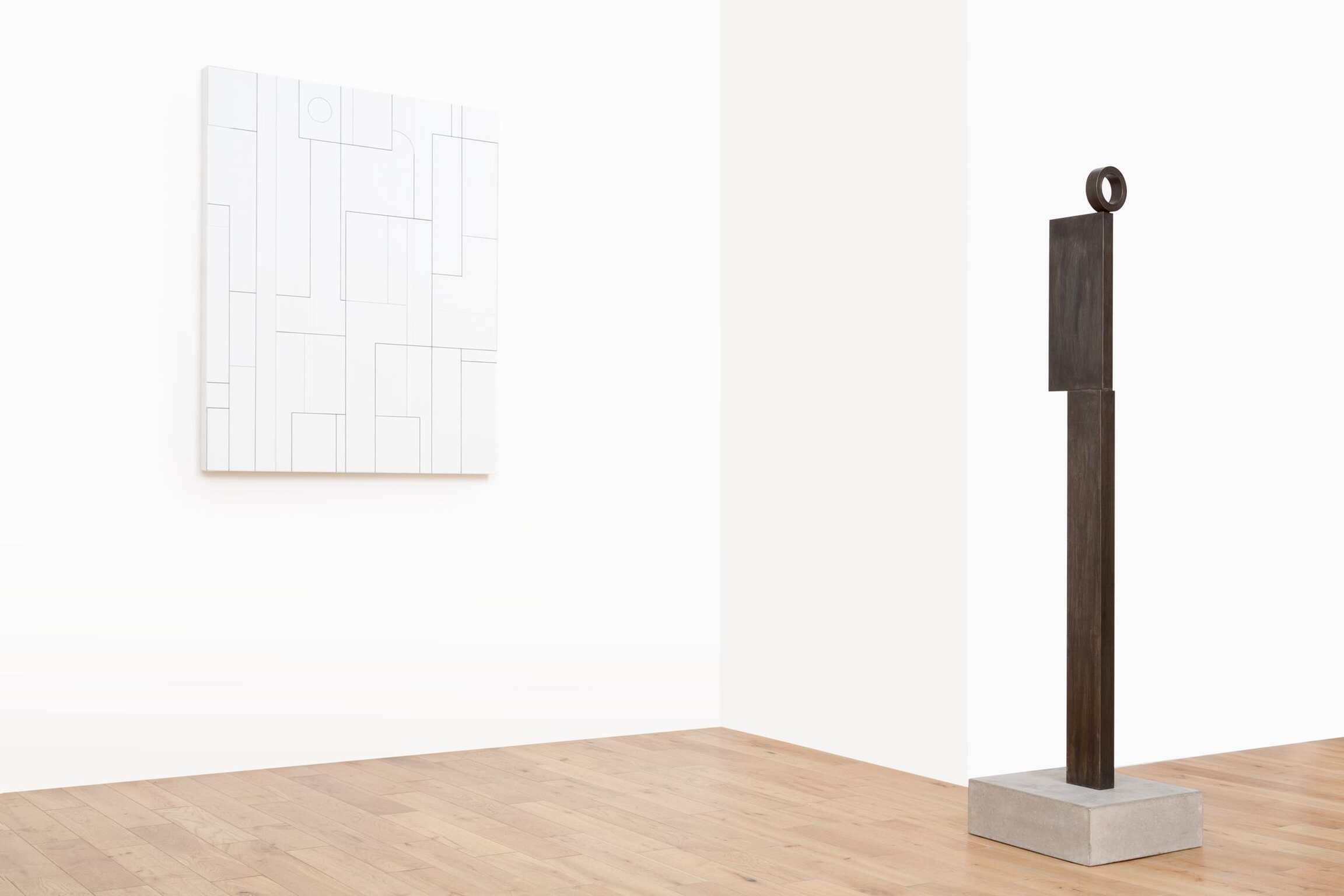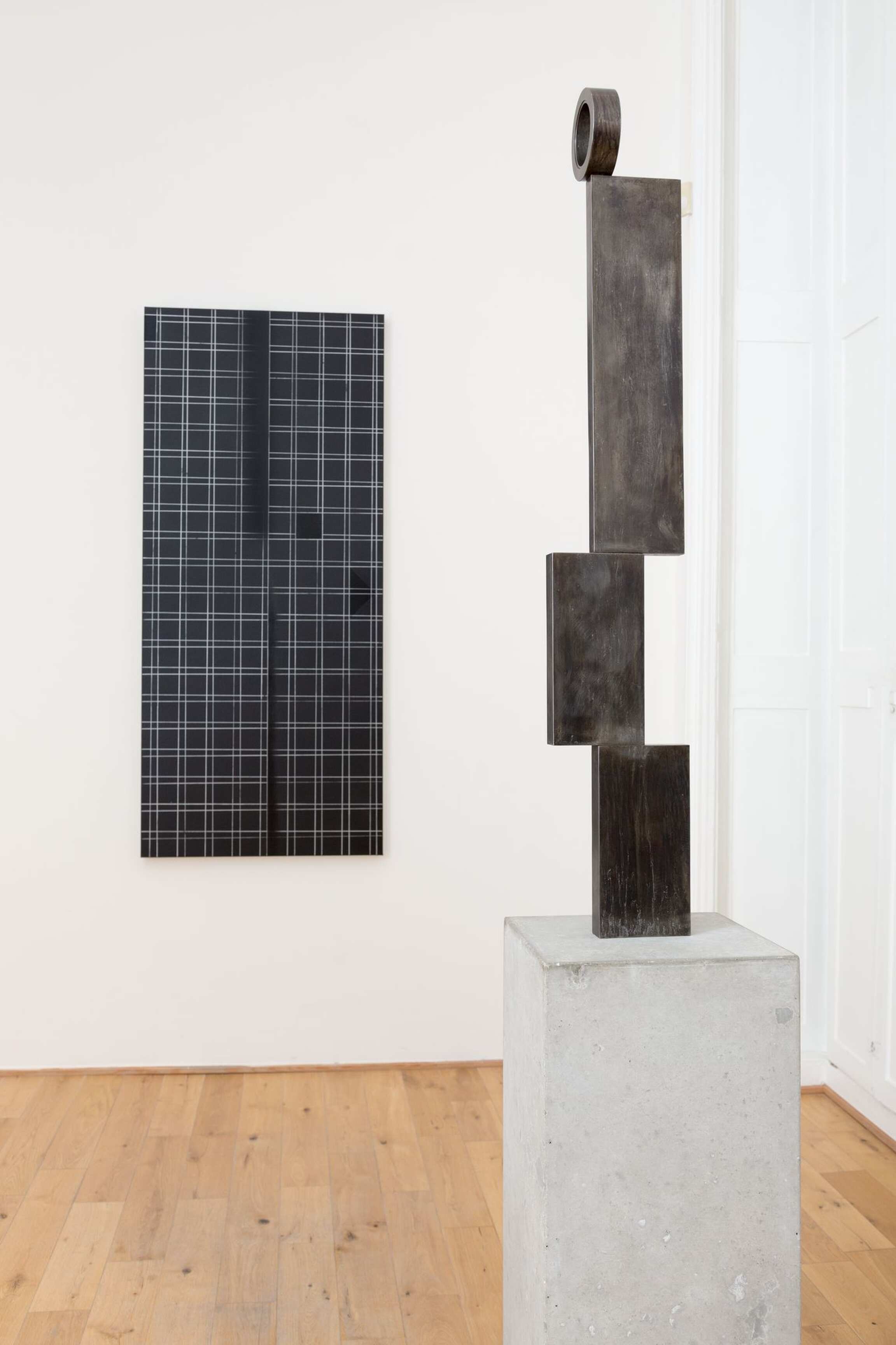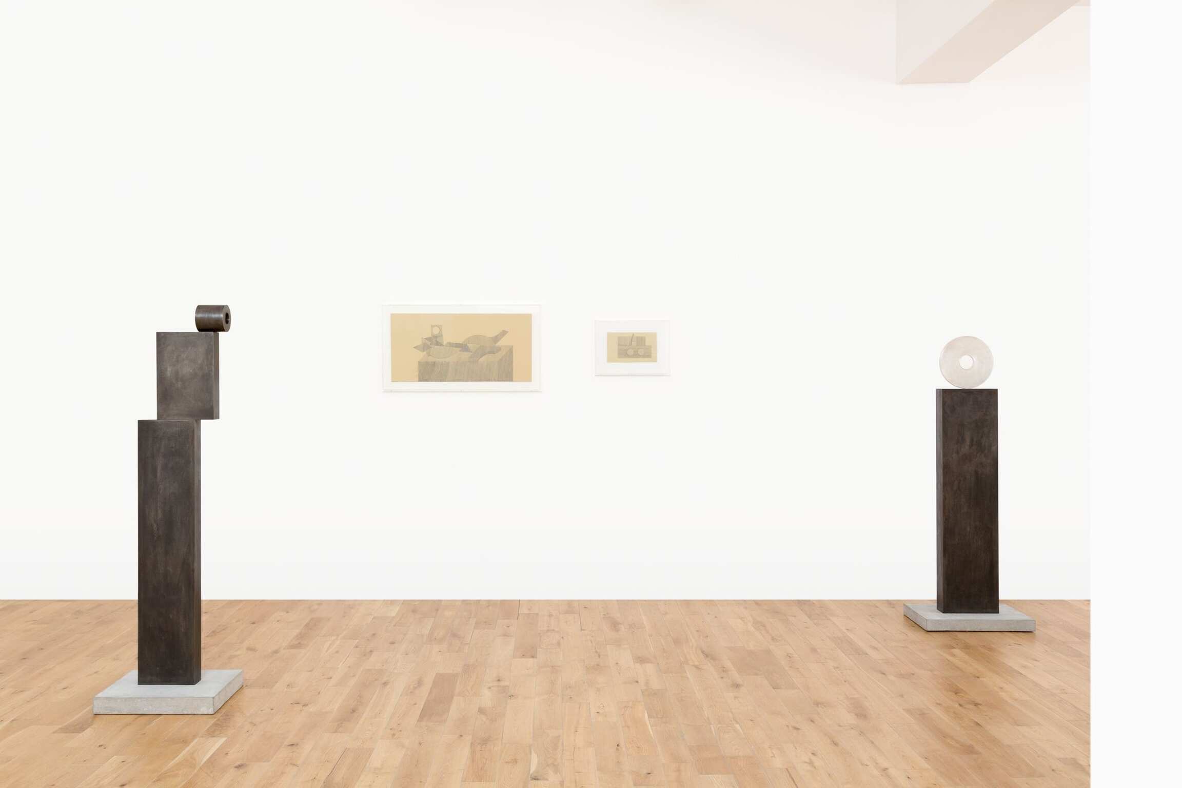 Consider the balanced forces in play here, the careful orchestration of not arriving at anything so reductive as a ‘reading’. The paintings, drawings, and sculptures must, first, assert themselves as personalities. (This, indeed, is the strange animist challenge of much of Peri’s art to date, an explicit staging—we might venture—of art as meeting, an open exchange, between you and the artwork.) Then everything that they hold back is compensated for, or feels to be, by a mixed scent of intimations: again, the modern, the moon, bodies, the feminine. Reception here is a dynamic ricochet between you, the object in front of you, and the complex of suggestion that seems to be, rather, around it. To break down the personal nature of this relation would be to reject a central tenet of abstraction: that it not be just another way of representing. The title of one painting, Bodies, Bodies, Bodies, comes from Polish writer Witold Gombrowicz’s diaries, written in exile, and describes a relational process: how bodies on a beach affect each other in a deforming manner. But that mantric phrase might be opened up, in this context, into a poetics of inflection, because merely to call anything here a body—which, to an extent, would be justifiable—is to shut the whole interplay down, to refuse its generous challenge. A challenge which includes navigating the fact that you might think, in a context of other abstractions that verge on a figure, of an ostensibly nonfigurative black grid as a someone.