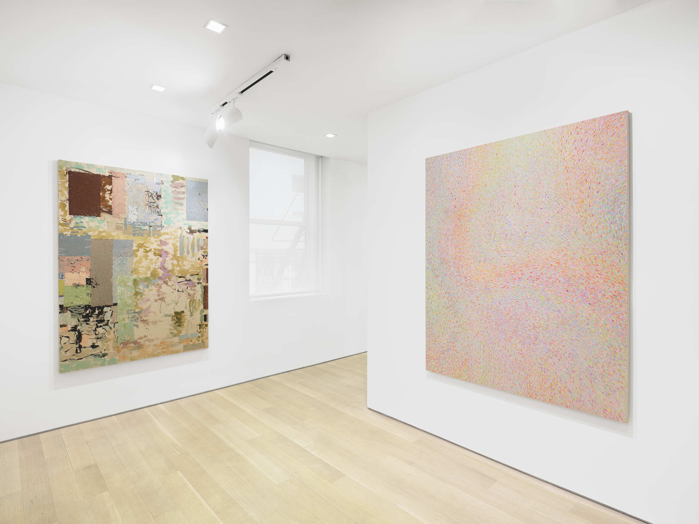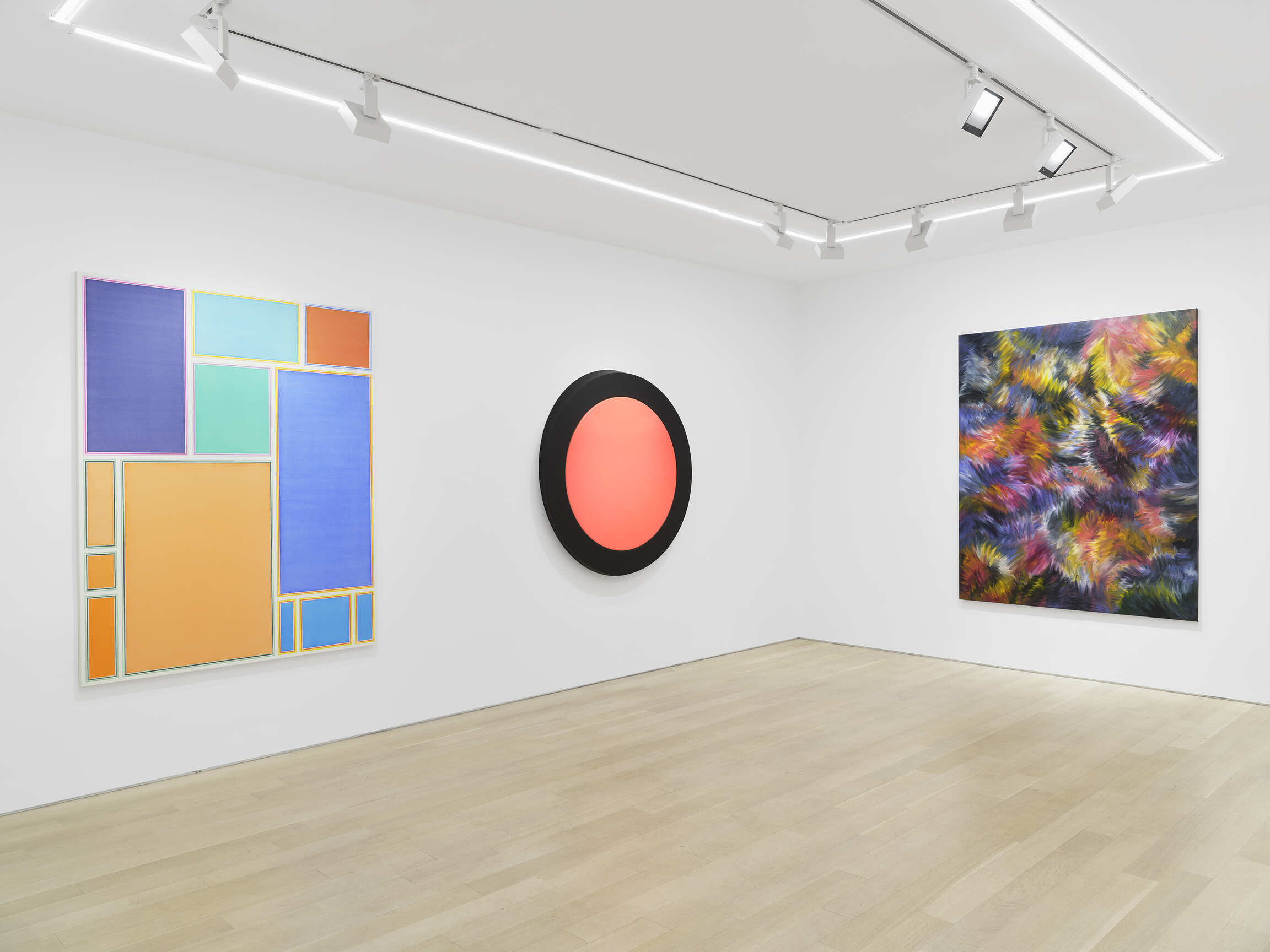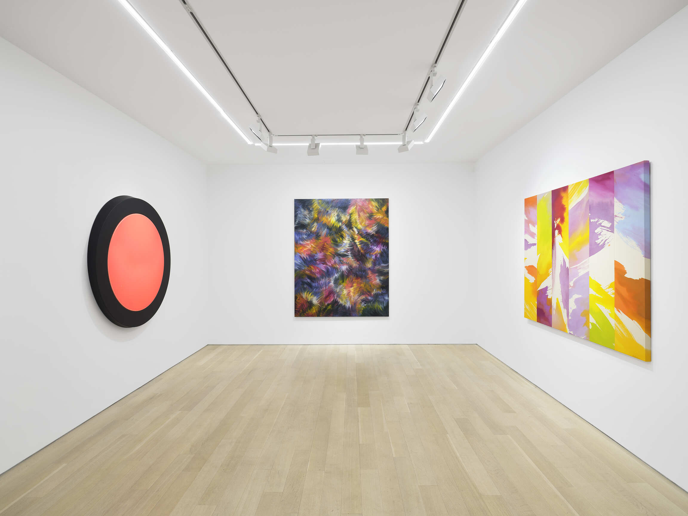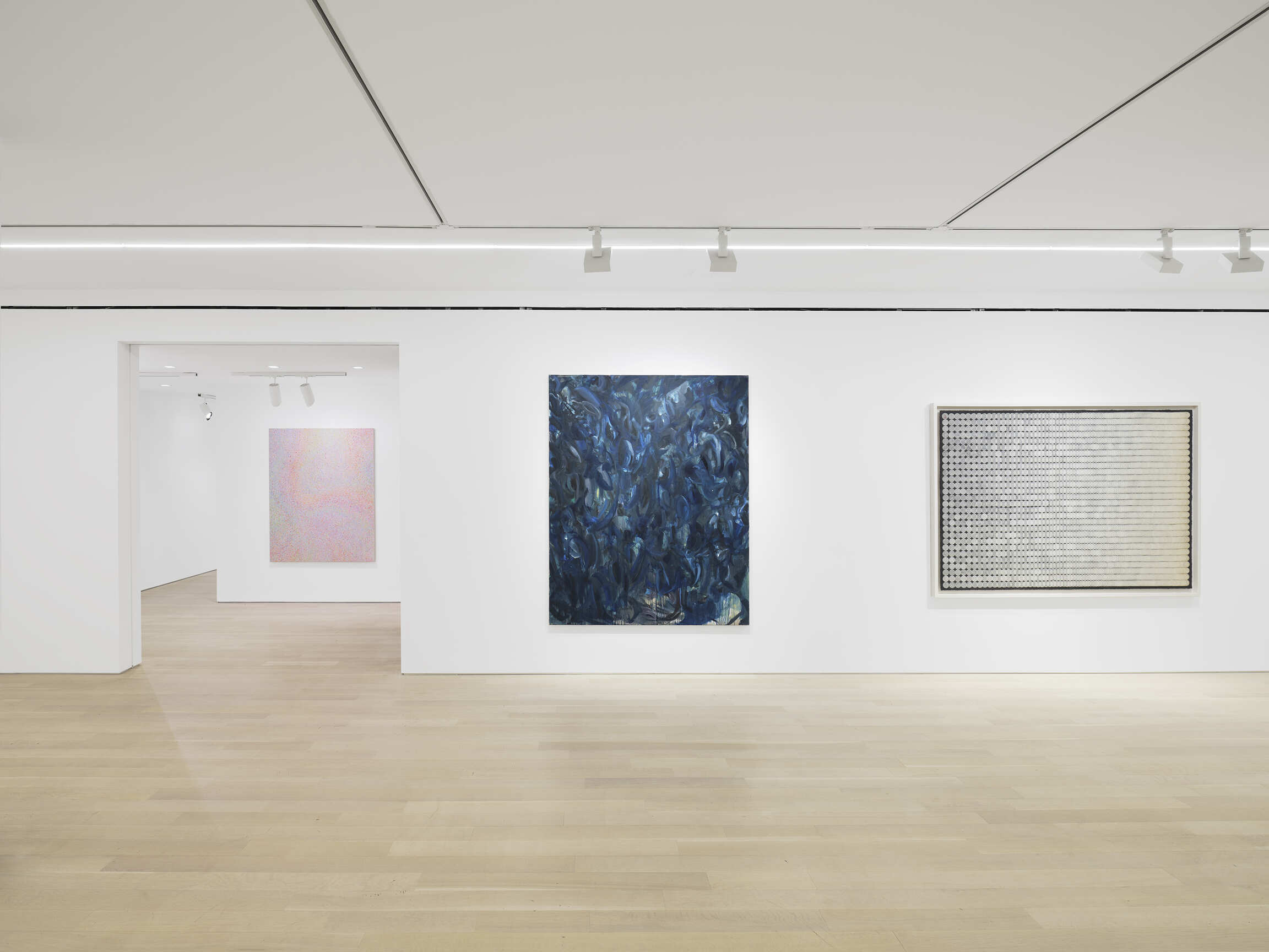 Further investigations of form can be seen in paintings by Mary Ramsden, Gwen O’Neil, Sarah Crowner, and Selma Parlour. Ramsden and O’Neil’s works demonstrate their considered technique, where dappled strokes introduce textural elements. In contrast to the lyrical forms in O’Neil’s work, Sarah Crowner’s and Selma Parlour’s paintings present geometric compositions that sharply contrast shapes and hues, drawing the viewer’s eye around the image.
