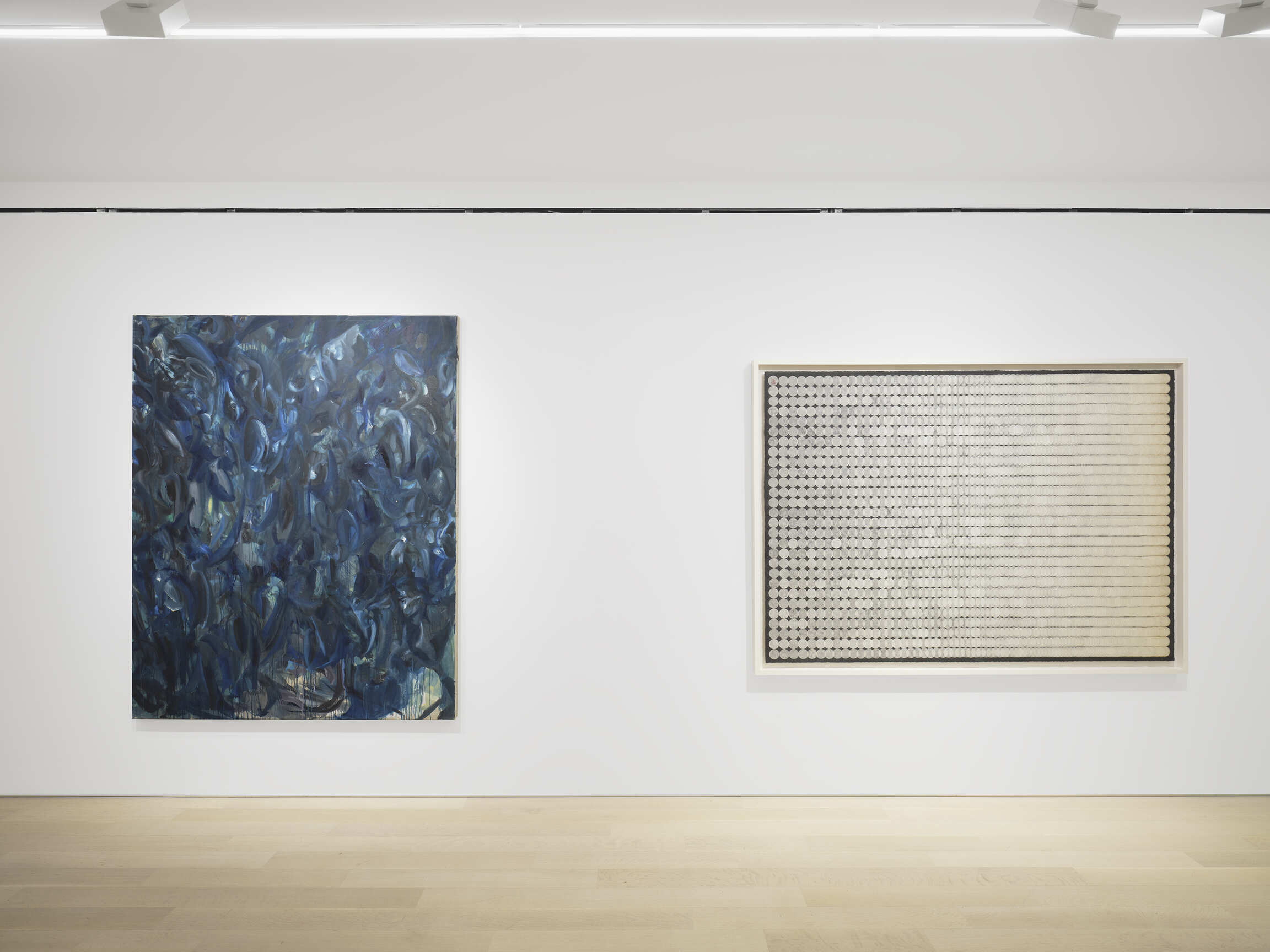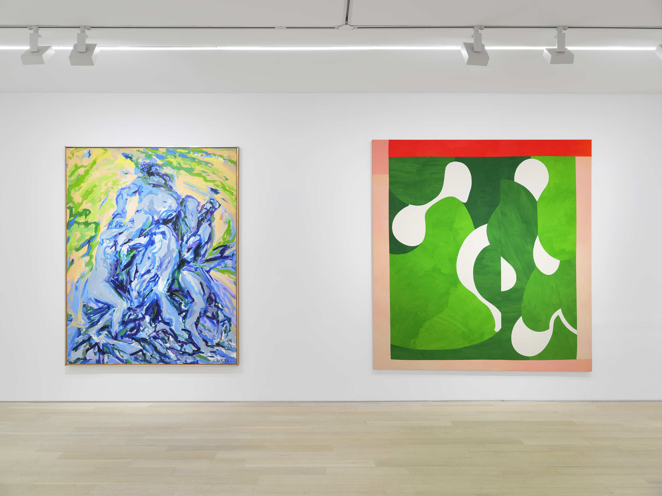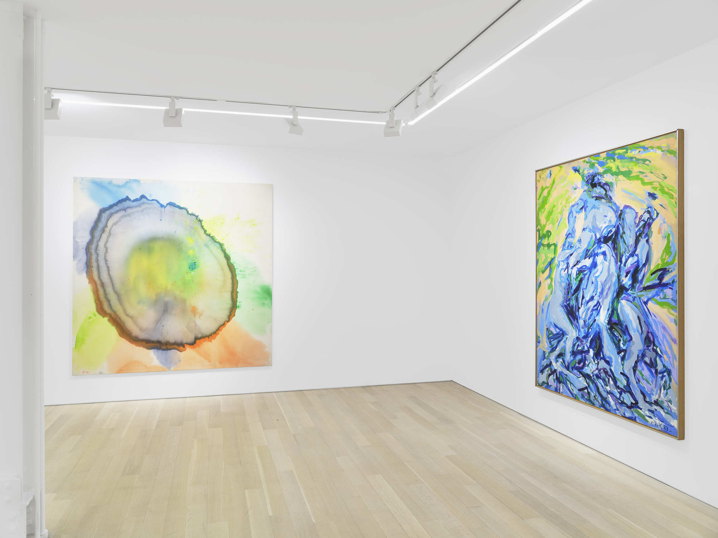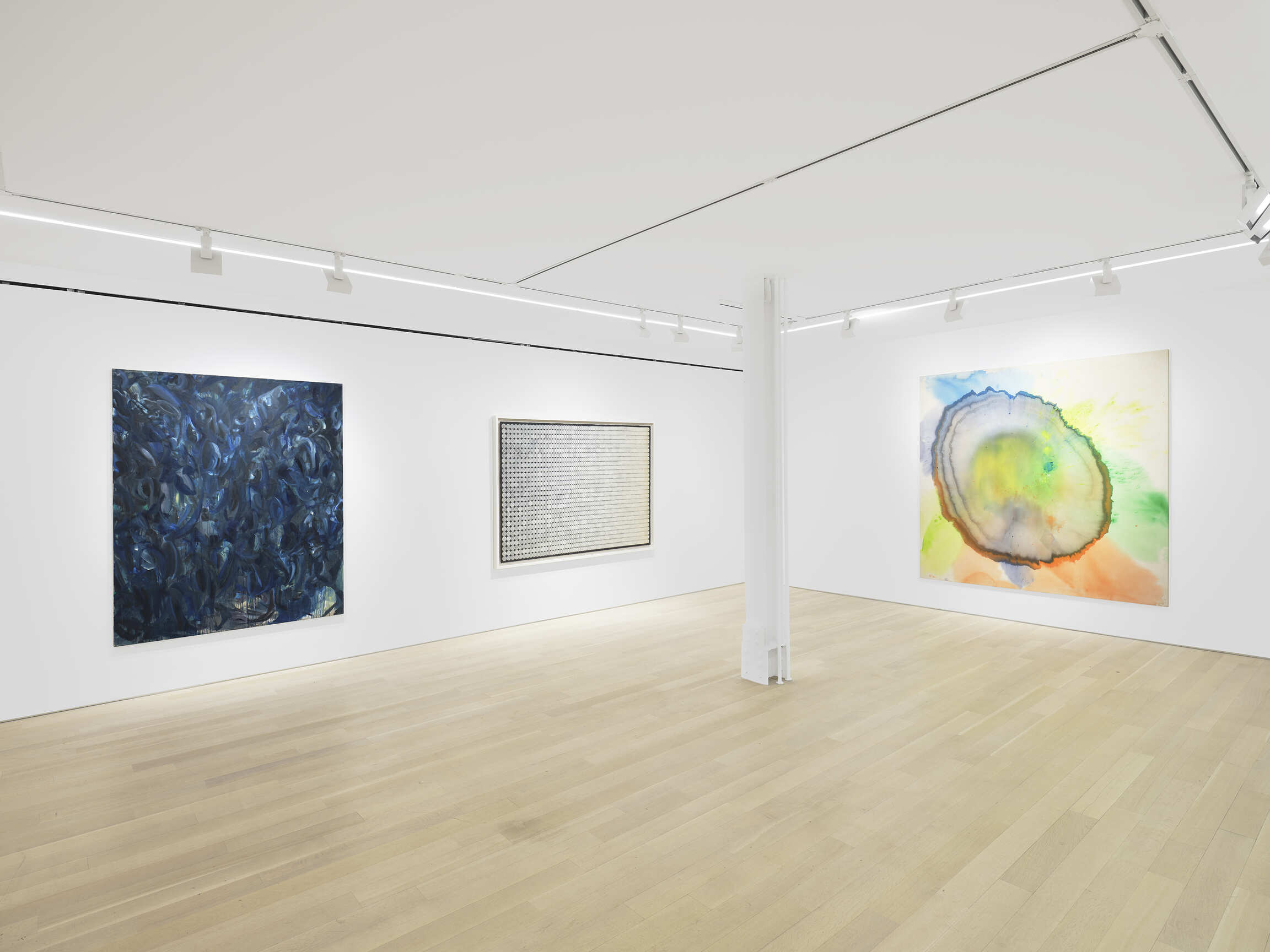 Further investigations of form can be seen in paintings by Mary Ramsden, Gwen O’Neil, Sarah Crowner, and Selma Parlour. Ramsden and O’Neil’s works demonstrate their considered technique, where dappled strokes introduce textural elements. In contrast to the lyrical forms in O’Neil’s work, Sarah Crowner’s and Selma Parlour’s paintings present geometric compositions that sharply contrast shapes and hues, drawing the viewer’s eye around the image.