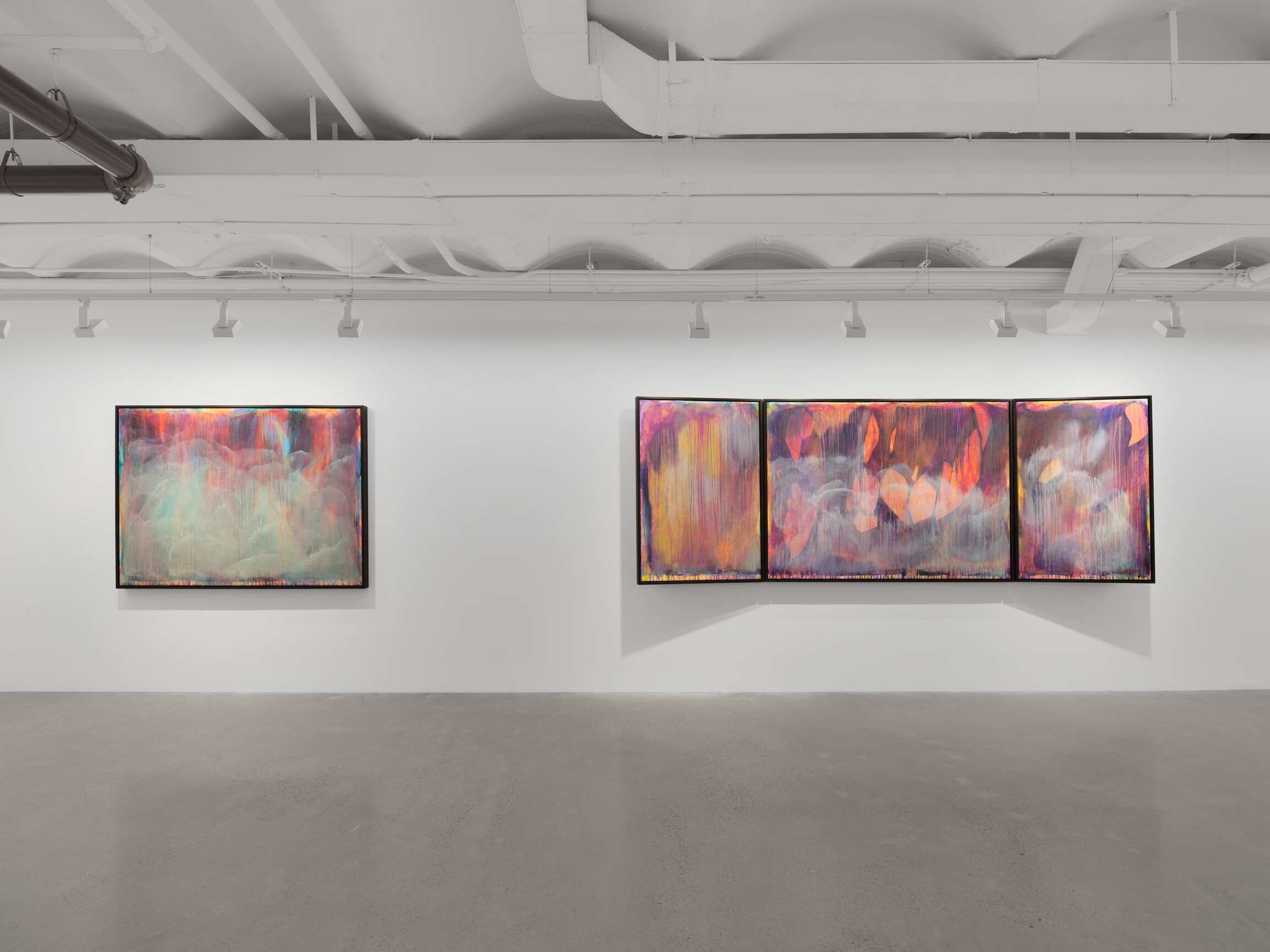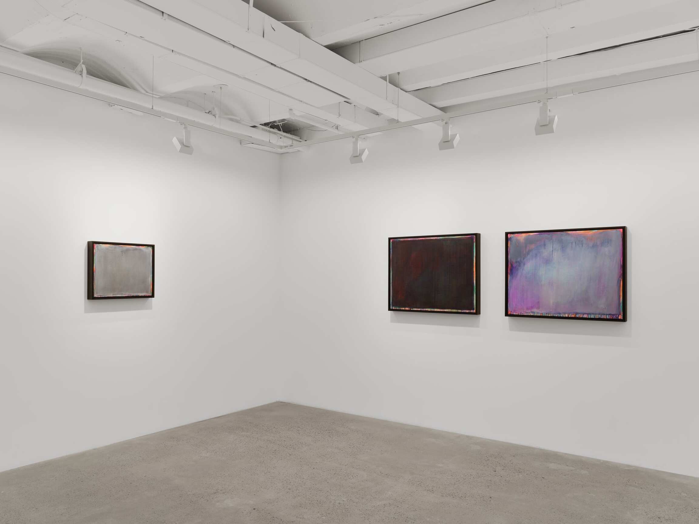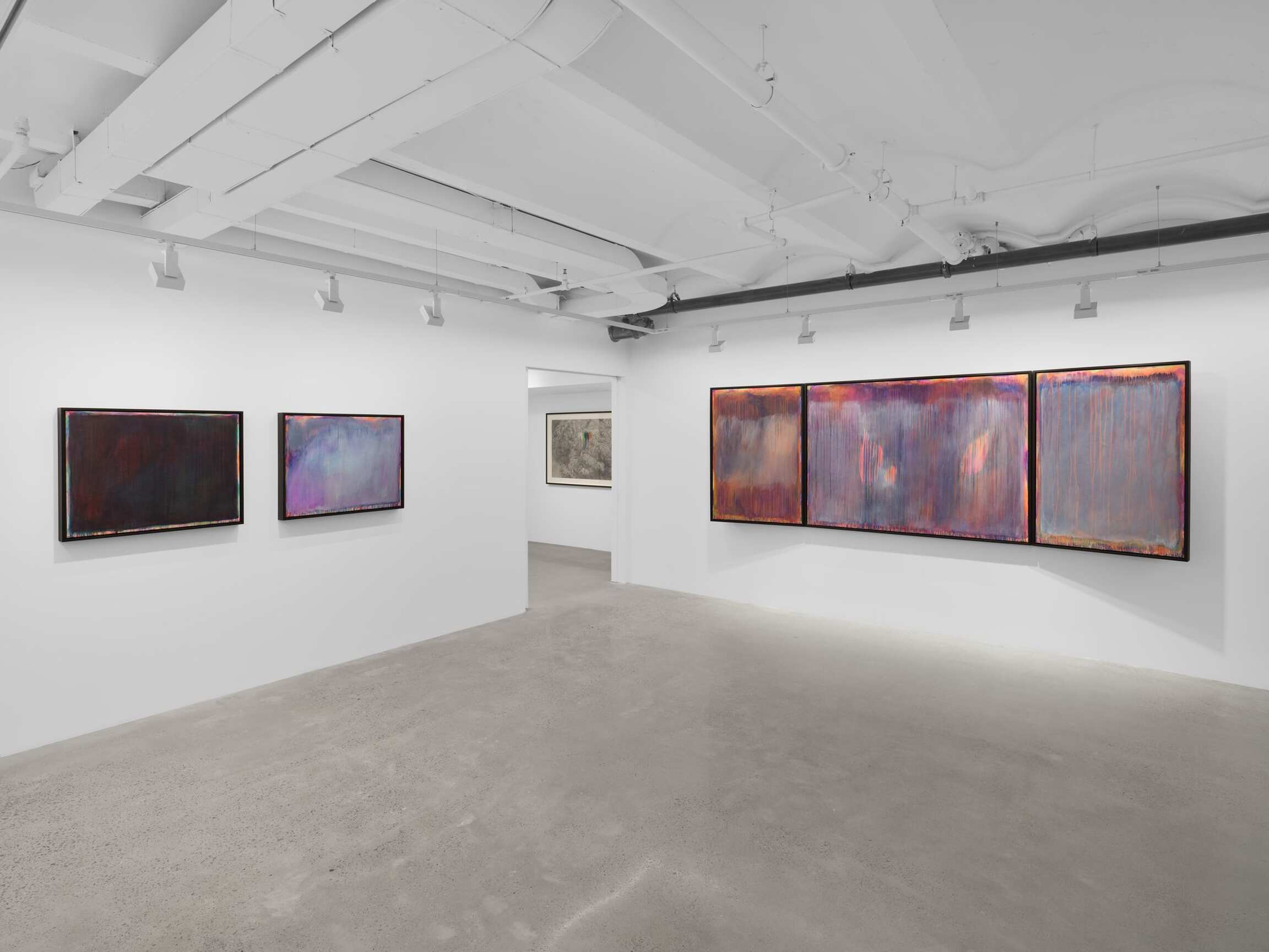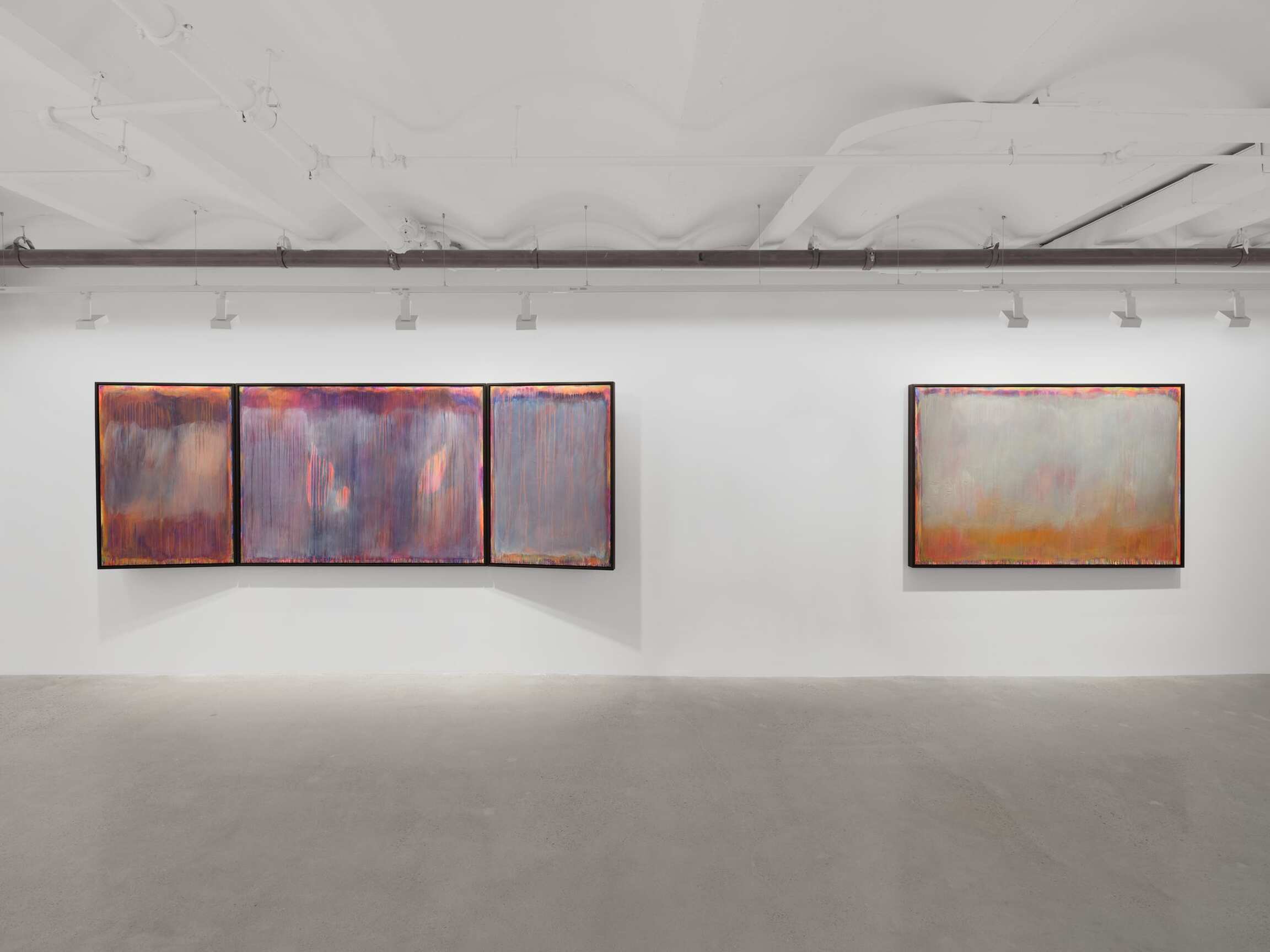 Arranged at the height of windows with a shared horizon line, the paintings in the exhibition offer a 360-degree view onto a compositionally and conceptually complex miasma of colorful abstraction. Their astounding beauty is rooted in horror. Indeed, the gestural washes that veil the canvas belie the steely logic of Tran’s politically encoded color theory. Between 1962 and 1971, the United States sprayed 19 million gallons of chemical weapons onto the jungles of Vietnam. Agent Orange was the most notorious, but Agents White, Blue, Pink, Green, and Purple were also unleashed in an act of chemical warfare that caused decades of ecological and human devastation. Limiting her palette to the colors used to identify these lethal herbicides, Tran paints each color alongside its opposite, gradually producing a shroud of gray pigment that floats above its originally colorful substrate. Her systematic approach results in a painterly negation that poetically figures the trauma of neocolonial occupation. This is a landscape twice abstracted. First, through the familiar gestural marks of nonobjective painting and, second, through the coda waiting to be deciphered in the very colors that Tran initially employs.