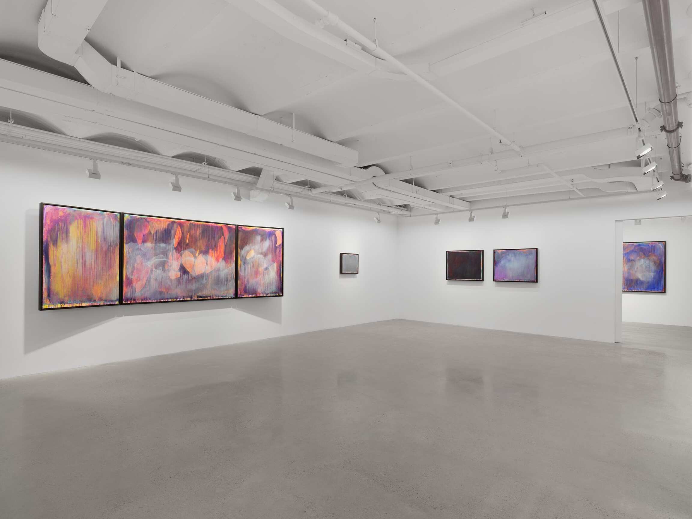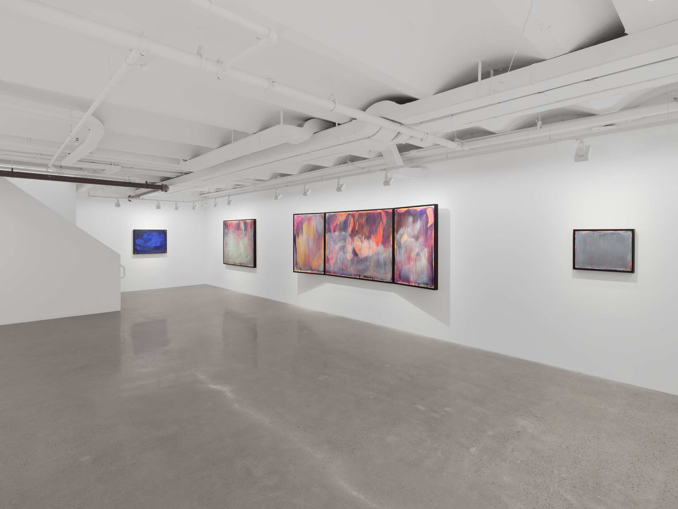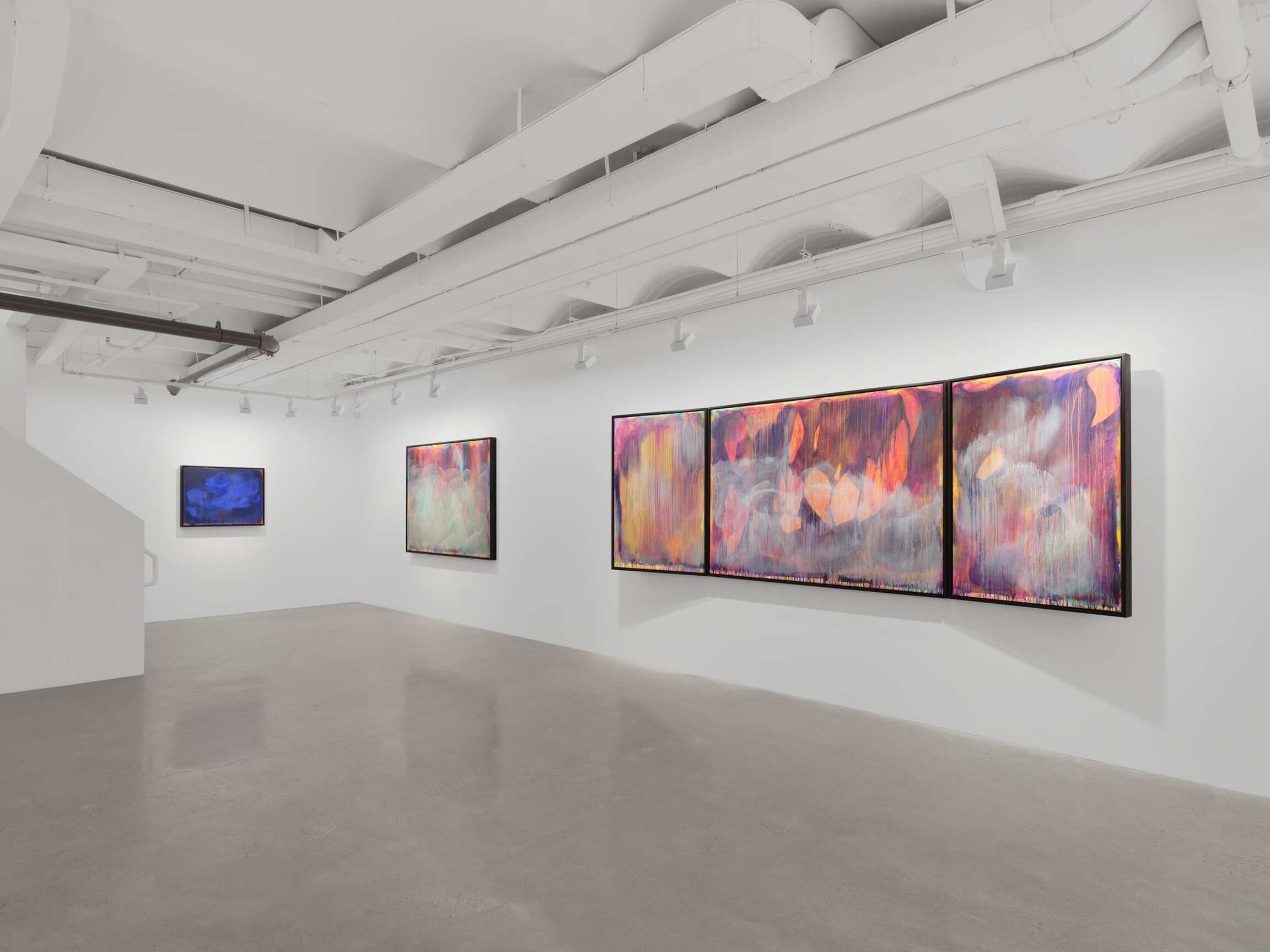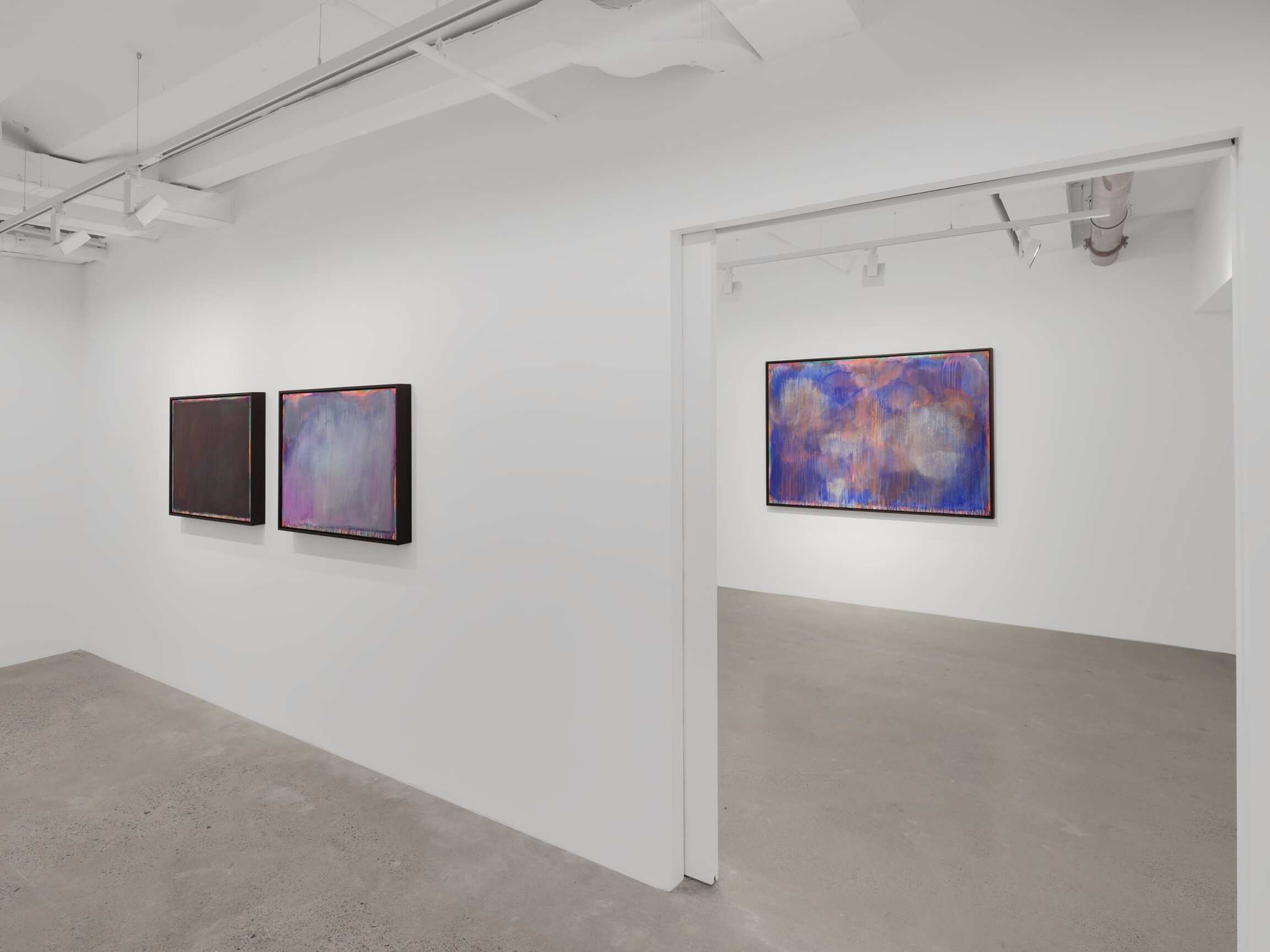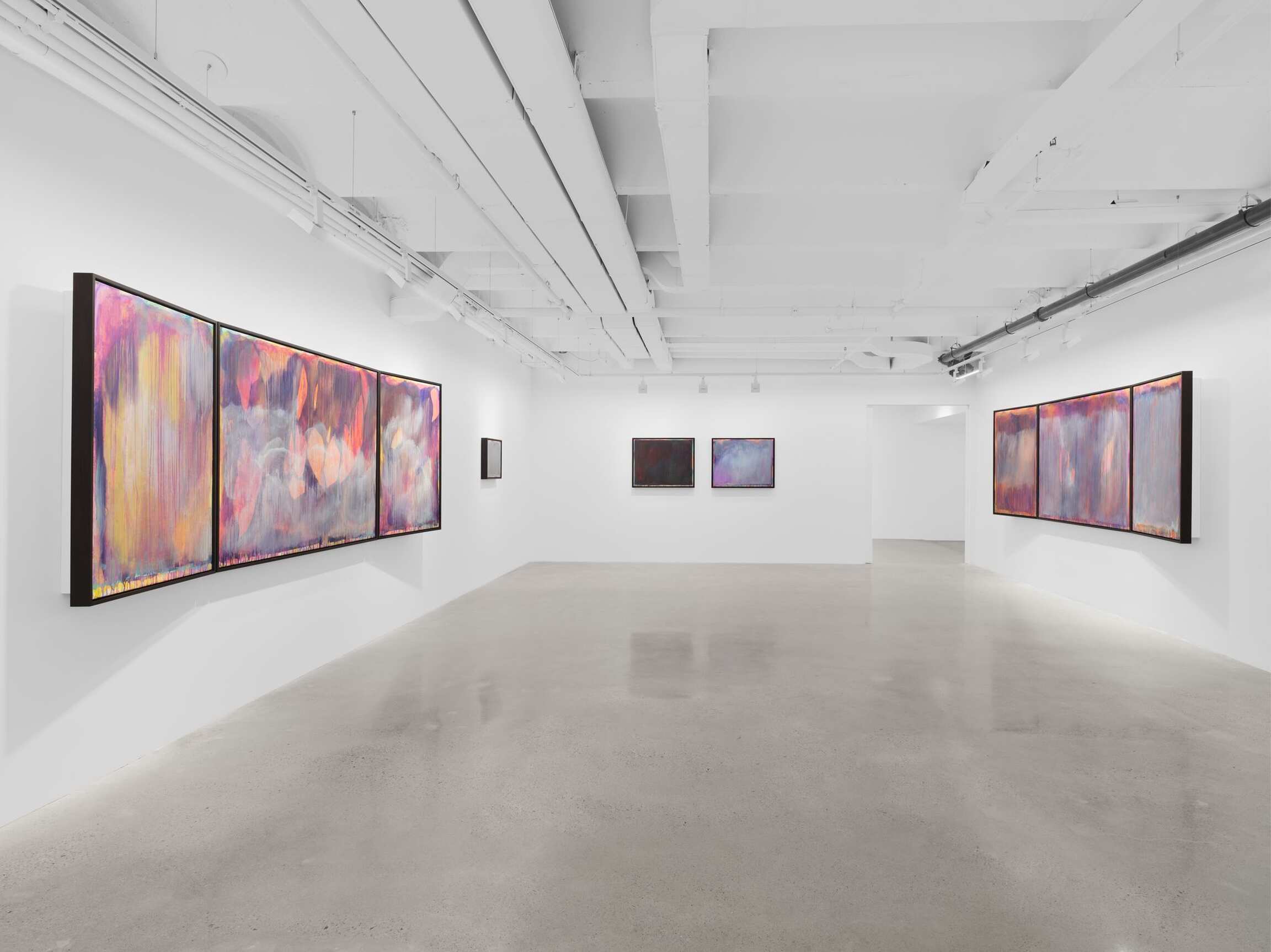 Arranged at the height of windows with a shared horizon line, the paintings in the exhibition offer a 360-degree view onto a compositionally and conceptually complex miasma of colorful abstraction. Their astounding beauty is rooted in horror. Indeed, the gestural washes that veil the canvas belie the steely logic of Tran’s politically encoded color theory. Between 1962 and 1971, the United States sprayed 19 million gallons of chemical weapons onto the jungles of Vietnam. Agent Orange was the most notorious, but Agents White, Blue, Pink, Green, and Purple were also unleashed in an act of chemical warfare that caused decades of ecological and human devastation. Limiting her palette to the colors used to identify these lethal herbicides, Tran paints each color alongside its opposite, gradually producing a shroud of gray pigment that floats above its originally colorful substrate. Her systematic approach results in a painterly negation that poetically figures the trauma of neocolonial occupation. This is a landscape twice abstracted. First, through the familiar gestural marks of nonobjective painting and, second, through the coda waiting to be deciphered in the very colors that Tran initially employs.