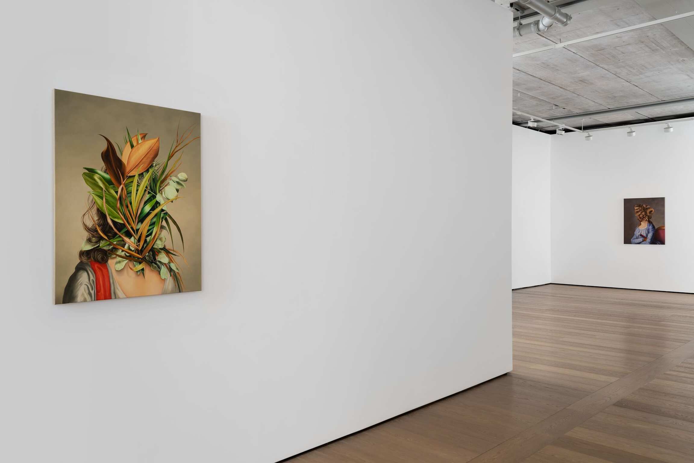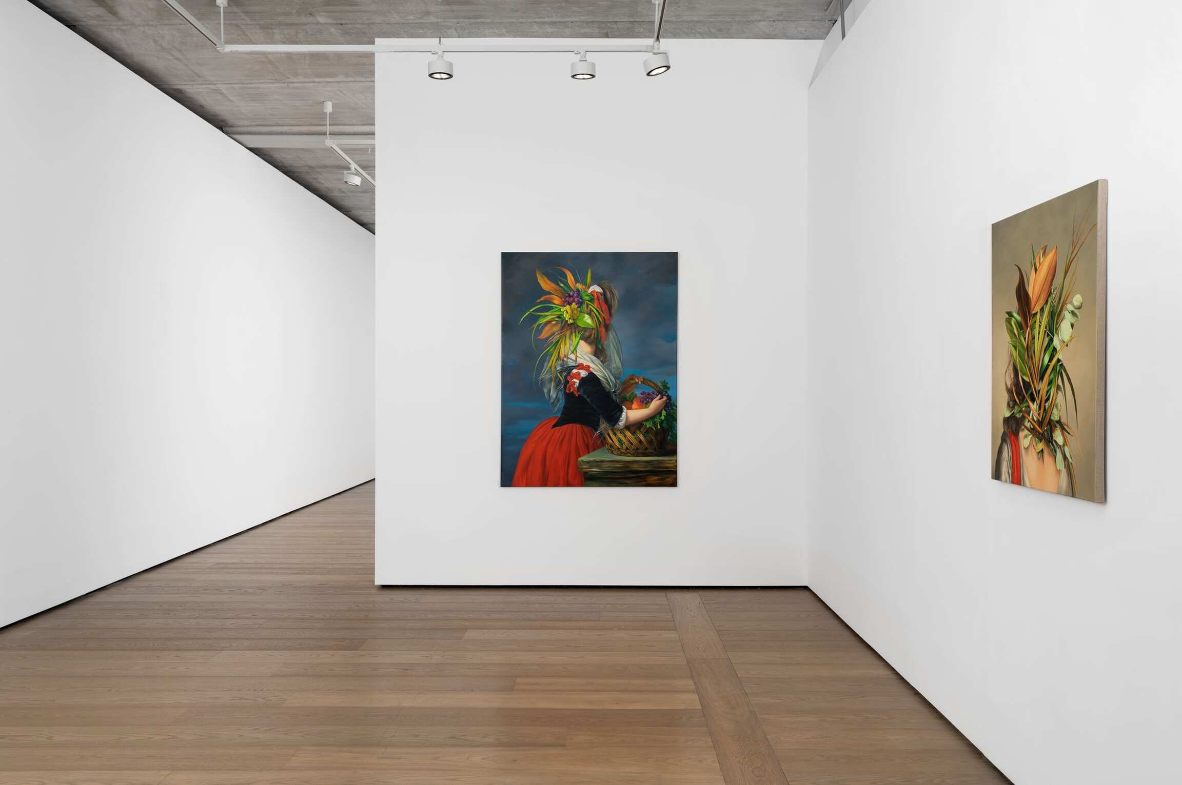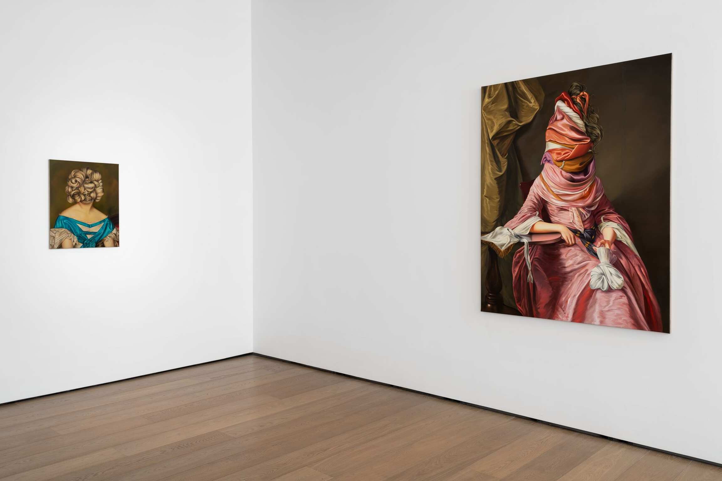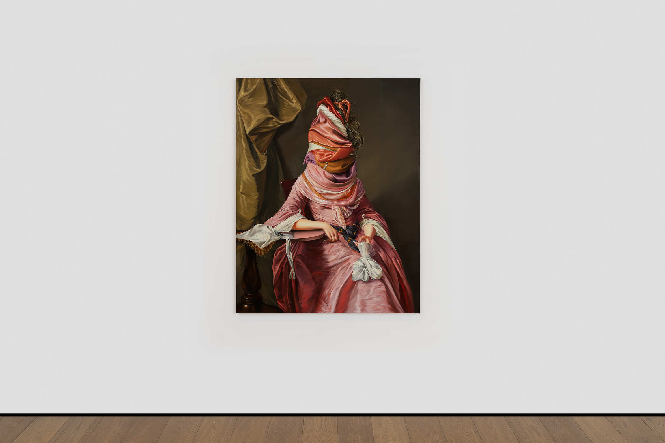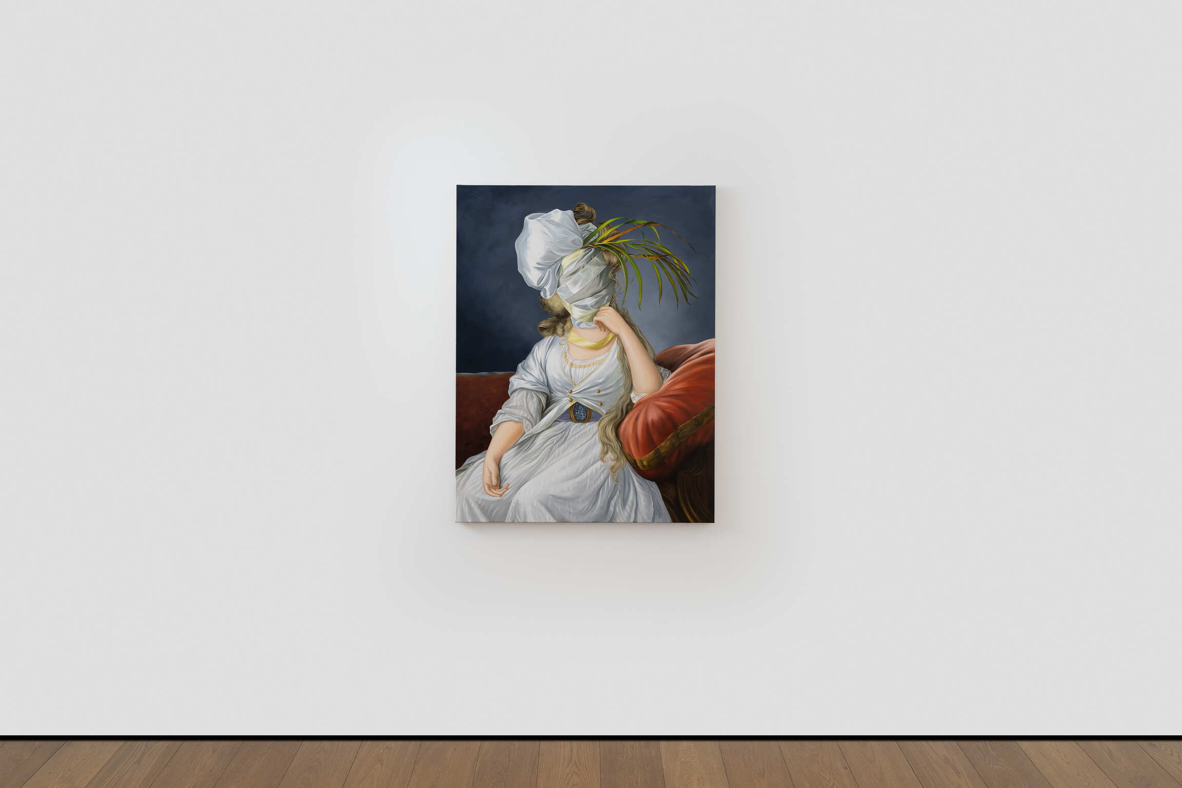 Juszkiewicz's portraits recall paintings by Élisabeth-Louise Vigée Le Brun, Adélaïde Labille-Guiard, Joseph Van Lerius, and Joseph Wright, sending us into a world that is both classical and surrealist. By covering female faces and displaying their transfiguration, Juszkiewicz revitalizes Art History through a unique language. In her paintings, the sitter’s poses are familiar, but the intention is radically new. As the artist says: