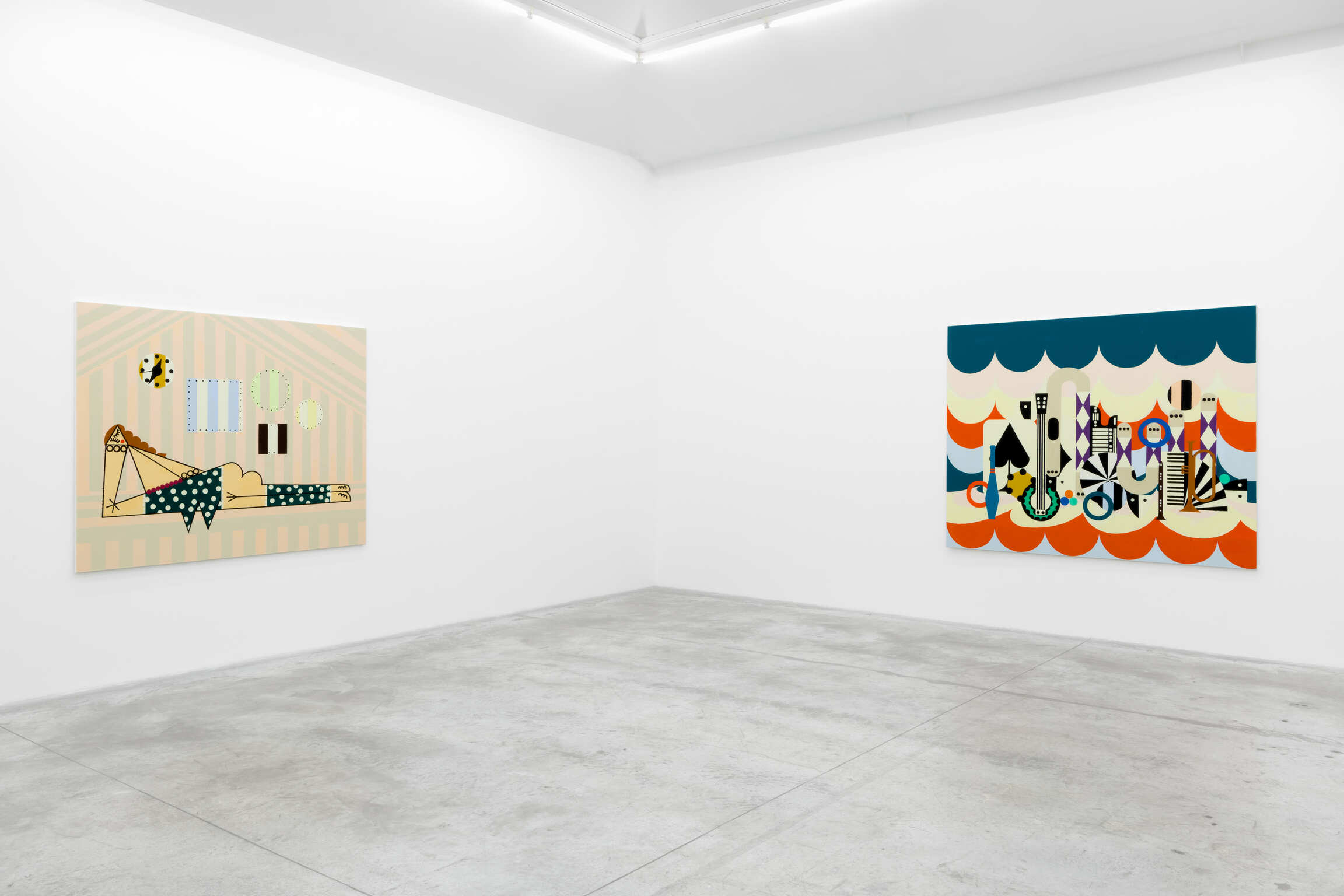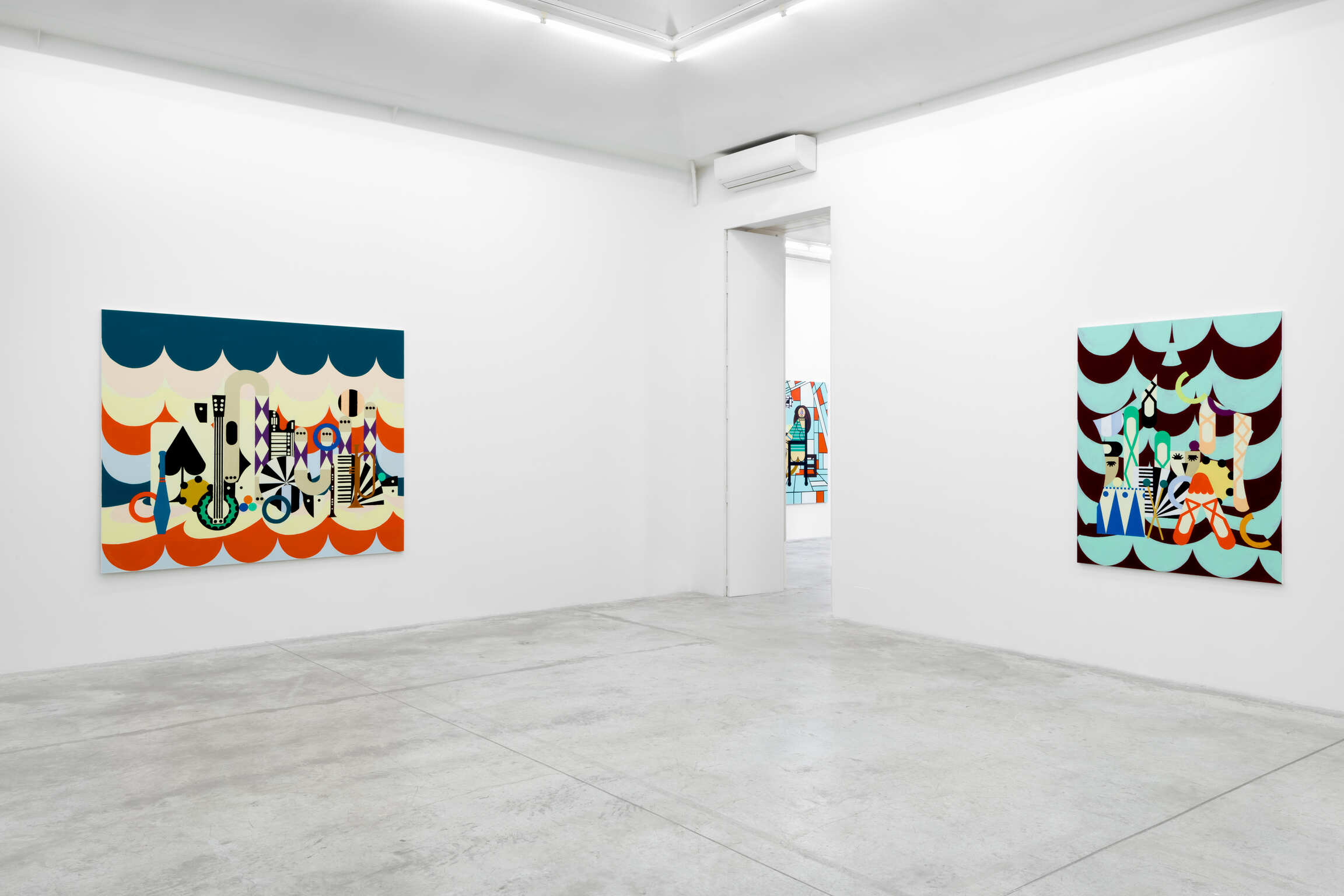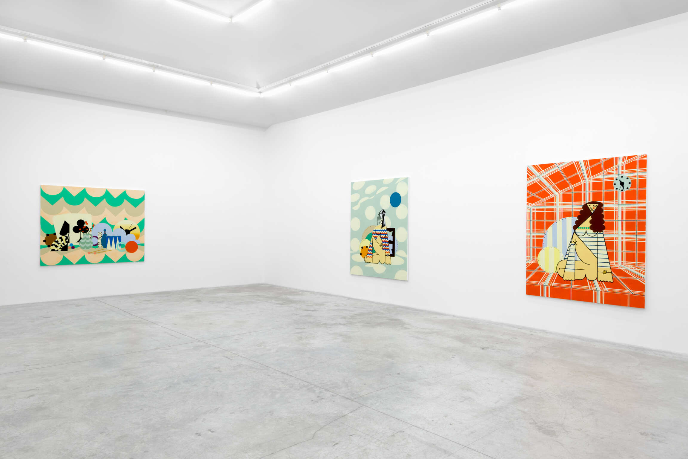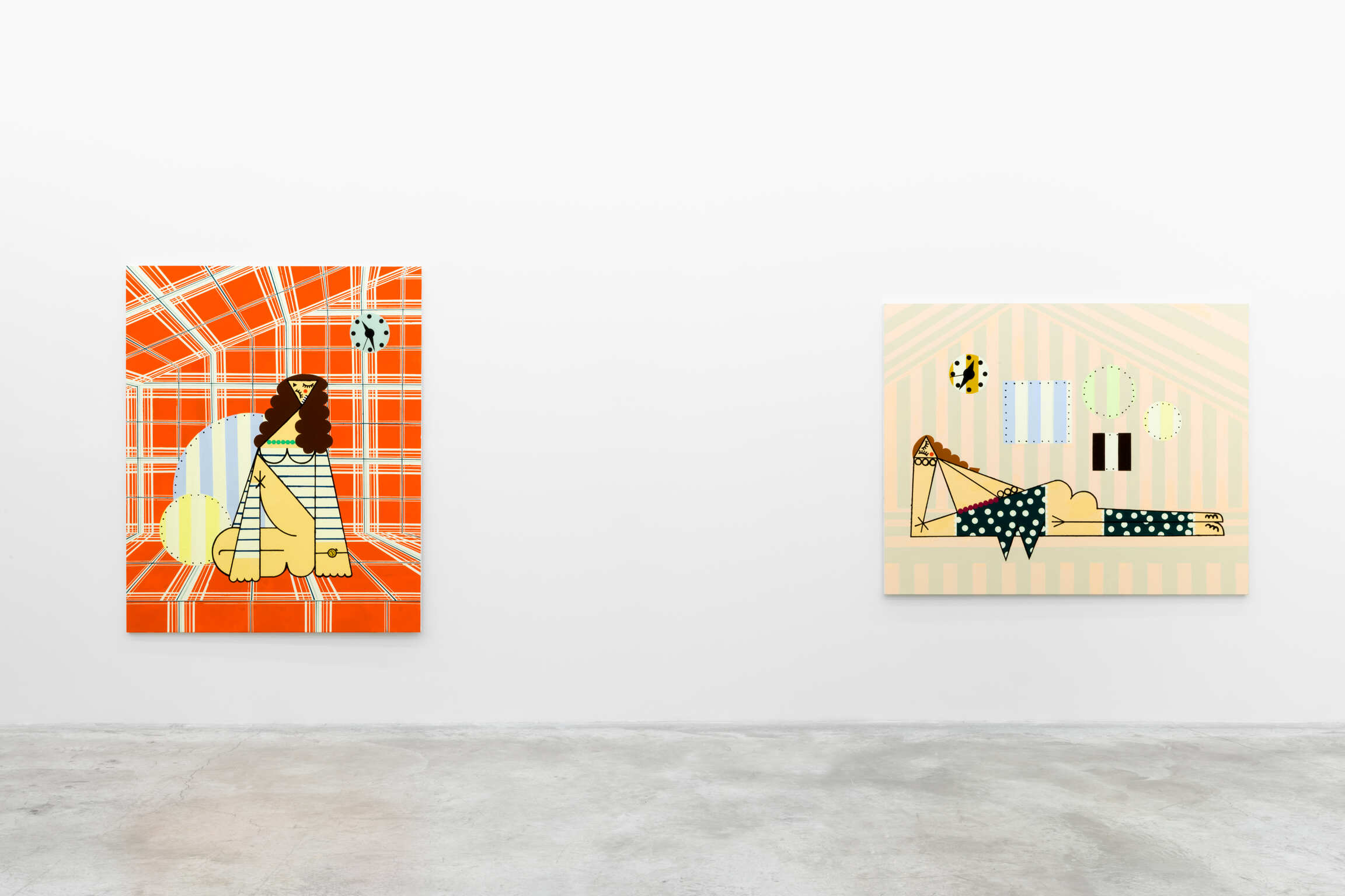 In her latest series of vivid geometric paintings, Farah Atassi intermingles references to modernist painting, decorative arts, textile motifs and folk art. Having long used colorful triangles, rectangles and circles to construct fanciful unpopulated interior scenes, Atassi has only recently begun to assemble these shapes into stylized still lifes and human forms. The suite of twelve new paintings (all 2020) presented for the first time at Almine Rech features Cubist-style female figures, musical instruments, domestic objects and circus props depicted in rooms whose colorfully patterened décors variously recall Mondrian paintings, Memphis Group designs, Scottish tartans and Pucci textiles.