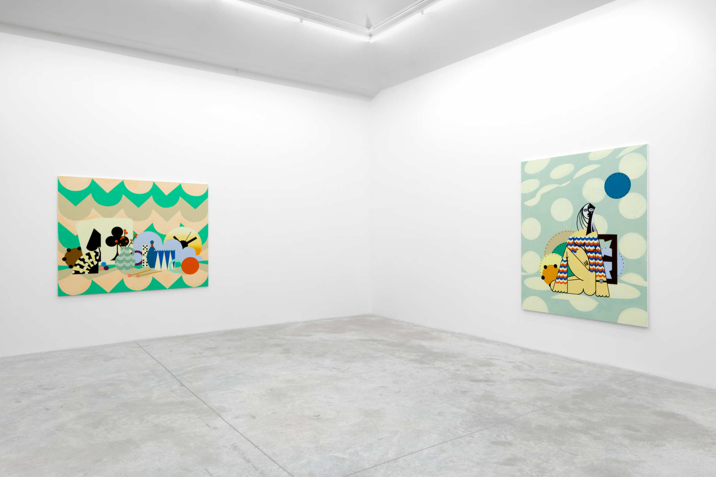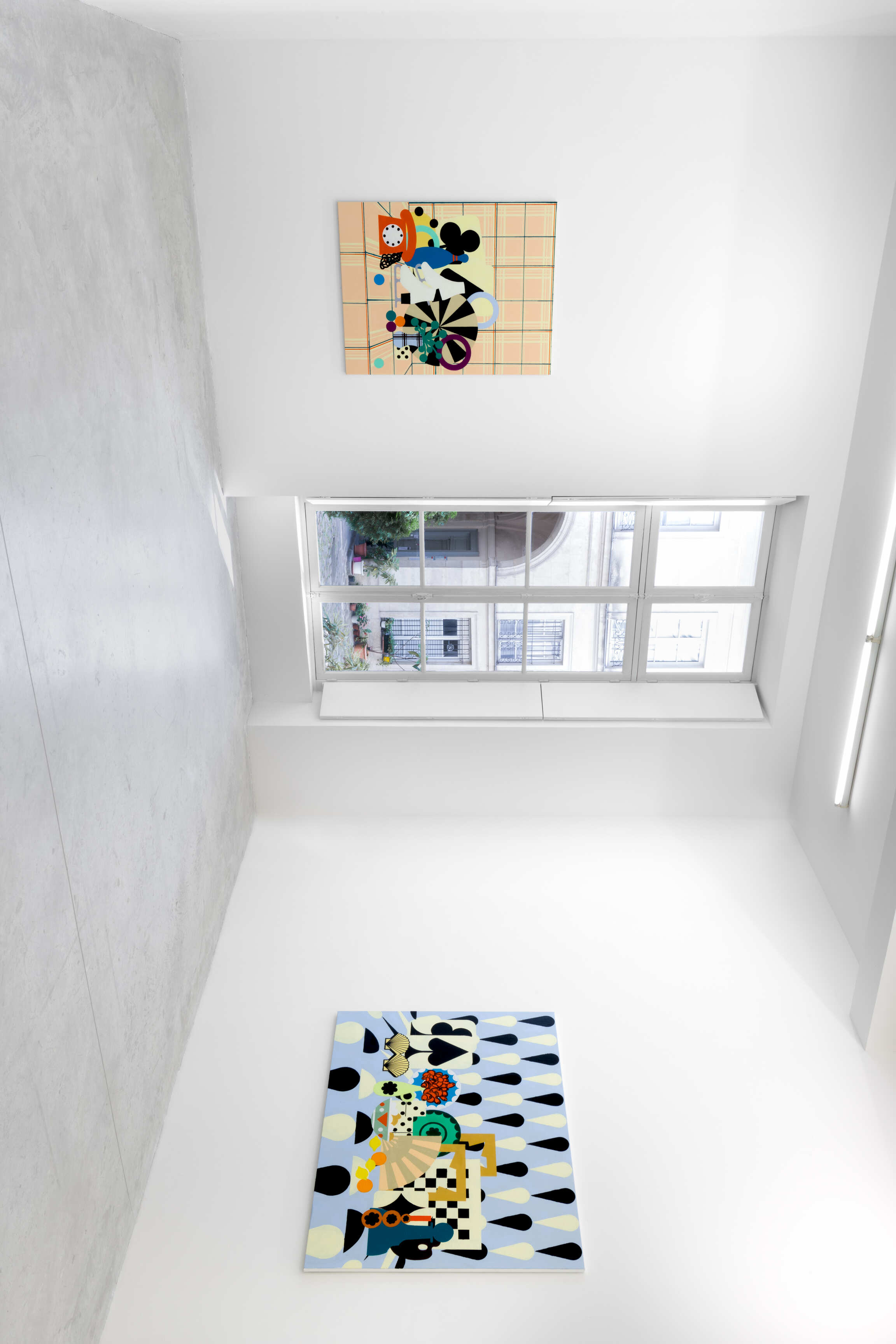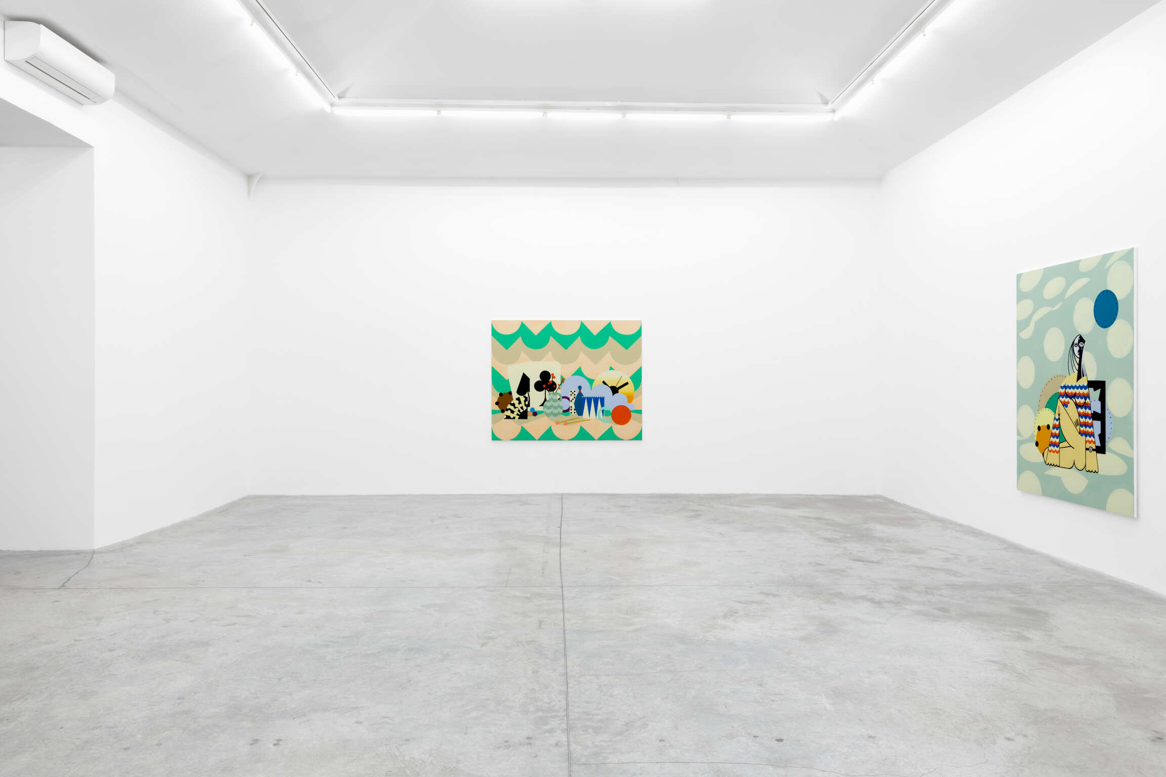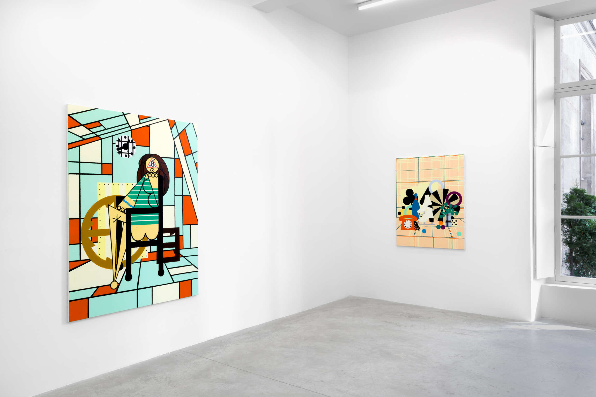 In her latest series of vivid geometric paintings, Farah Atassi intermingles references to modernist painting, decorative arts, textile motifs and folk art. Having long used colorful triangles, rectangles and circles to construct fanciful unpopulated interior scenes, Atassi has only recently begun to assemble these shapes into stylized still lifes and human forms. The suite of twelve new paintings (all 2020) presented for the first time at Almine Rech features Cubist-style female figures, musical instruments, domestic objects and circus props depicted in rooms whose colorfully patterened décors variously recall Mondrian paintings, Memphis Group designs, Scottish tartans and Pucci textiles.