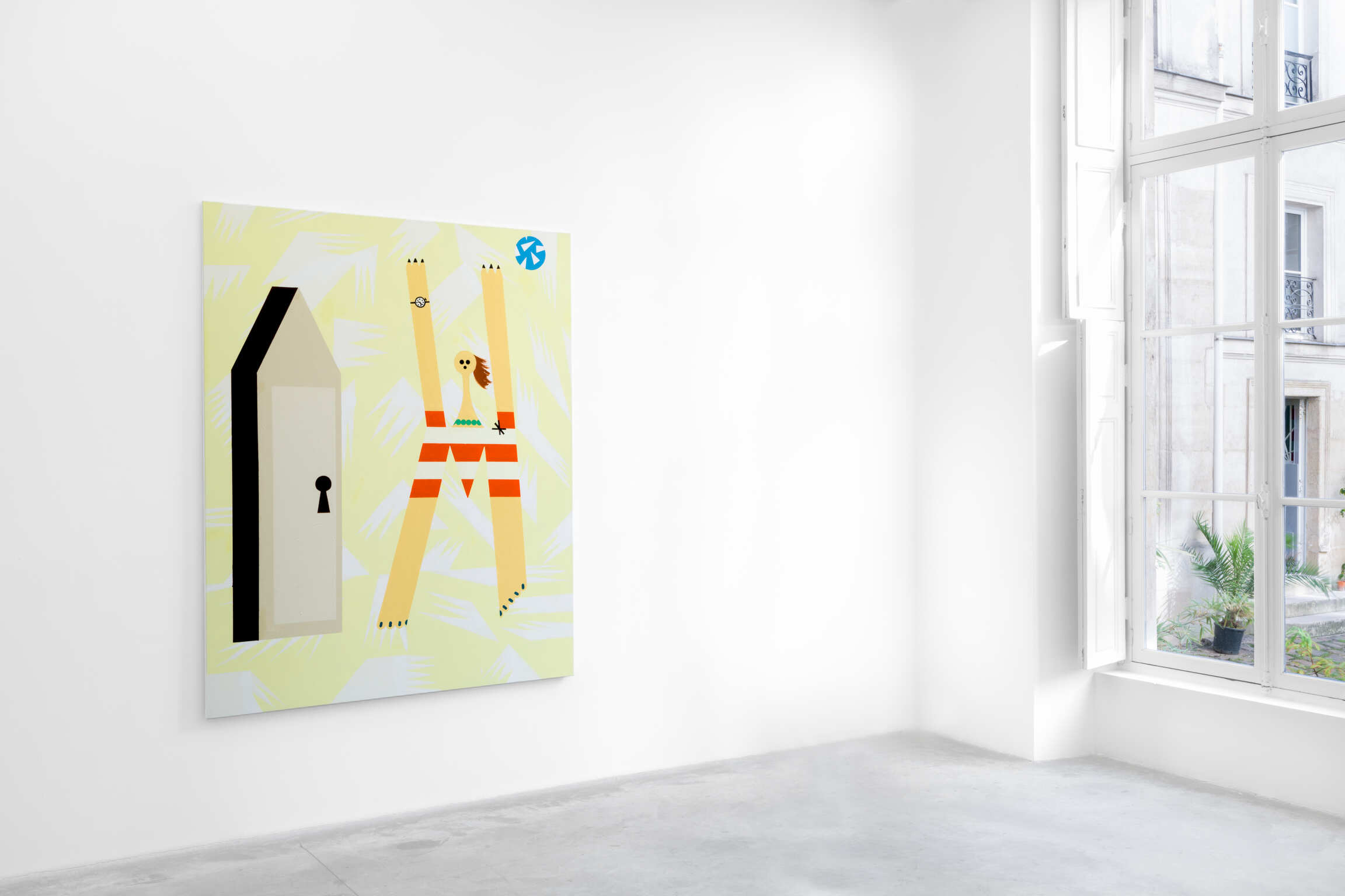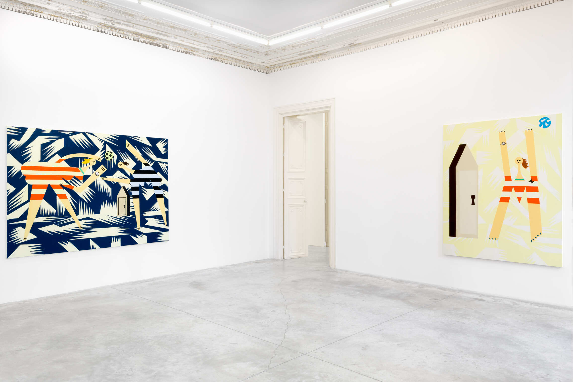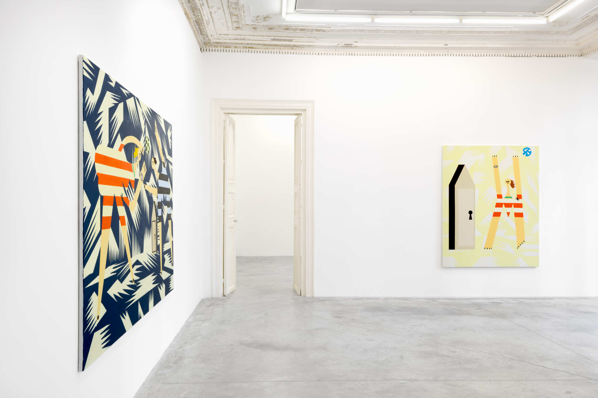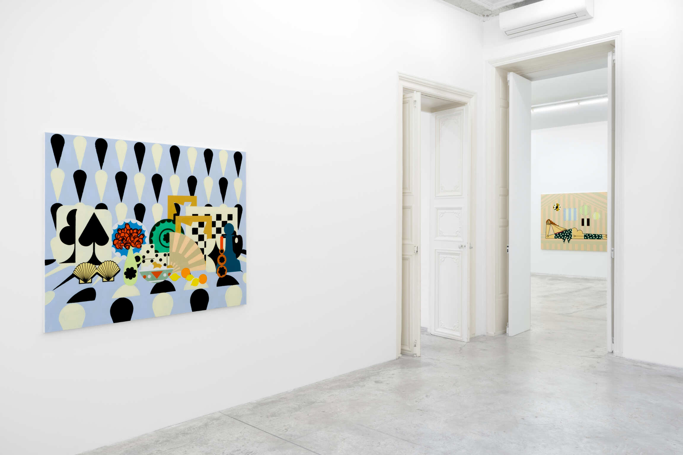 In her latest series of vivid geometric paintings, Farah Atassi intermingles references to modernist painting, decorative arts, textile motifs and folk art. Having long used colorful triangles, rectangles and circles to construct fanciful unpopulated interior scenes, Atassi has only recently begun to assemble these shapes into stylized still lifes and human forms. The suite of twelve new paintings (all 2020) presented for the first time at Almine Rech features Cubist-style female figures, musical instruments, domestic objects and circus props depicted in rooms whose colorfully patterened décors variously recall Mondrian paintings, Memphis Group designs, Scottish tartans and Pucci textiles.