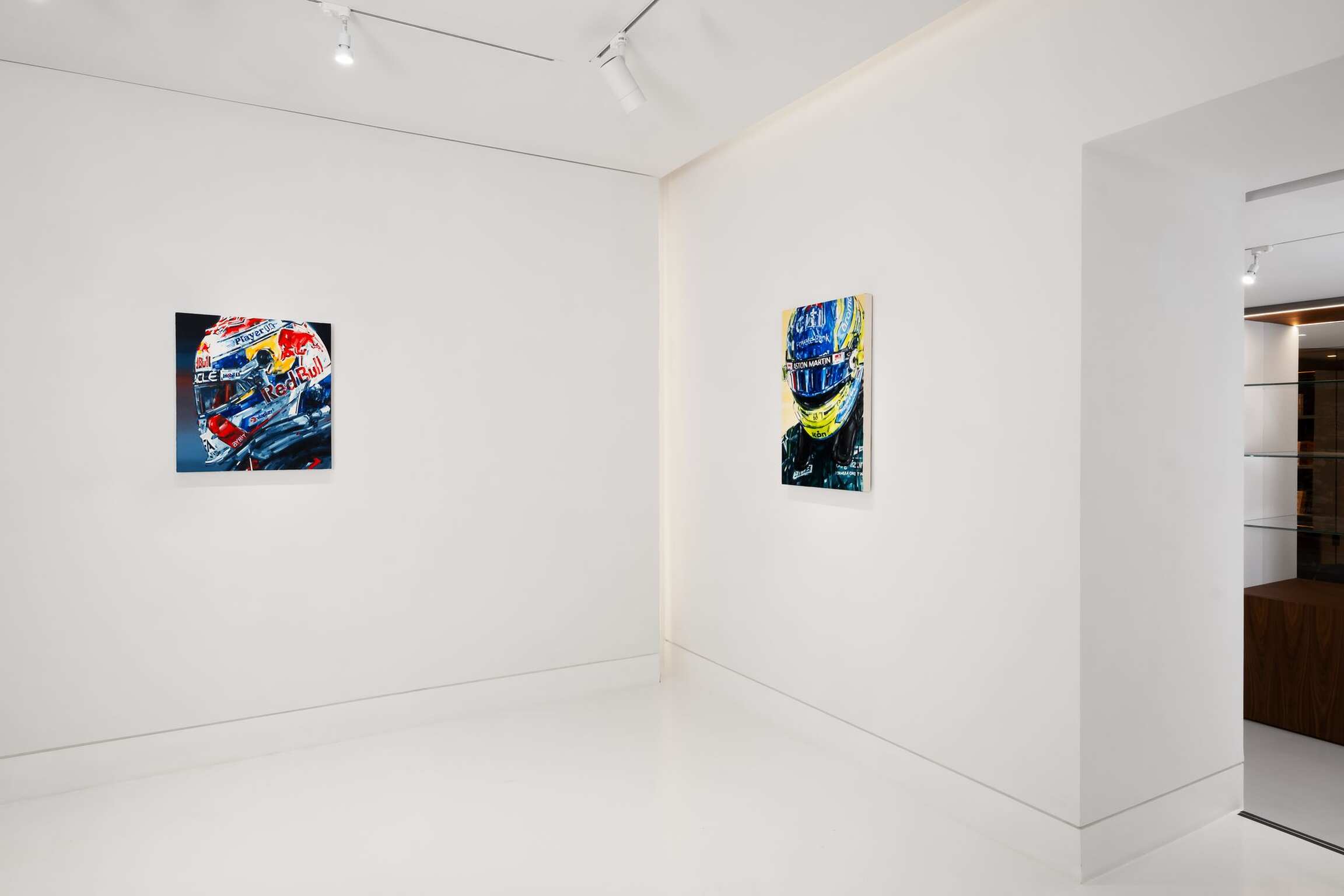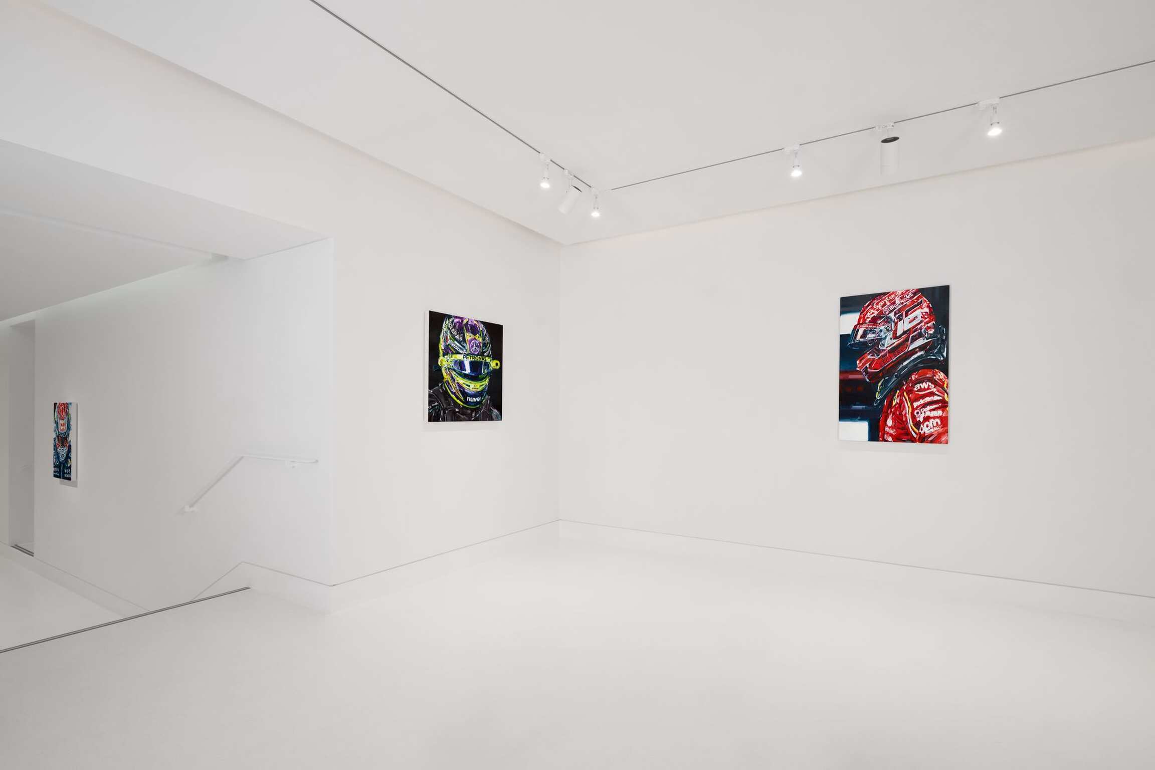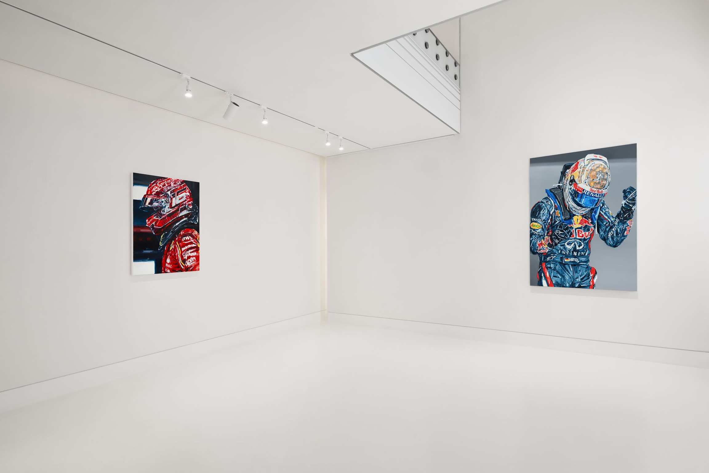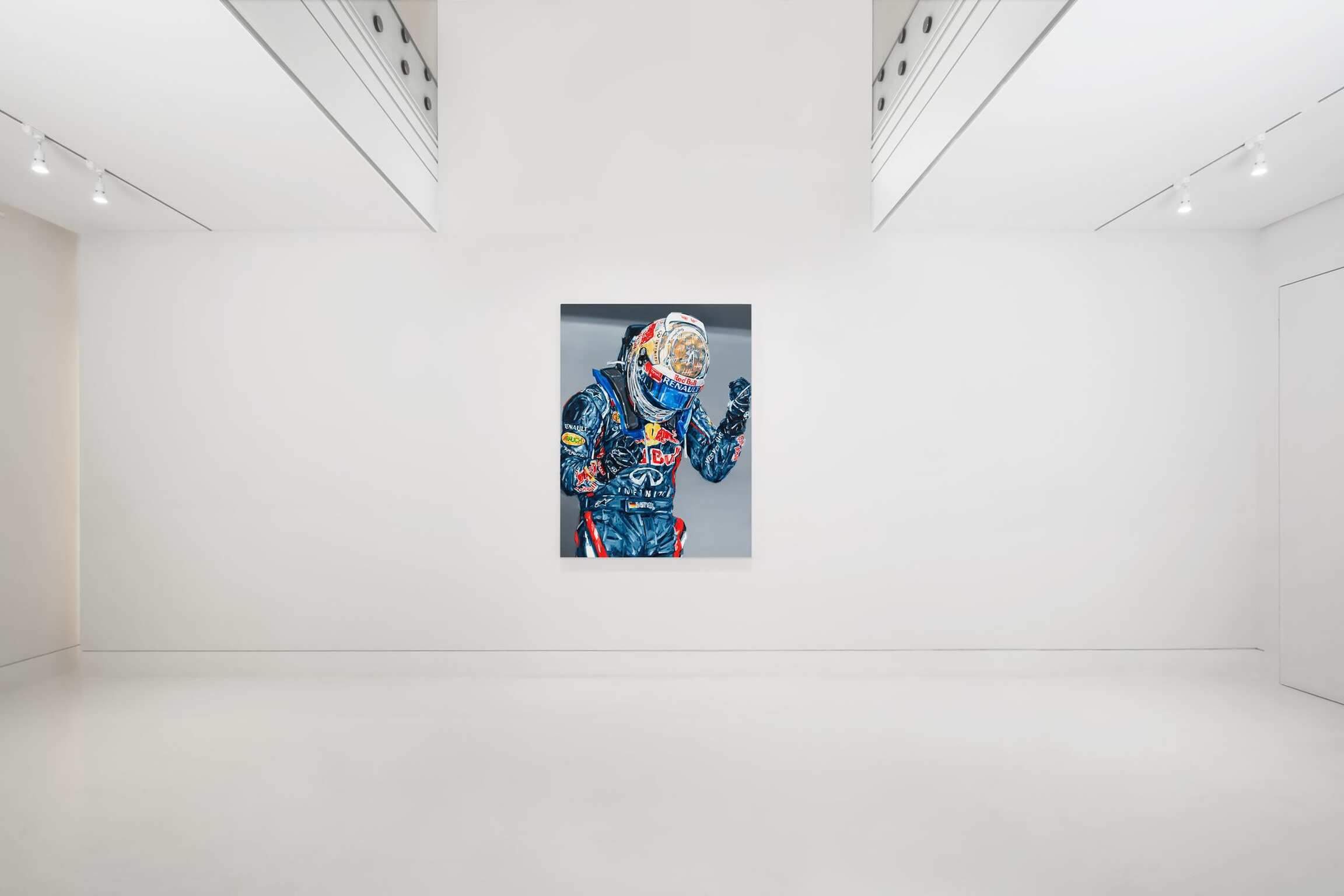 À travers son travail, Michael Kagan rend hommage aux grands héros de notre époque. Astronautes, pilotes d’avions de chasse supersoniques et, comme dans cette superbe exposition chez Almine Rech, pilotes de Formule 1.
