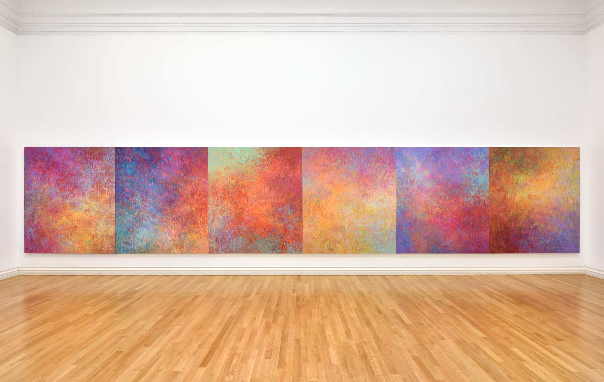 The artist envisions these paintings as a new space to be built; by creating myriad focal points he blurs all references and seeks to reach a state where it is impossible for the eye to detect what has been painted first and last. The juxtaposed layers are fused, colors are blended, and all hierarchies disappear to give way to this new purely pictorial, chromatic and sensible space composed with an infinity of shifting hues.