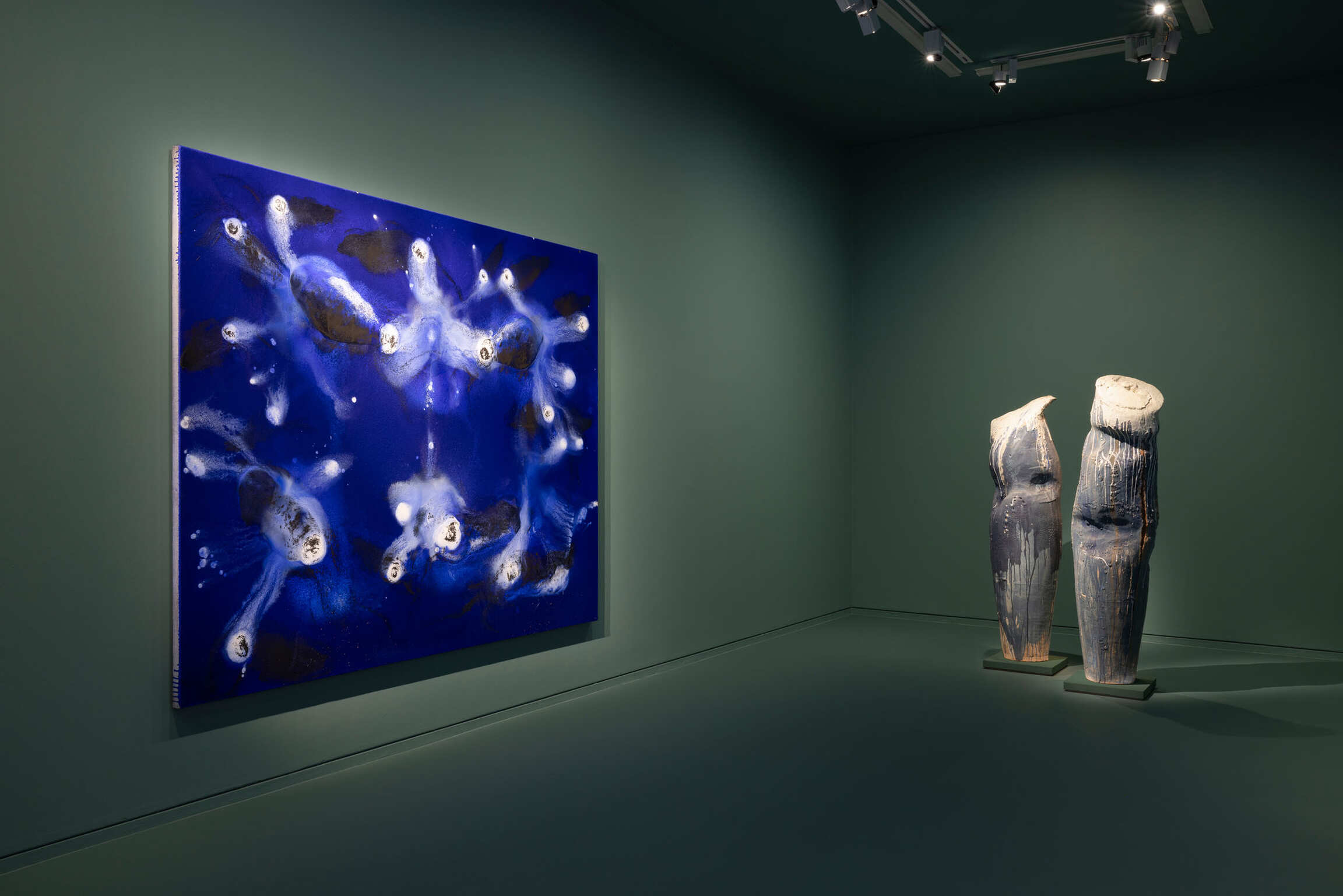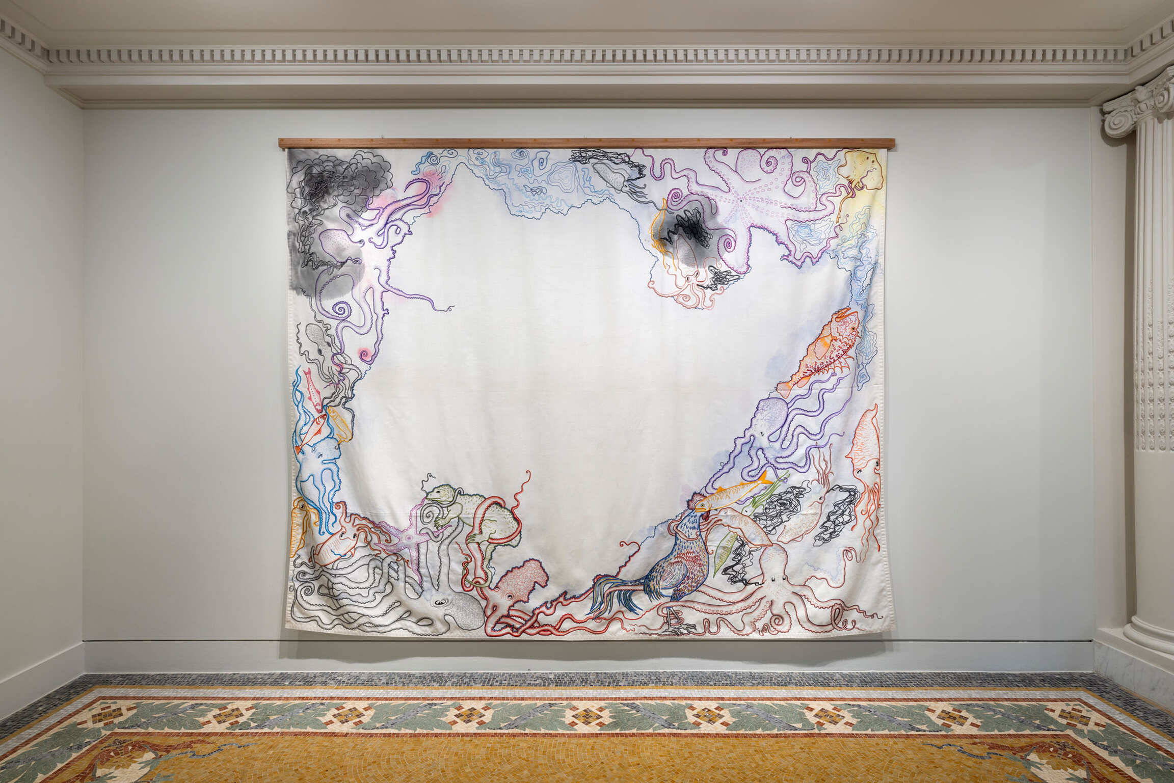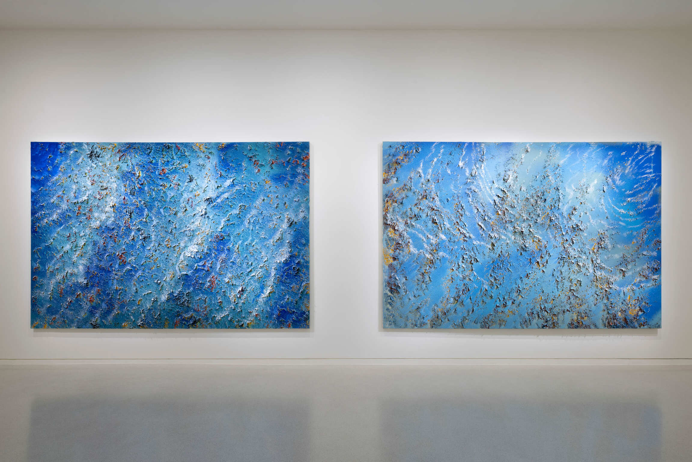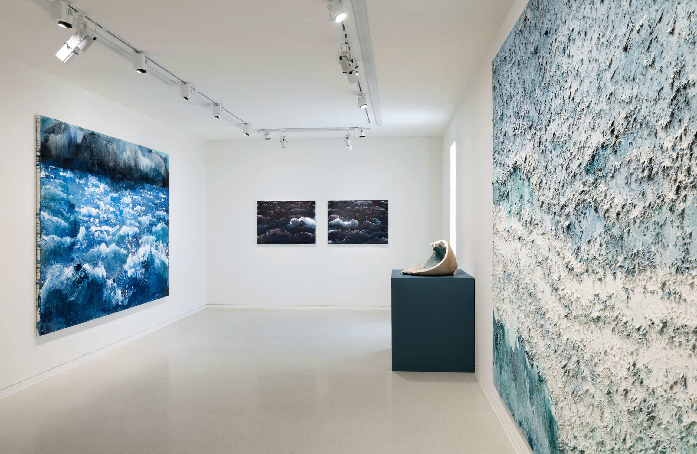 Visitors are invited to embark on an epic voyage from the beginnings of life (fossil compositions, exoplanets, ocean floors or Earth’s crust textures blending into aerial views of the sea’s surface, exploration of abysses, shapes and creatures of ocean trenches), to the presence of humans espied behind his seascapes, bestiaries, and numerous bodegón-style still lives (diving, sailing, cooking, and so on), via powerful compositions of waves and ceramics inspired by Antiquity.