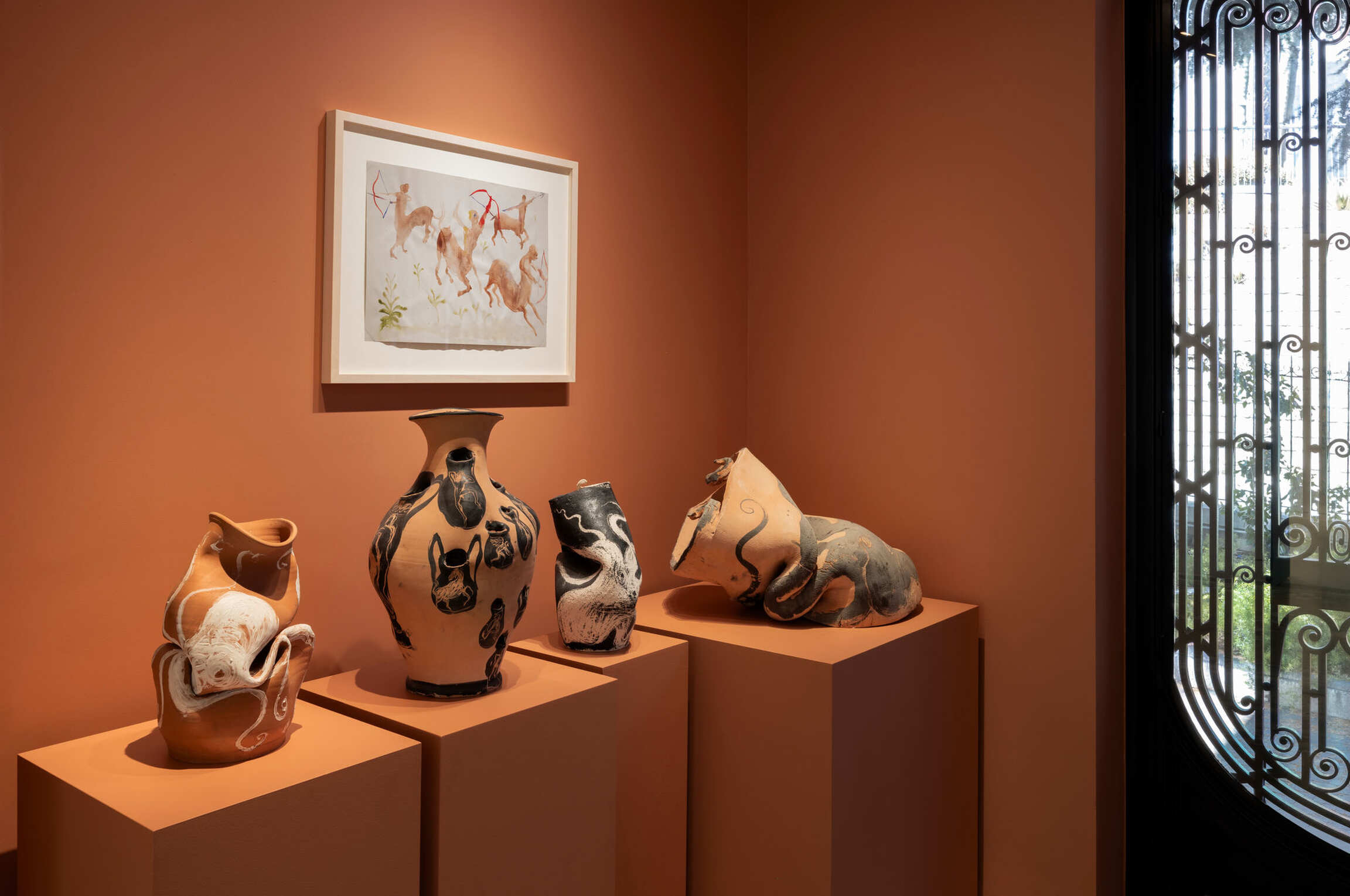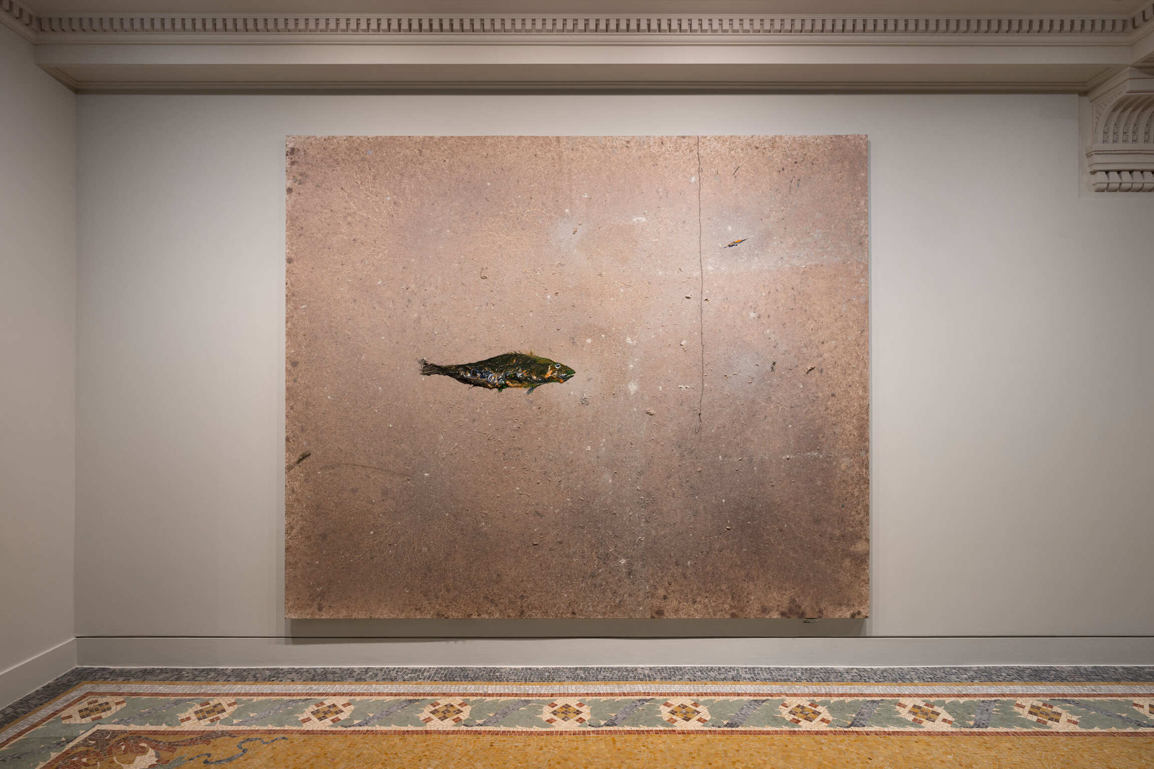 The exhibition, which revisits forty years of art borne by the sea, is constructed in a vertical progression in the Villa Paloma, as if reascending in stages from a dive into the origins of life: exoplanets, fossiliferous compositions, ocean floors or textures of the earth’s crust merging with aerial views of maritime surfaces. This is followed by an exploration of the depths and the extraordinary animals they contain, both forms and fauna, all the way to the evocation of a human presence that we first glimpse in the surprising tête-a-tête of a fish and a hook, followed by the return from fishing and still lifes that harken back to the bodegón tradition. Ceramics inspired by antiquity take us back to the culture of the great ancient Mediterranean thalassocracies."