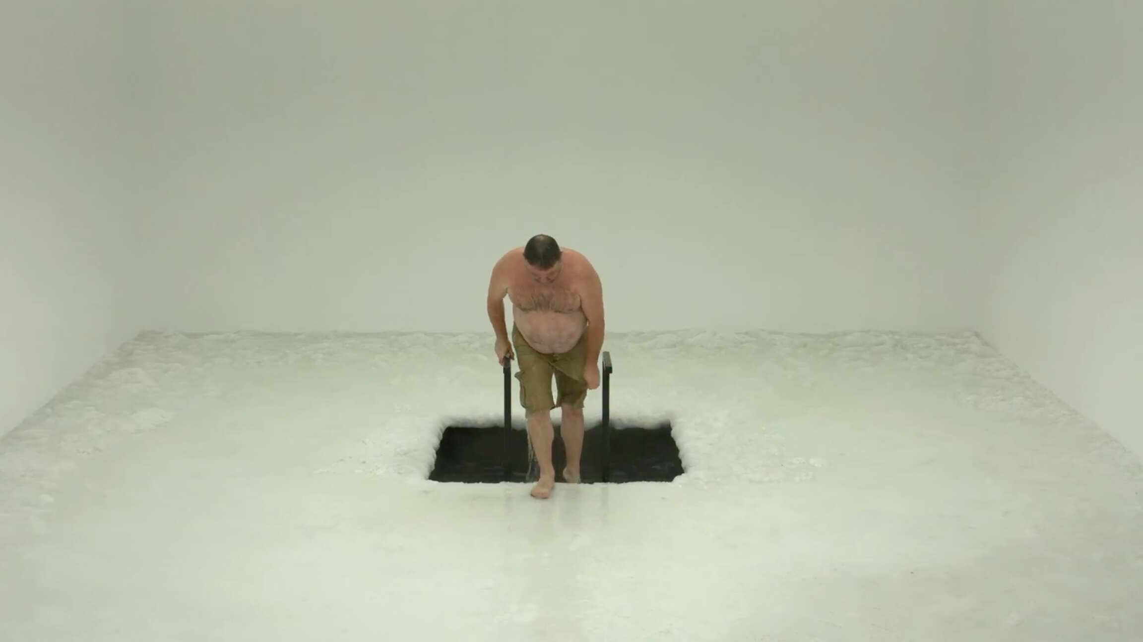 In Simon’s A Cold Hole, participants experience the effects of frigid water, as visitors observe from an adjacent gallery. Within the gallery, Simon arrests time –– creating a space of perpetual winter.