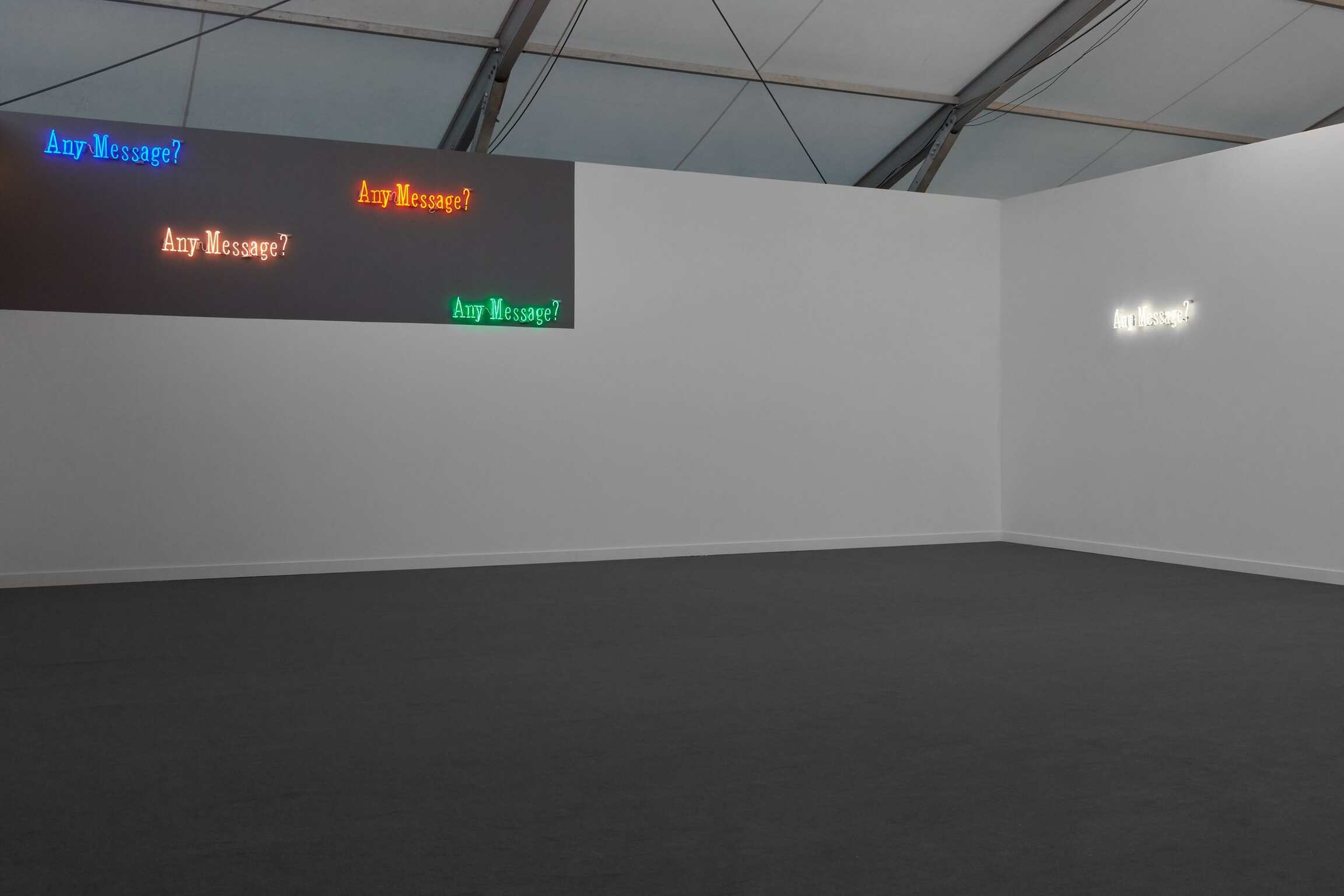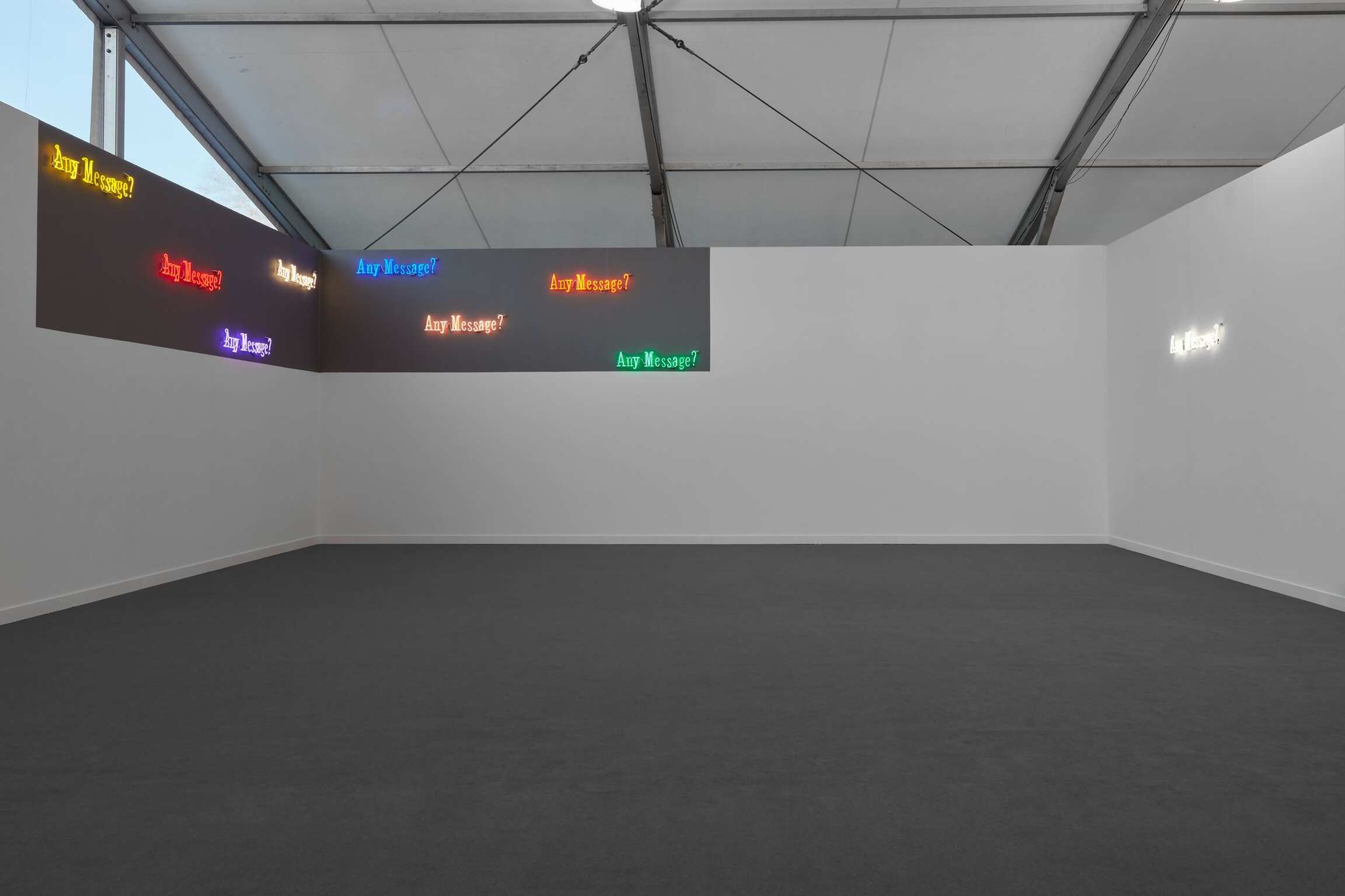 Nineteen Eighty-Four (Orwell) (2018) is made up of body of different colored neon works that read Any Message?. In this new series of work, Kosuth appropriates this text from George Orwell’s futuristic novel 1984, a story which gives a tragic illustration of what the world would be without the freedom to think.