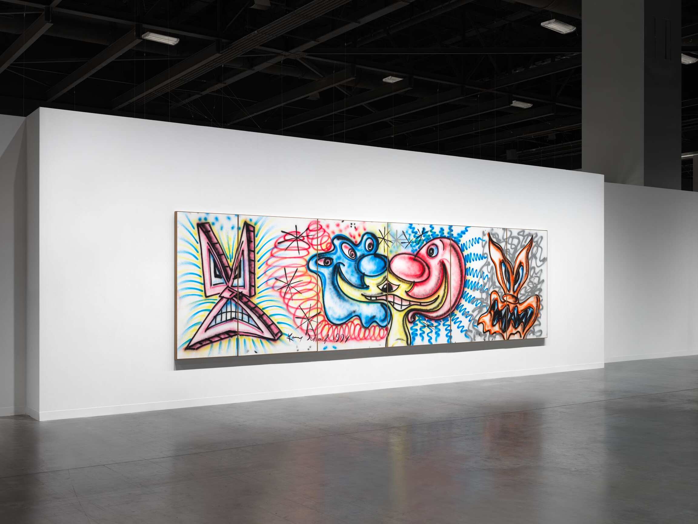 In the Meridians Sector, Almine Rech is pleased to present a historical work by Kenny Scharf (b. 1958, Los Angeles) created in Belgium in 1994. This large-scale spray painting on wood measuring nearly seven meters in length is executed in the spontaneous and playful style associated with wall graffiti.