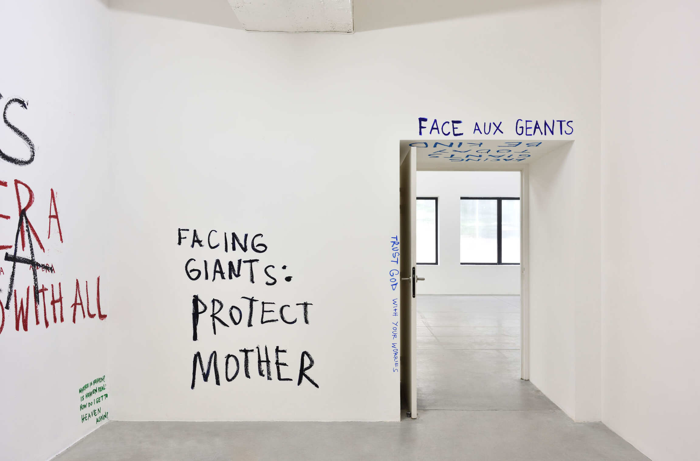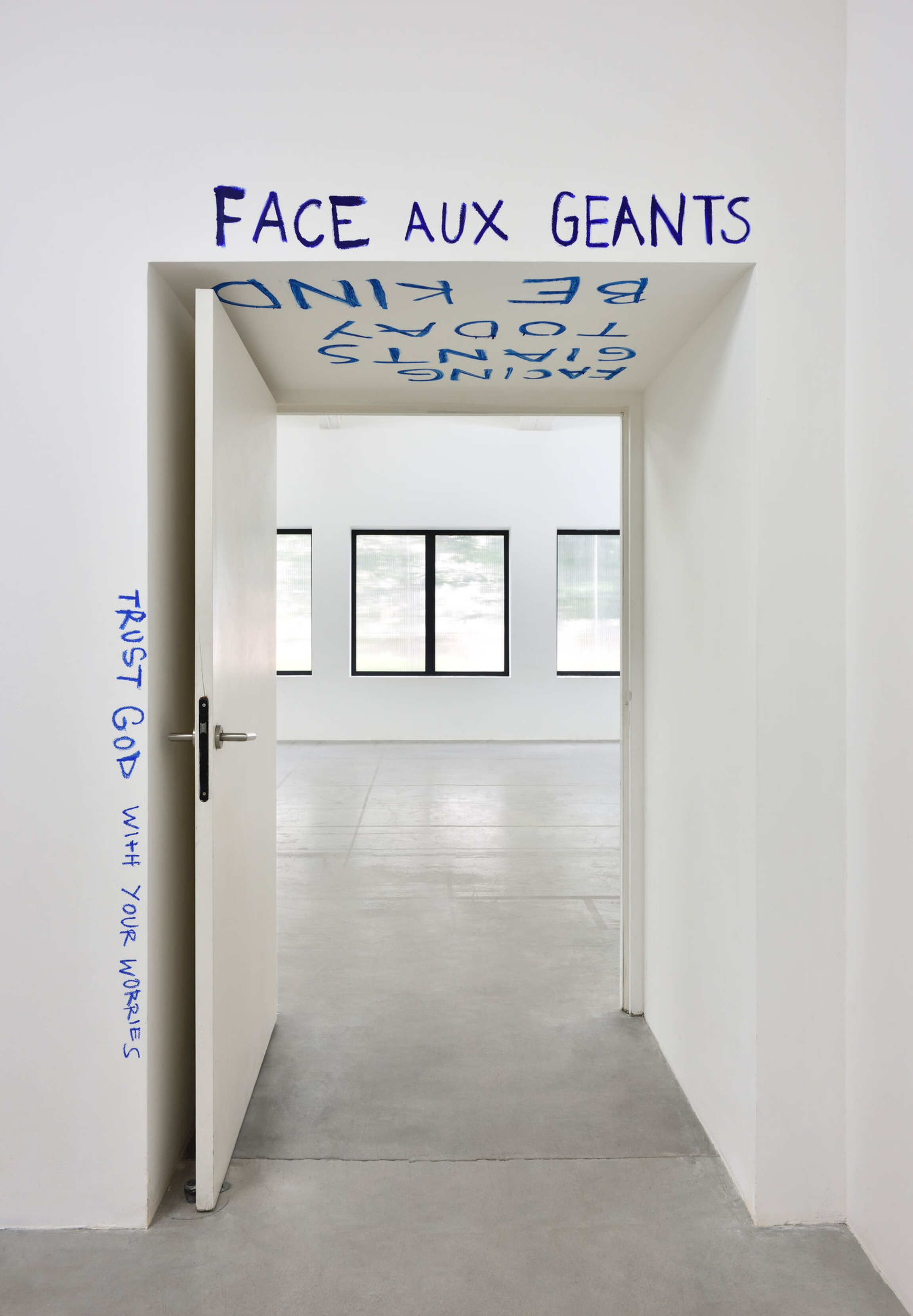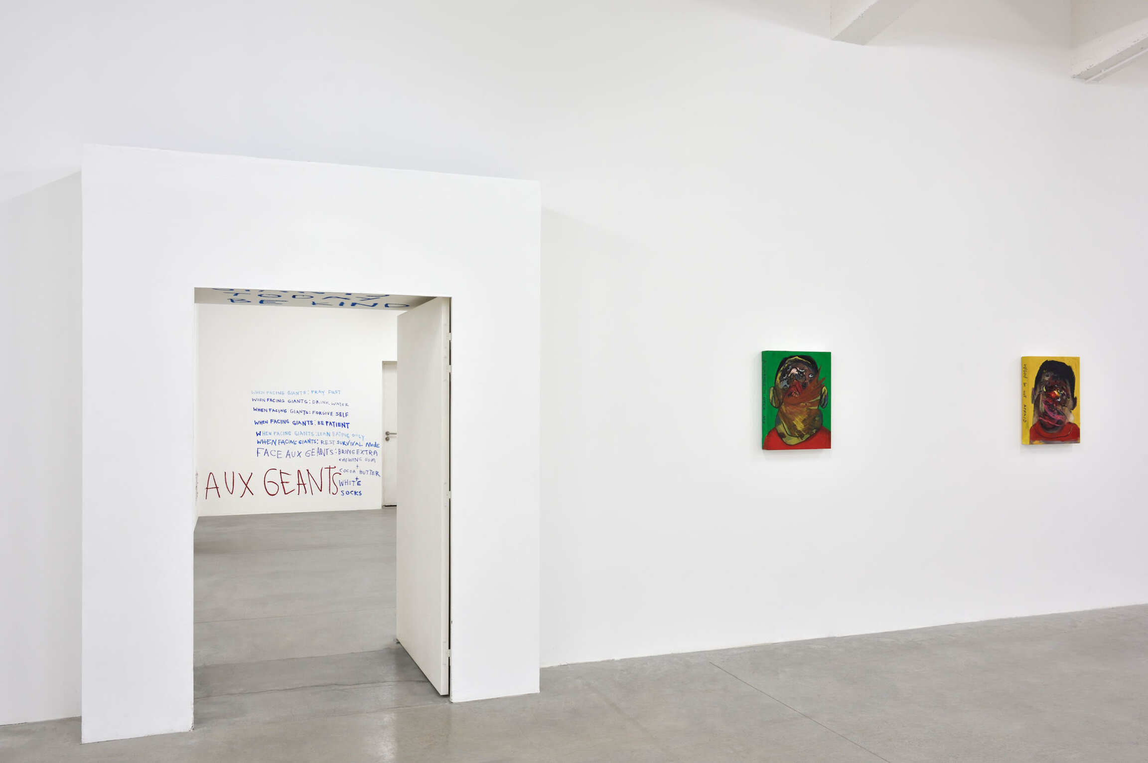 Entering Genesis Tramaine’s exhibition 'Facing Giants’ 'at the Consortium, we are met with sentences across the white walls, near faces of saints and apostles painted by the artist. Brief phrases, marring the wall until we remember what they must shout. Words chanted like a prayer, calling to us and teaching us to face the giants, to face the world.