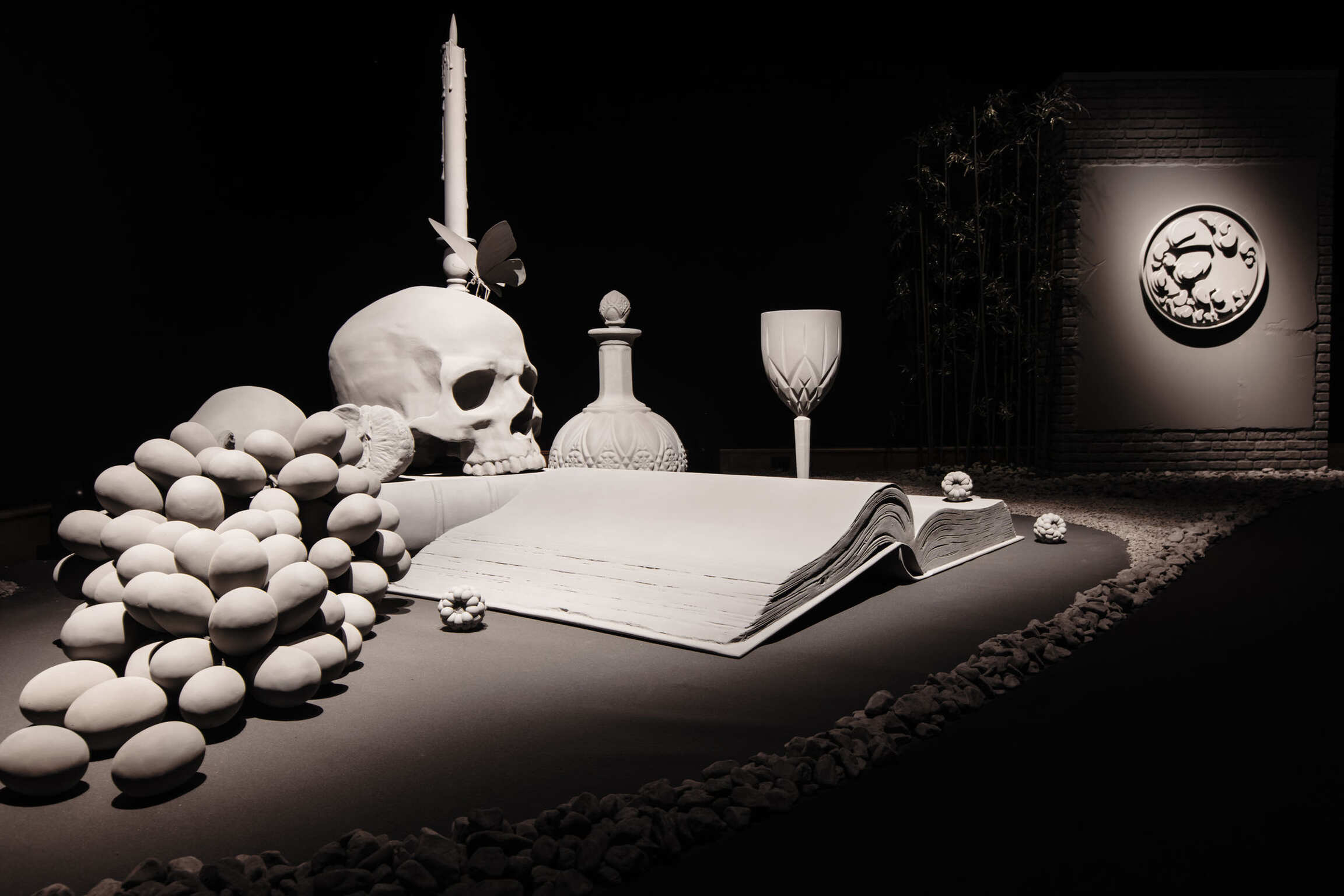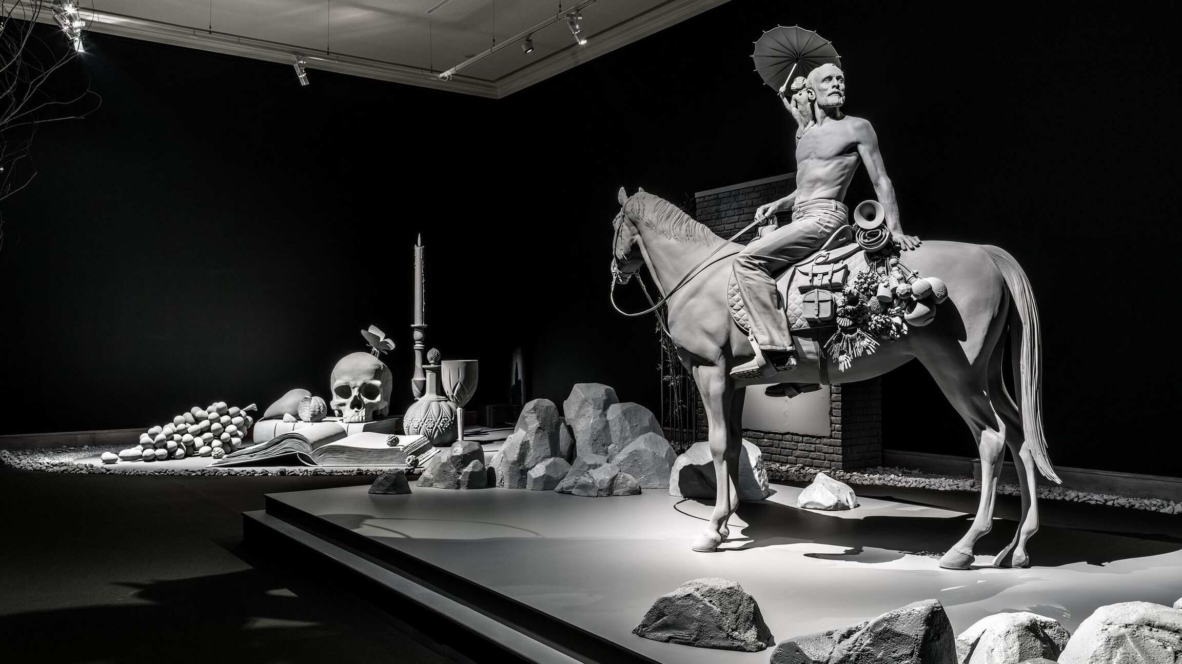 © SABAM Belgium 2025, Studio Hans Op de Beeck - Photo: Sanne De BlockWith every step we encounter another phantasmic scene, taking us deeper into the exhibition, and further into the mind of the artist, in which his choice of materials is as much ephemeral as it is physical. Silence and space shape what we see and how we experience it, as he sees the stillness as facilitating the mindful and meditative, whilst space, a carriage, corridor or even a corner of a room are cast as poignant relics from reality, as we wander through this grey graveyard of detached dreams and dormant desires. Yet the stillness, far from empty, detaches the exhibition from reality, pregnant with emotion and charged with the presence of the human spirit. Works like Danse Macabre (2021), Vanitas XL (2021), The Boatman (2020), and the signature work The Horseman from the same year, appear like illusionary landscapes that fill our field of vision, and if ever our dreams were epic, then these are the scenes deserving of our attention. Appearing like a series of still lifes, the most obvious is Vanitas XL, where Op de Beeck resurrects the language of the still life on a monumental scale, in which a human skull, fruit, a flute, an open book, and a glass take on an unsettling scale that doesn’t wrestle with death, so much as invite life back in when everyone has awoken. The reward of the exhibition is profound, of a rare kind of seeing that begins where daylight ends.