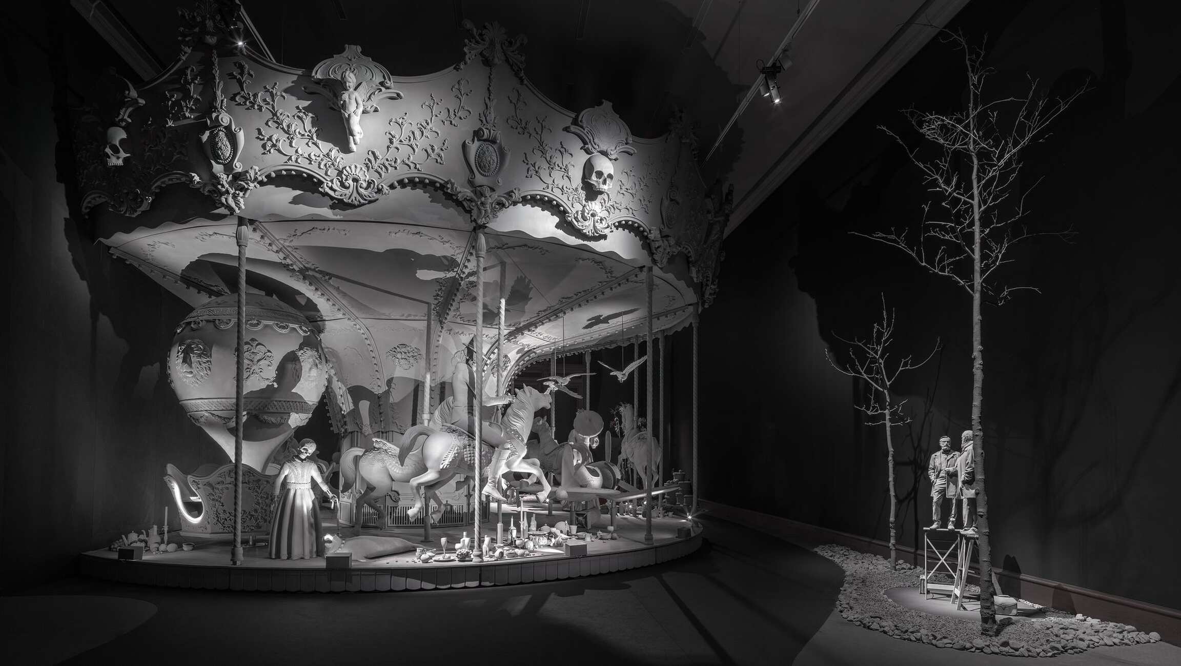 © SABAM Belgium 2025, Studio Hans Op de Beeck - Photo: Sanne De BlockFrightening and fantastic, it is this surrendering to the day’s end that lies at the heart of Belgian artist Hans Op de Beeck’s work. His exhibition ‘Nocturnal Journeys’ at KMSKA in Antwerp has successfully turned its daytime interiors of old and modern Masters into a dream-induced playground. Where everything is likely to fade to nothing in the blink of an eye. If the exhibition prior to Op de Beeck’s, that of painter James Ensor, introduced the everyday as unsettling and even surreal, then here he recalls so many of Ensor’s themes, in an amusement park of his imagination. Thirty-nine monochromatic sculptures of humans, animals, and carefully selected objects, appear like theatrical props, choreographed along a winding path shaped as much by memory as imagination.