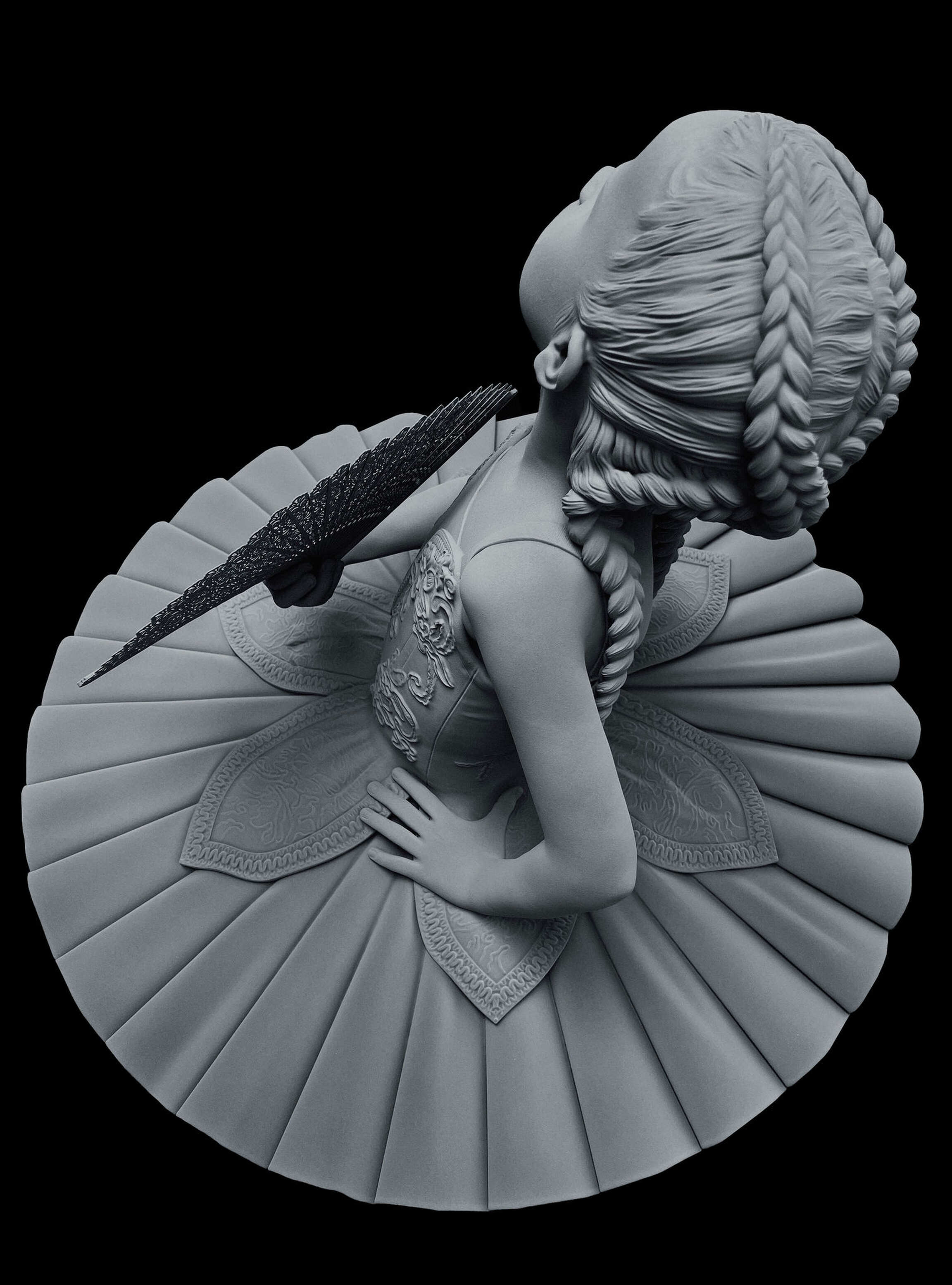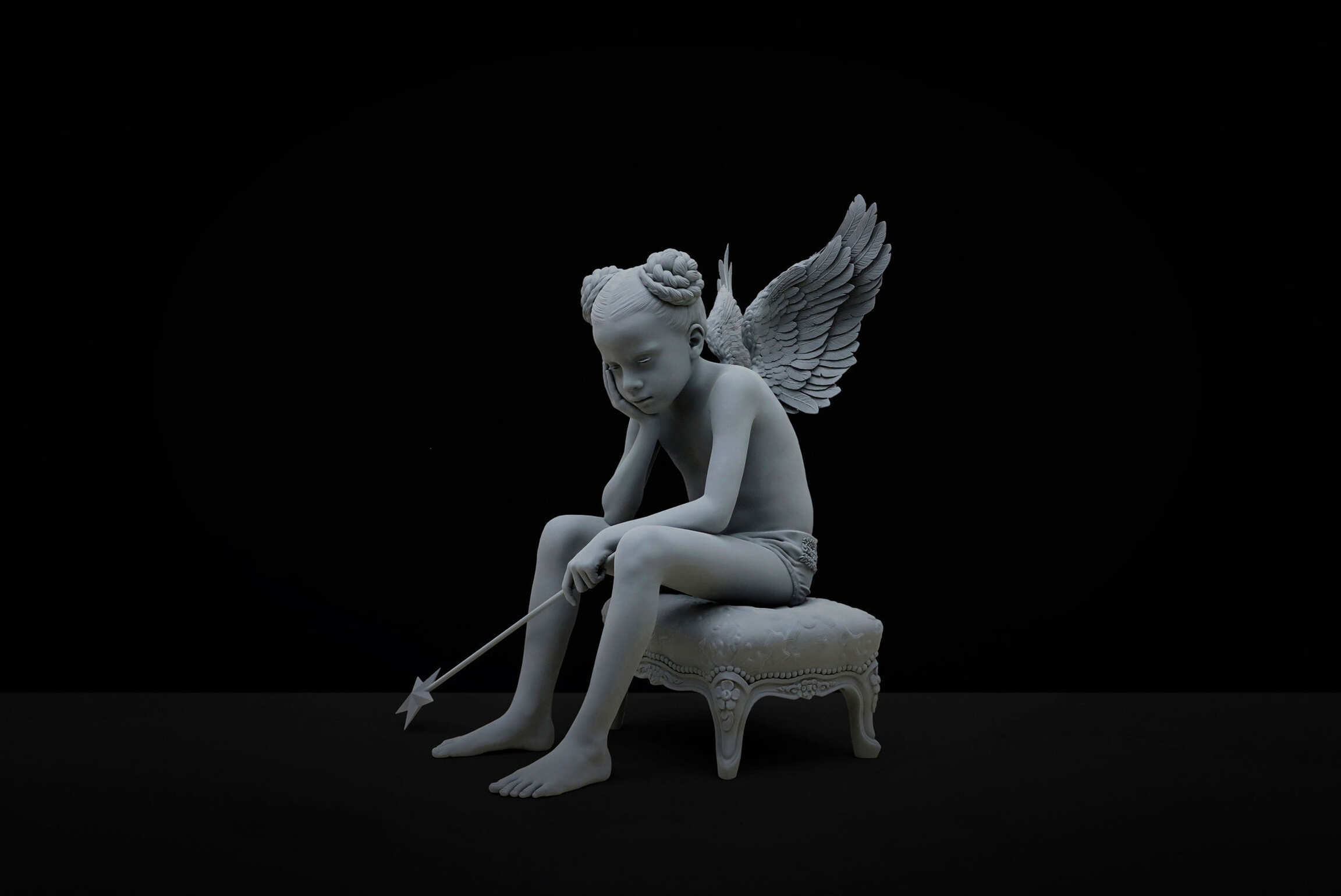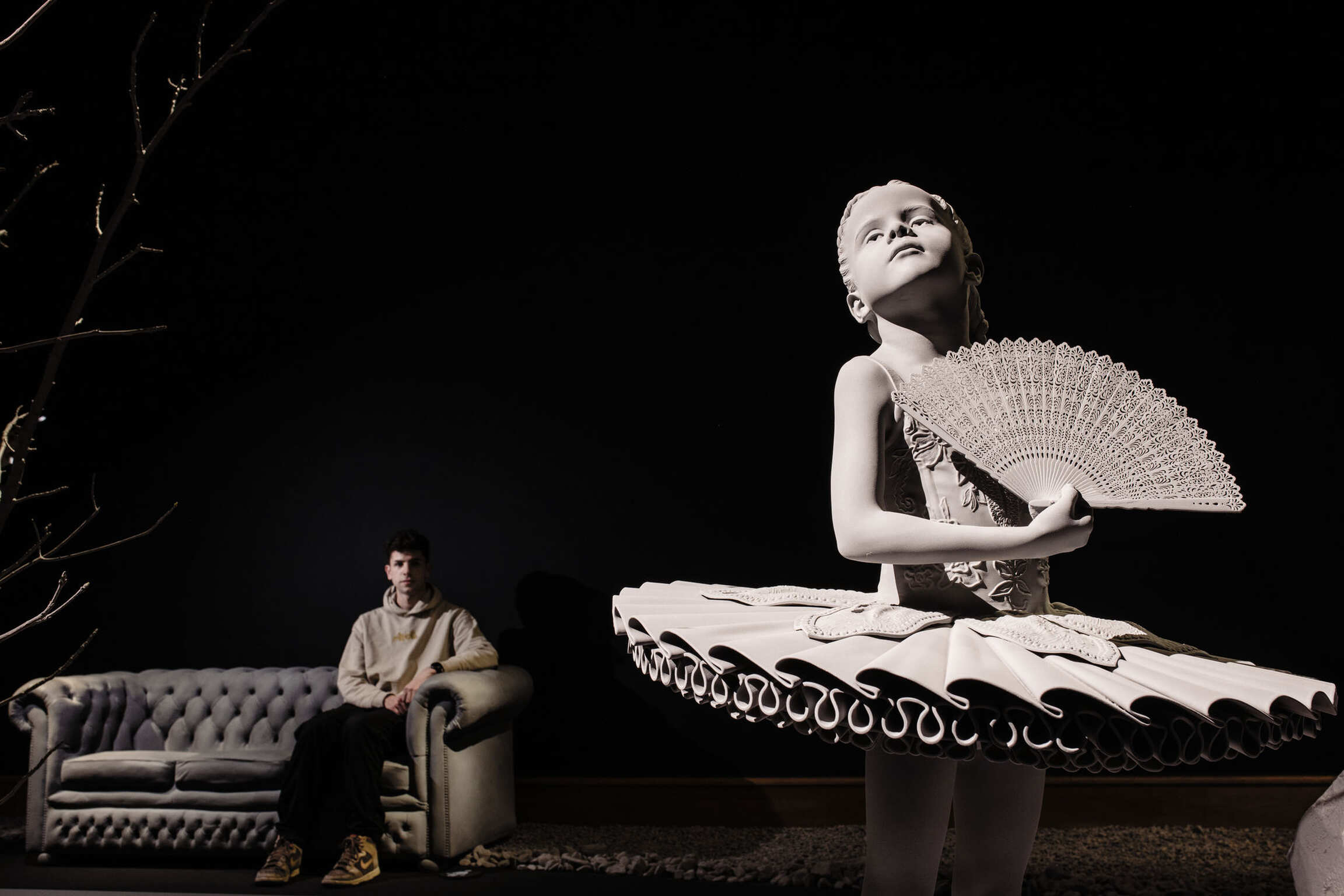 Van Gogh too saw the day tranquilized by the night, writing how he often thought “that the night is more alive and more richly colored than the day.”3 If the monochrome of Op de Beeck’s work is deserving of a richer palette, then the longer the darkness holds the more believable it becomes. If the world beyond the walls of the museum is sometimes ceaseless, it is the exhibition’s silence that becomes its reward, providing a kind of spiritual footing for the walkthrough. With Op de Beeck’s nocturnes of a girl with a beautifully plated pigtail in over-sized shoes and tutu, Zhai-Liza (mother’s shoes) (2024), Maurice (2024), of a boisterous boy with a collar, buckled shoes, and play sword, troubled angel with her wand and set of wings, Zhai-Liza (angel) (2024), and permanently bubble-blowing Tatiana (soap bubble) (2017), all, as with everything in the exhibition, are coated in a subdued grey that far from evoking decay or death, offers a bewitching beauty of life after the lights have gone out. Like anything in our past, memories and events, they come back to us in black and white, and Op de Beeck’s singular color carries that same sentiment of retrieving from reality its details, as the visual architecture of the exhibition. The surfaces of his sculptures appear petrified as if coated in dust. The internal becoming external, intimacy and childlike fantasy on display.