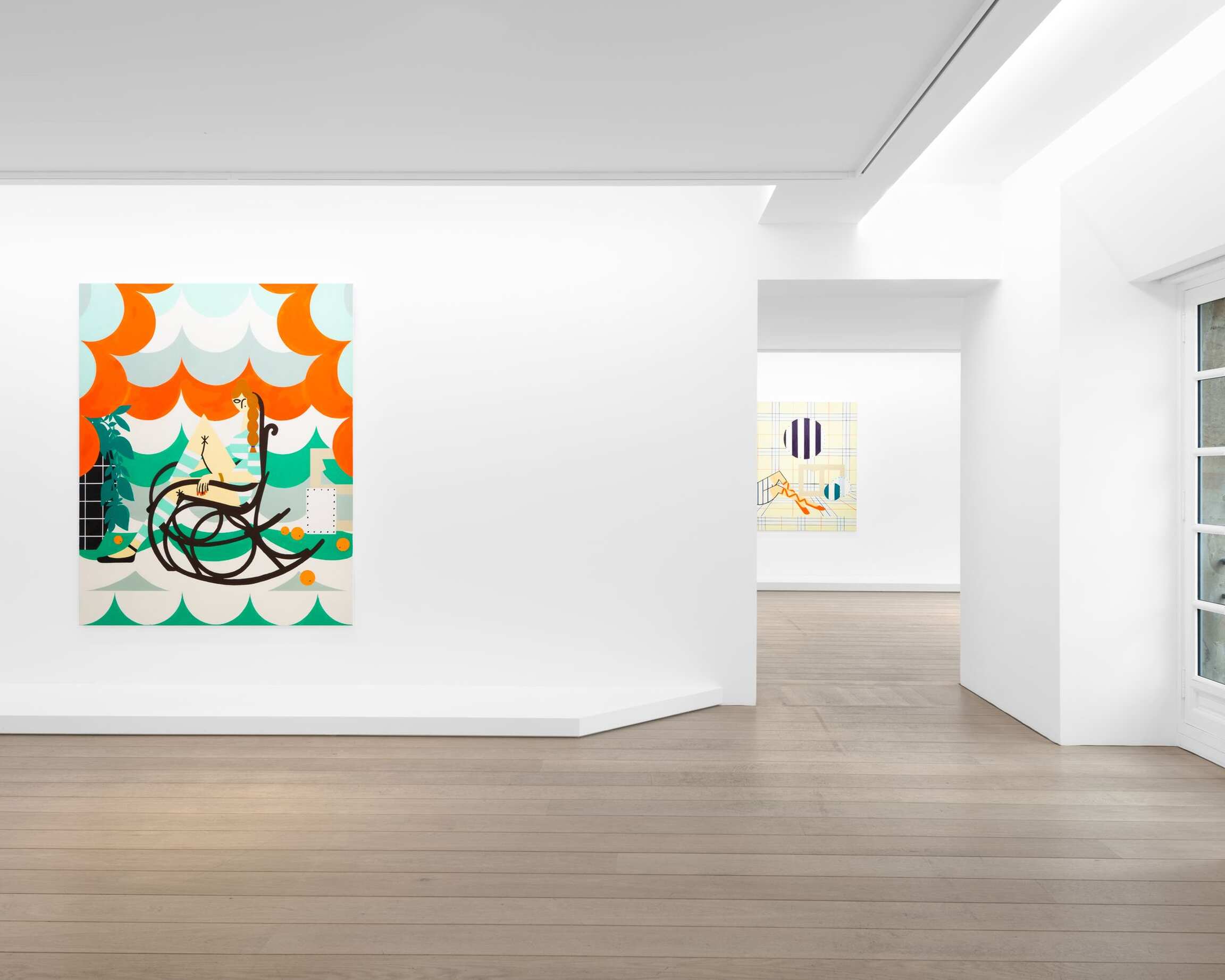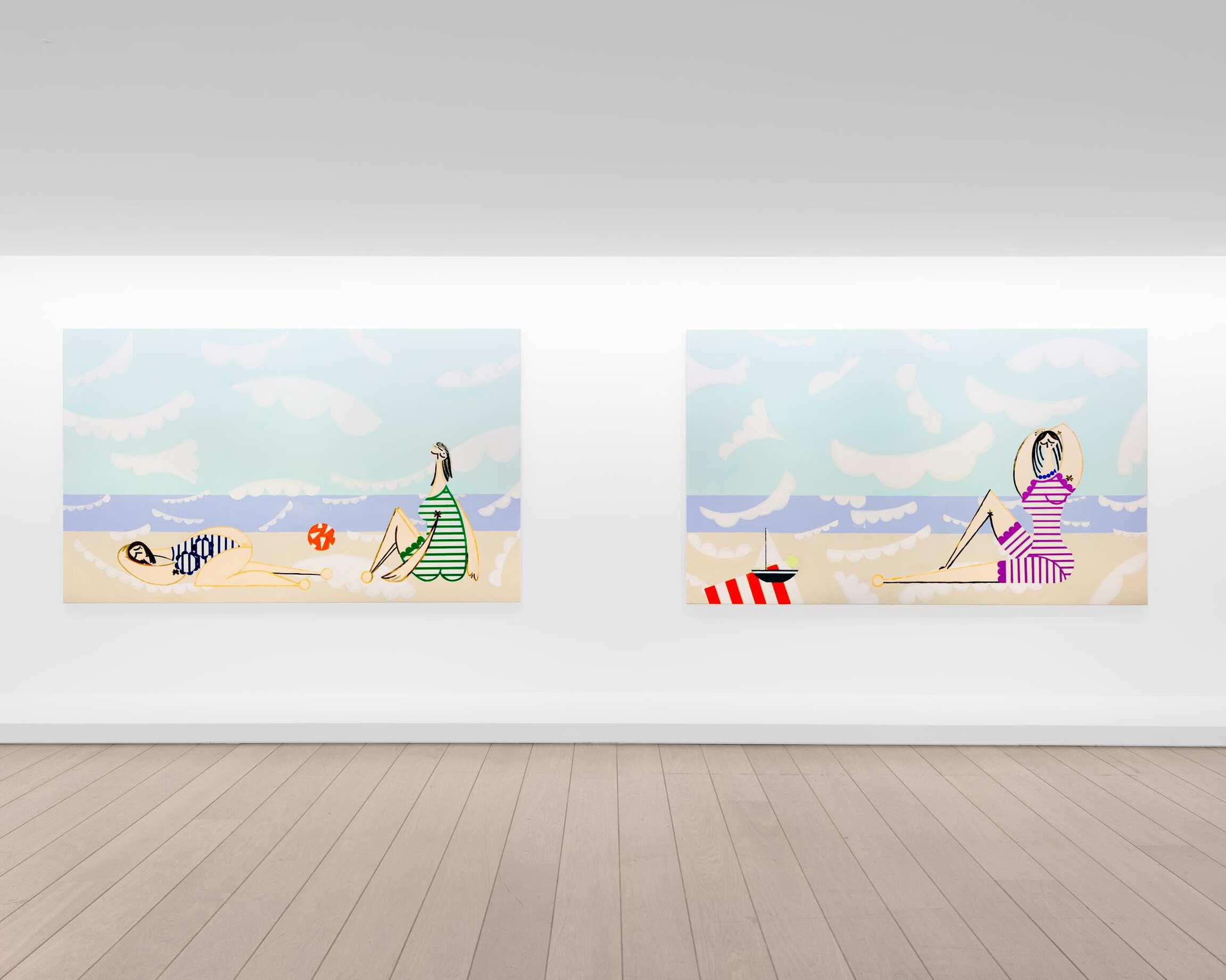It's also a way of maintaining an ambiguity: which of the two nudes is the main object of desire? Paradoxically, what looks at first glance to be the most Picassoesque part of the exhibition, the pair of Resting Bathers (2022) reflects a step back from sources, references, and quotations. The theme of bathers inspired many artists, including Picasso, of course. Although the title seems to indicate an intention to engage with Picasso's work, the true focus of attention in Atassi’s pair of paintings seems not to be the Spanish artist, but what is happening behind these women reclining on the beach. The background of both paintings is constructed of three horizontal blocks of color of blue, mauve, and beige, which refer to the colors of the sky, sea, and sand. Clouds with very graphically scalloped edges stand out on these three bands of color (which may make viewers think, for instance, of some of Sean Scully’s abstract landscapes), instead of appearing only on the sky as the rules of representation would dictate. Rather than a figurative dimension, these clouds express a specifically decorative dimension. And even if these ornamental clouds don’t quite dare cover Picasso’s bathers, they almost push them into the background—which is why they are resting and not playing ball. Instead of simply referring to the theme of bathers, which was so masterfully treated by Picasso, Atassi uses it as a springboard to create the tension that is at the heart of her poetic approach: constructing the space of representation and decorative logic. Atassi’s art, as on a rocking chair, seems to balance between these two.