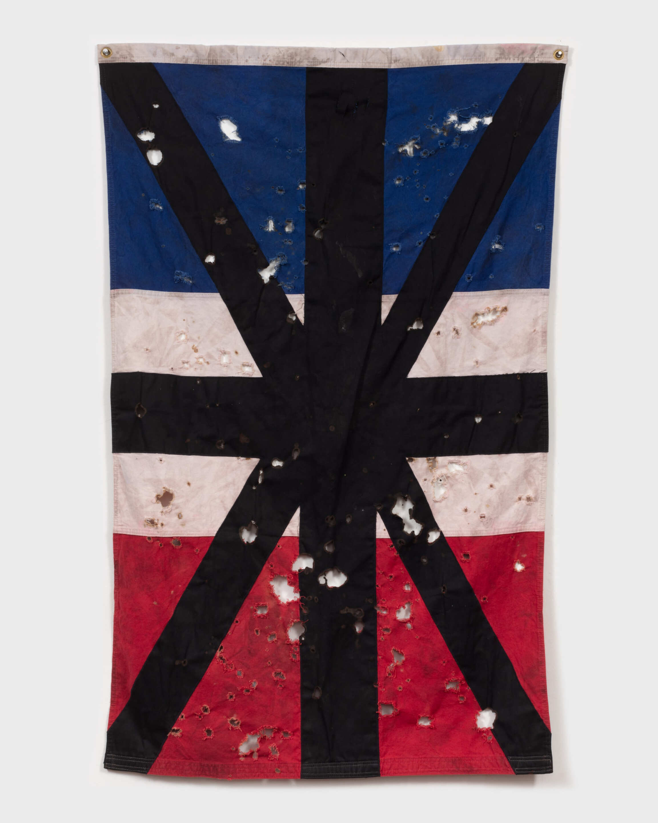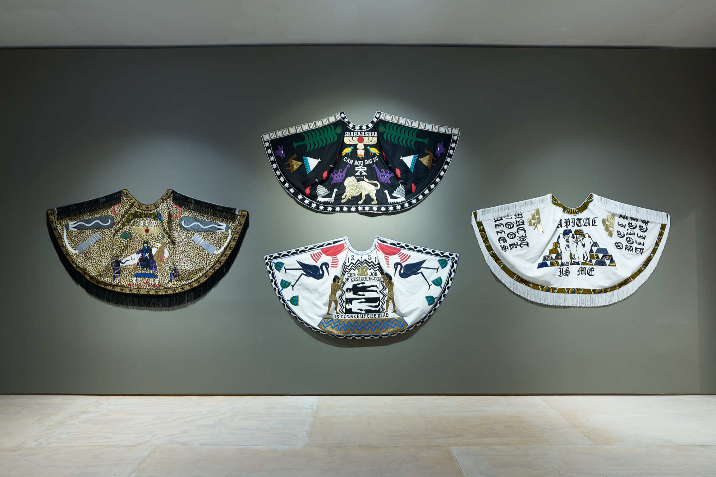 Traversing the exhibition feels akin to reading a comic book, where visuals accompany a story in an almost cinematic way. While Rashid’s paintings line the walls, sculptural objects—including but not limited to flags, quilted armor, and a jumbotron that crash lands from outer space—fill up the rooms, creating visual context and further bringing the storyline into a realistic sphere.