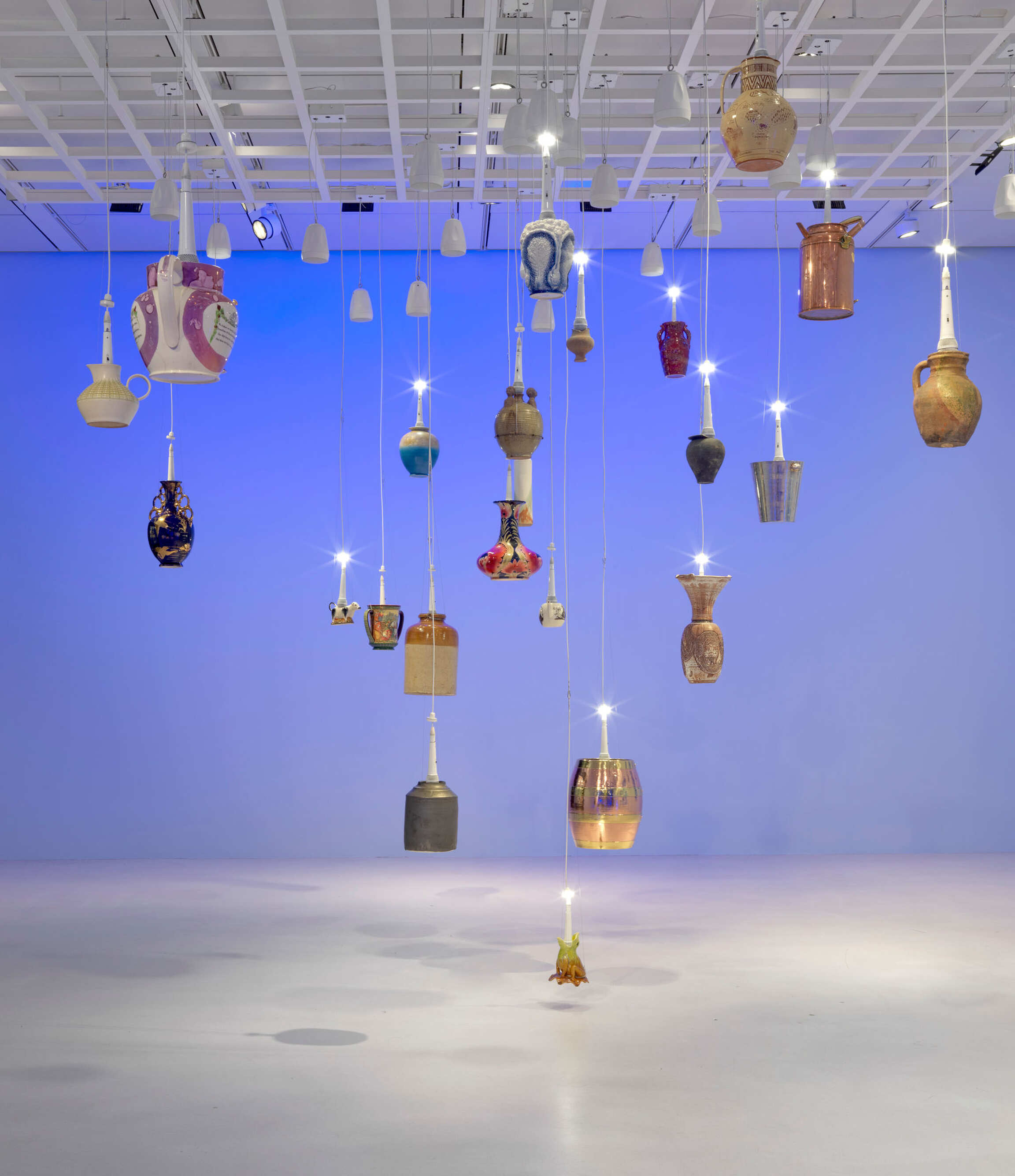 It’s that wall of ancient things—a copper and enamel brooch, a single leather sandal, a silver coin, a cup—that echoes with Oliver Beer’s installation at Bloomberg Space, ‘Albion Waves’. In the main exhibition gallery, a floor above the ancient temple, Beer hung twenty-eight vessels from the ceiling. They’re not ancient—well, two of them are second-century vases, but the rest include an ice bucket from the Savoy Hotel in London, a cow-shaped cream jug, and a Victorian frog vase. Together, these objects tell a material history of Britain, but they also become musical instruments. Each of these objects hosts a microphone fitted with motion detectors, so that when viewers move under and between these suspended vessels, they activate the sound installation, essentially playing the artwork like an instrument. The sound is echoey—like listening to a seashell, or running a wet finger along the rim of a wine glass, Beer describes in the exhibition’s press release, and adds: “Every vessel that’s ever been made in the history of object making is also constantly quietly resonating its own unchanging musical note, determined by its form.”